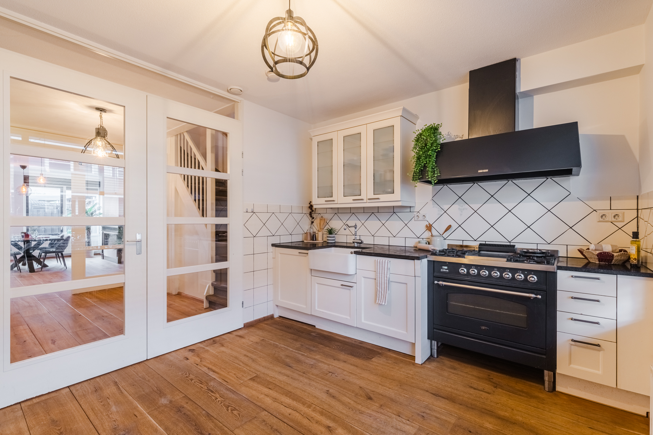 Via fraaie en-suite deuren bereik je de royale keukenruimte aan de voorzijde van de woning. De keuken is opgesteld in een parallelopstelling en uitgevoerd in een landelijke stijl.