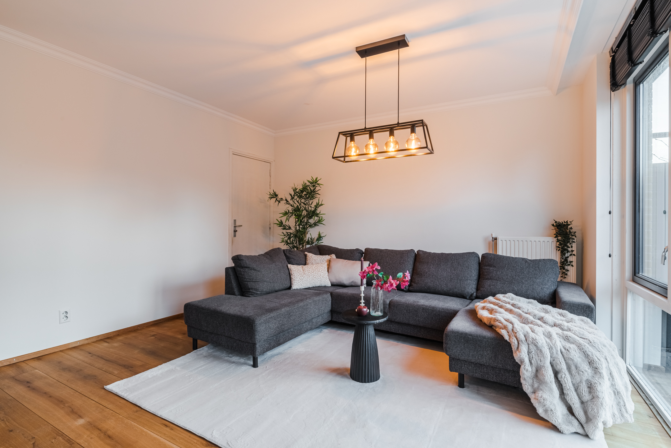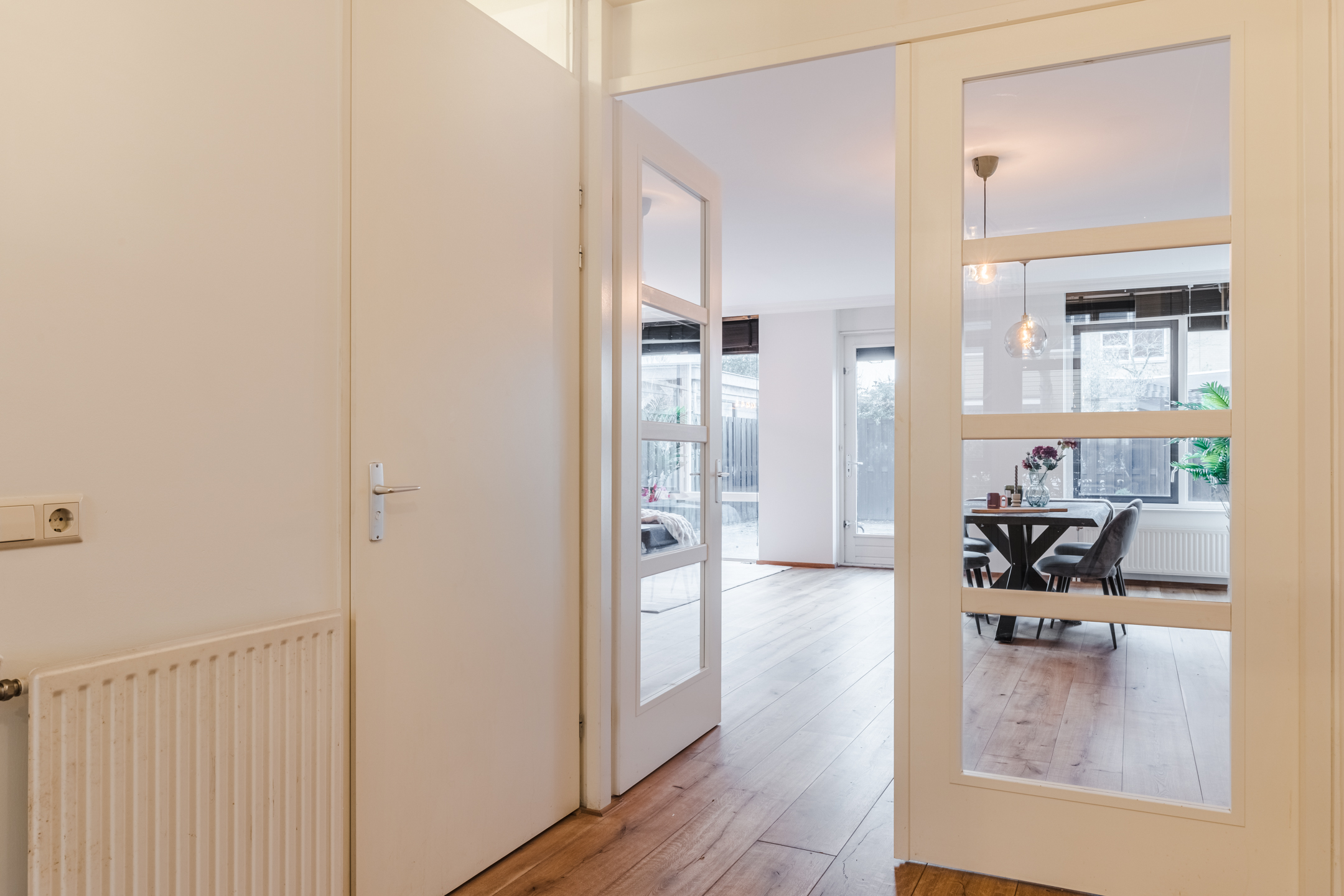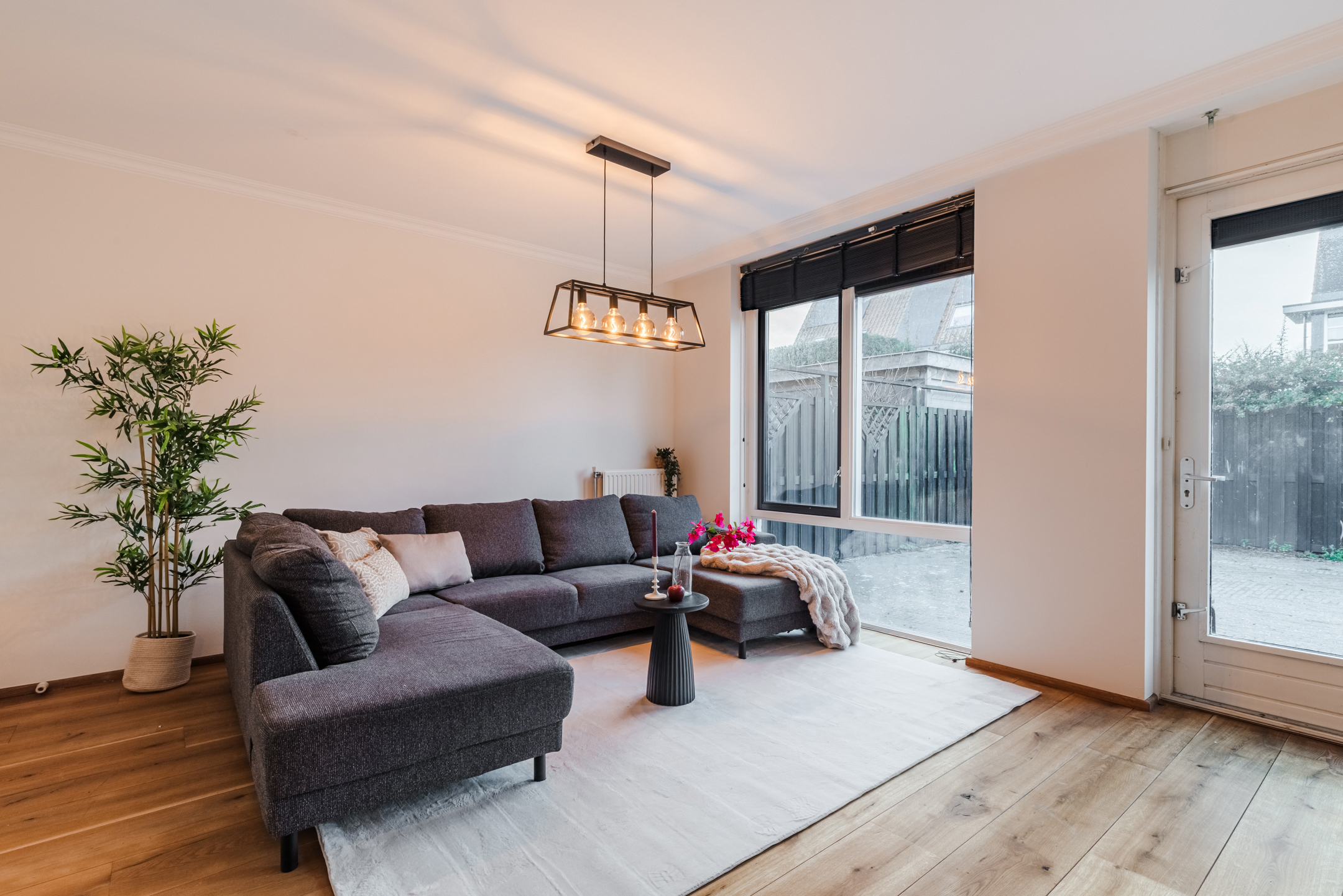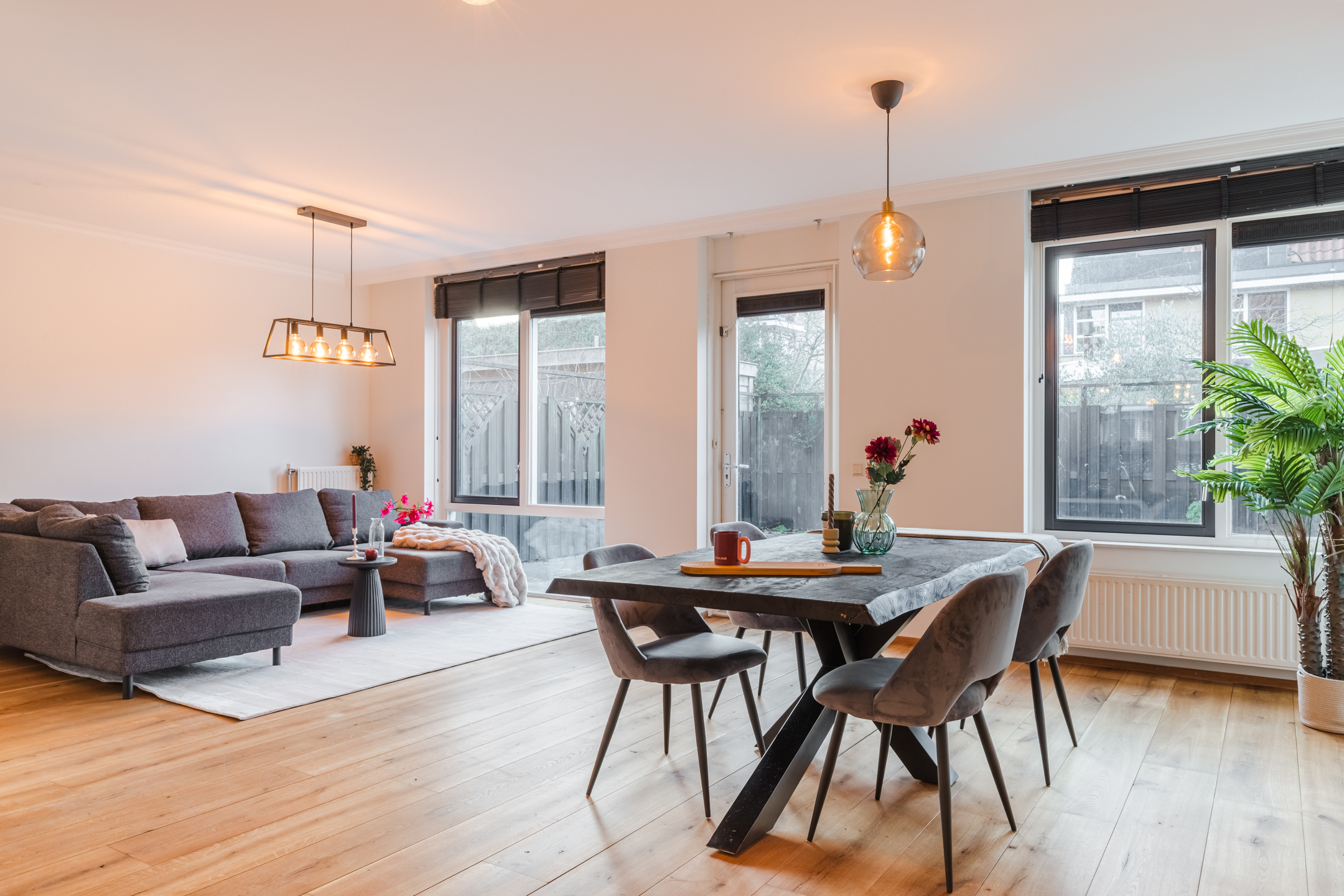 De ruime woonkamer bevindt zich aan de achterzijde van de woning en beschikt over veel raampartijen, waardoor het daglicht rijkelijk binnenvalt. Er is volop ruimte voor een gezellige zit- en eethoek.