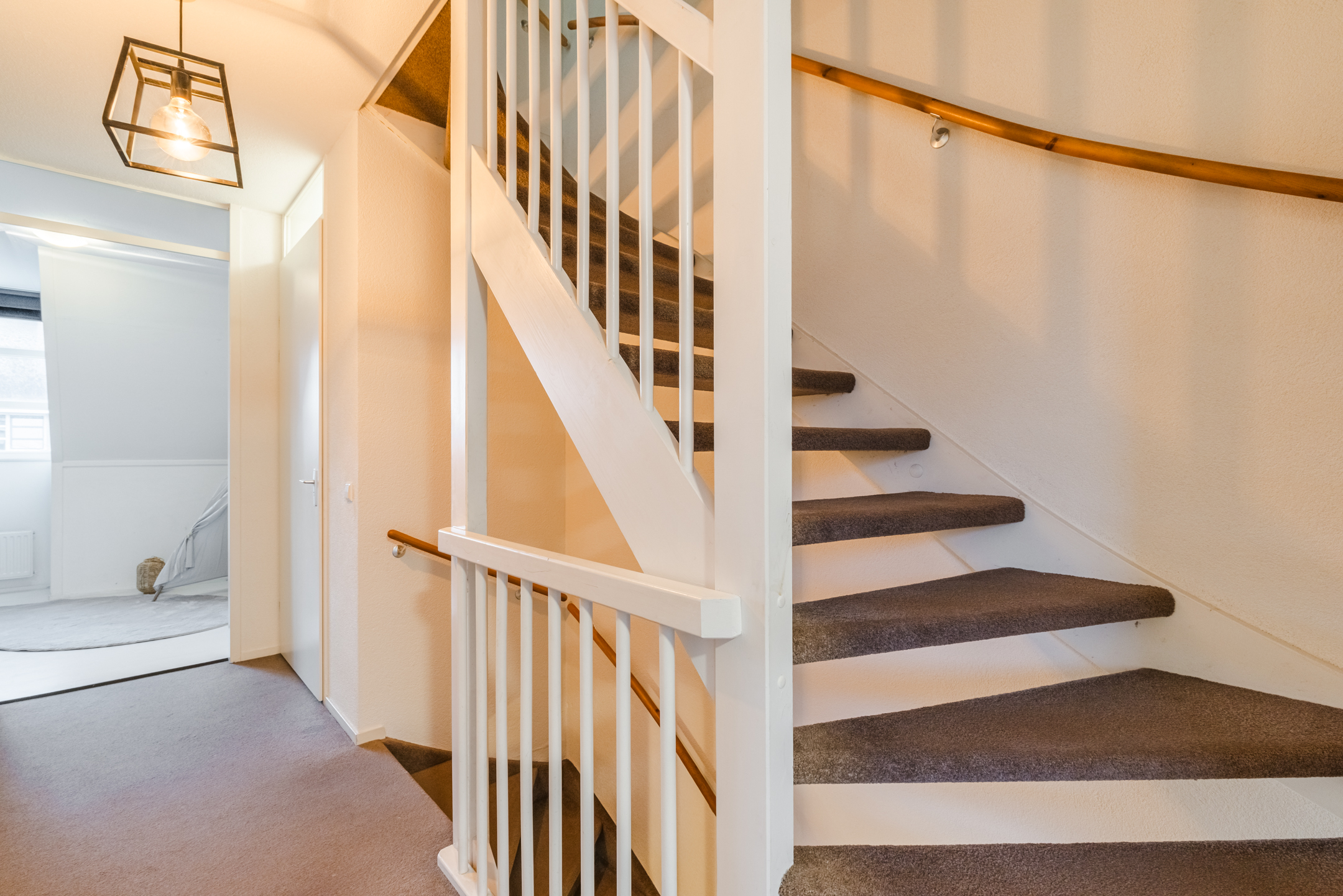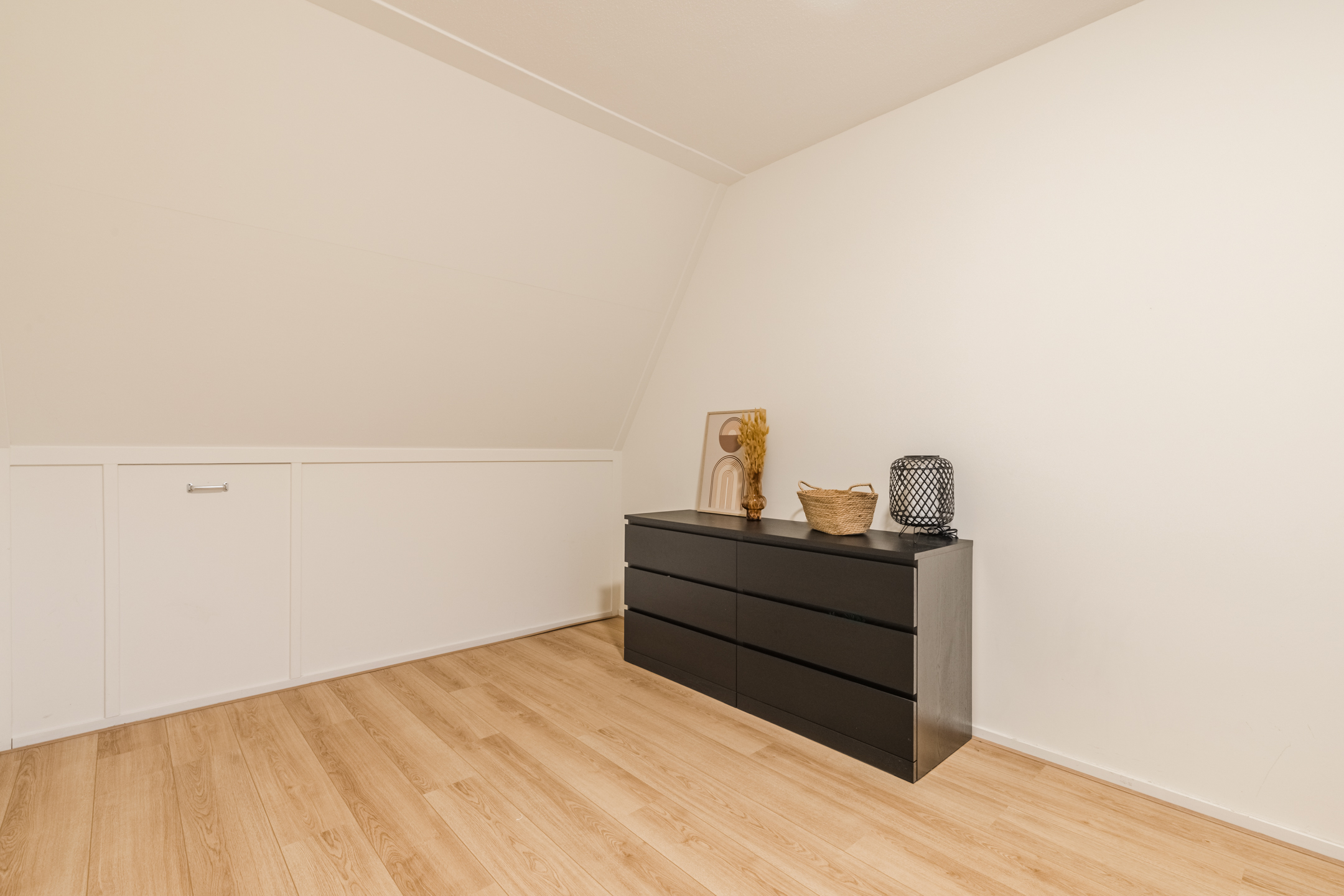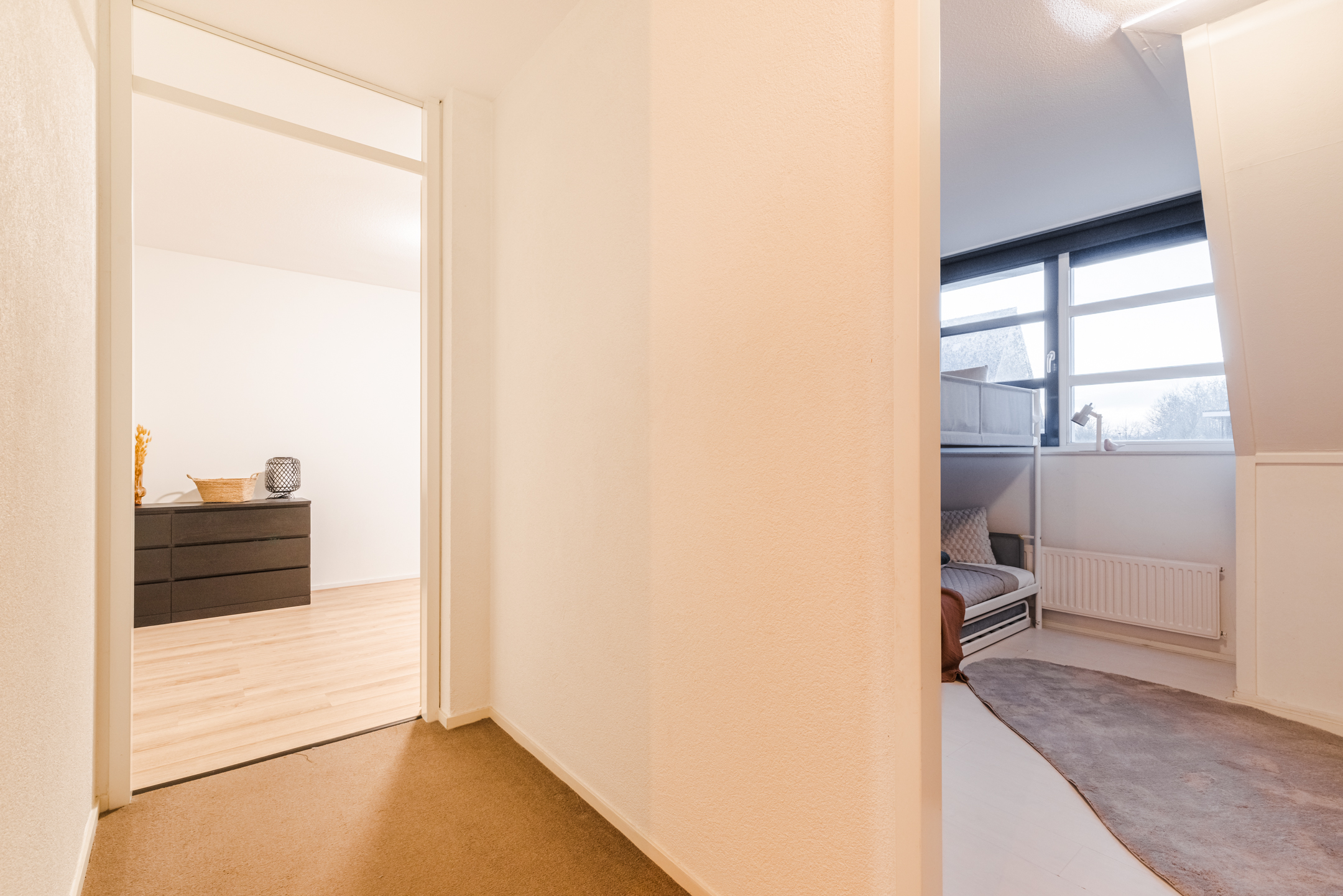 De verdieping is afgewerkt met een combinatie van een laminaatvloer, tapijtvloer en een nette wand- en plafondafwerking.