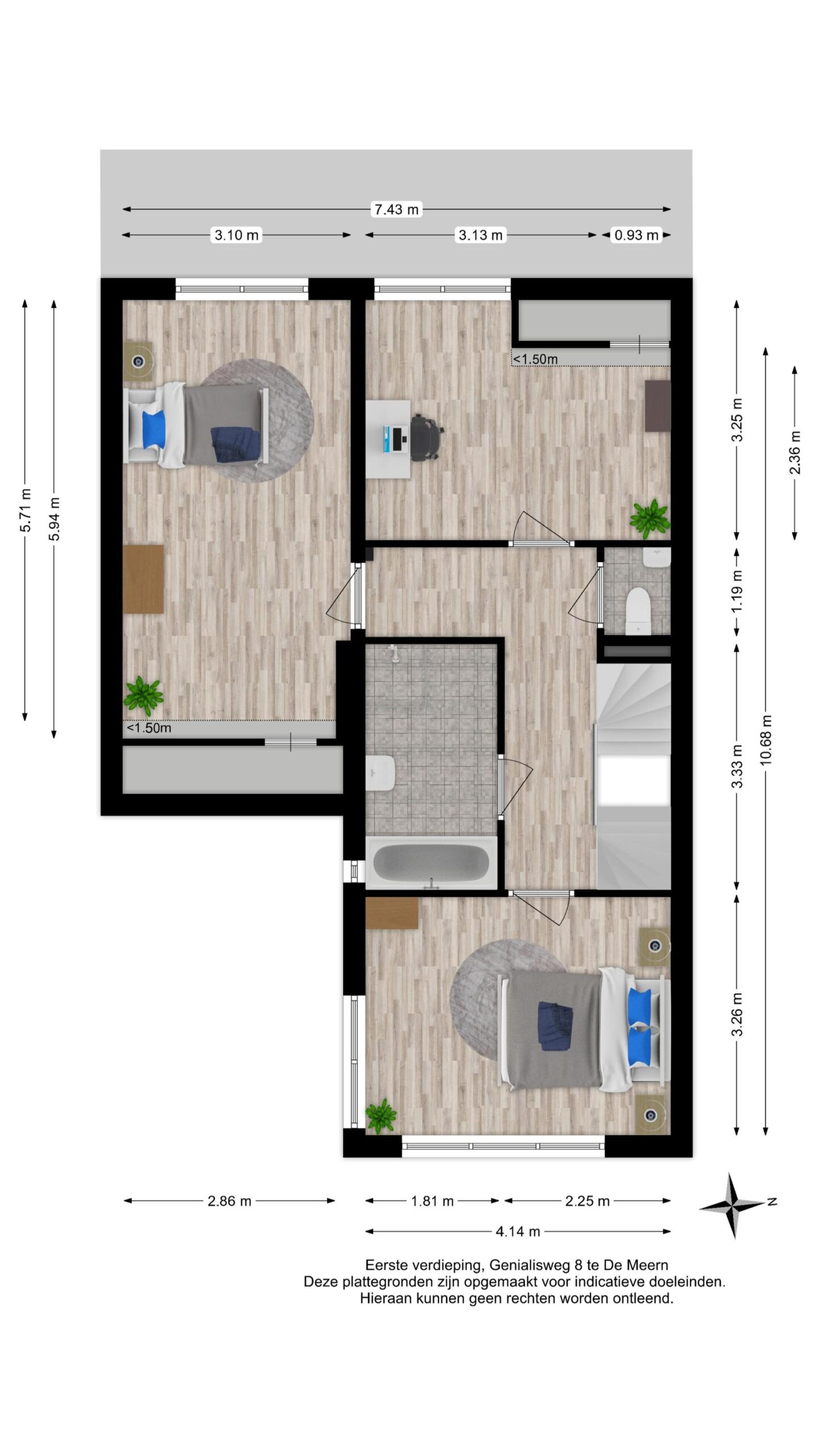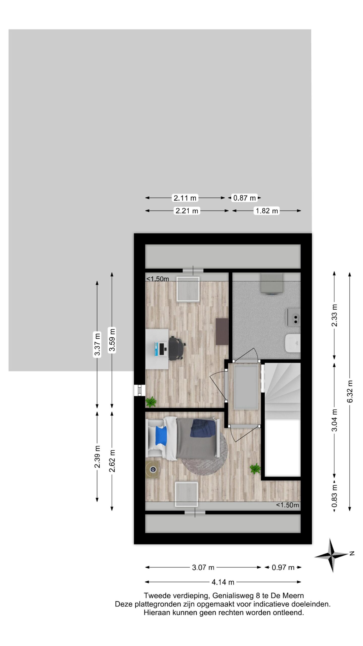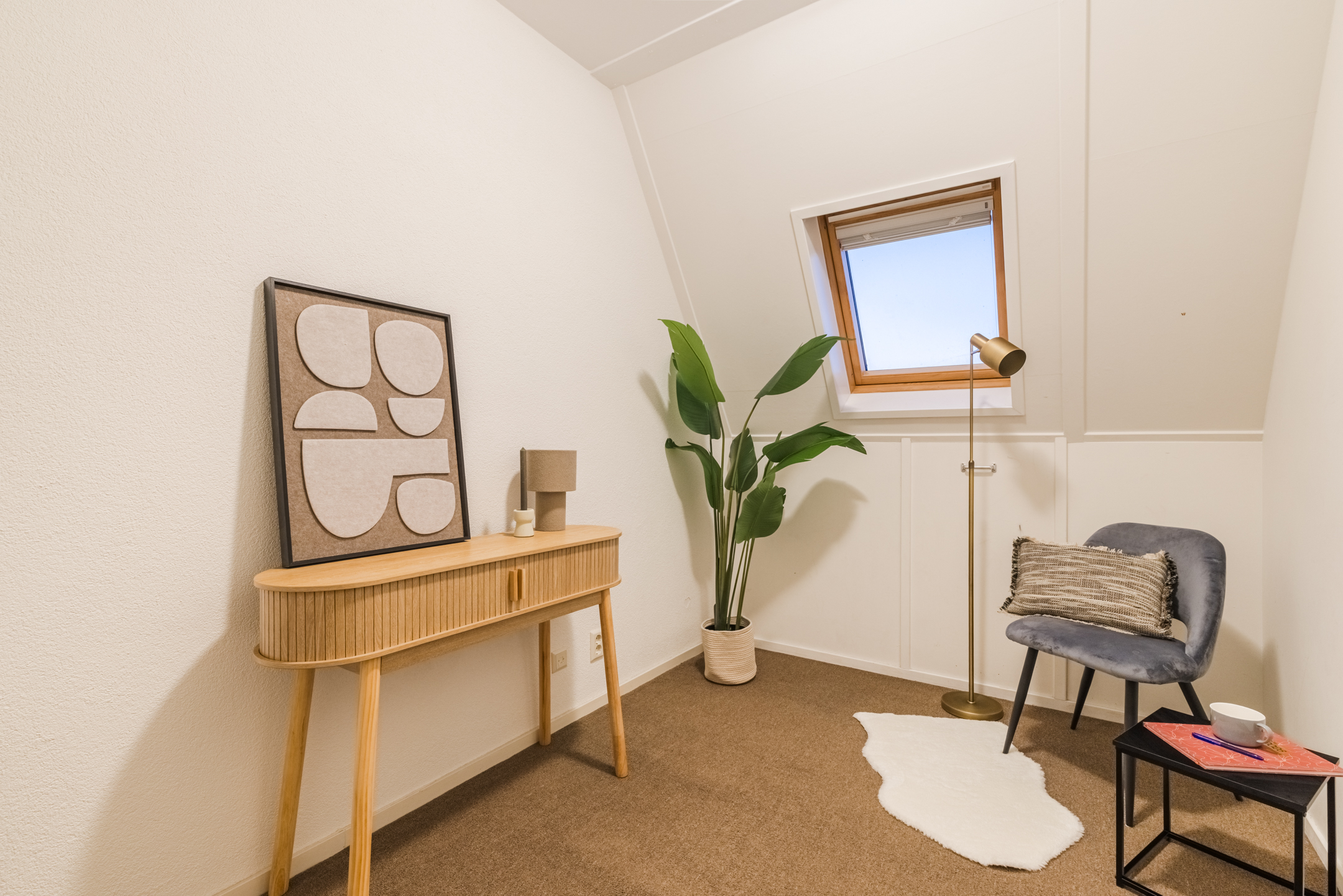 De verdieping is afgewerkt met een combinatie van een laminaatvloer, tapijtvloer en een nette wand- en plafondafwerking.