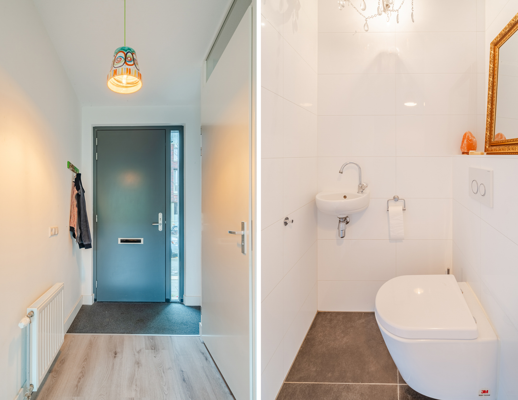 Entree, een ruime lichte hal met meterkast, toiletruimte voorzien van hangend toilet en fontein, trapopgang naar de eerste verdieping, toegang tot de woonkamer en de keuken.