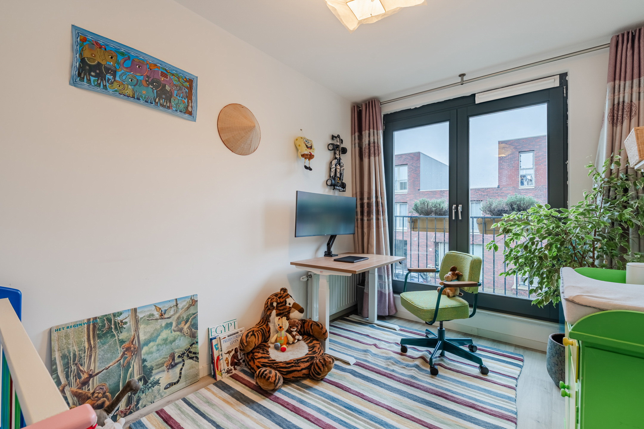 Aan de voorzijde van de woning bevinden zich de tweede multifunctionele (slaap)kamer en de badkamer. Deze slaapkamer is van een prima formaat (ca. 10 m2) en beschikt over een Frans balkon.