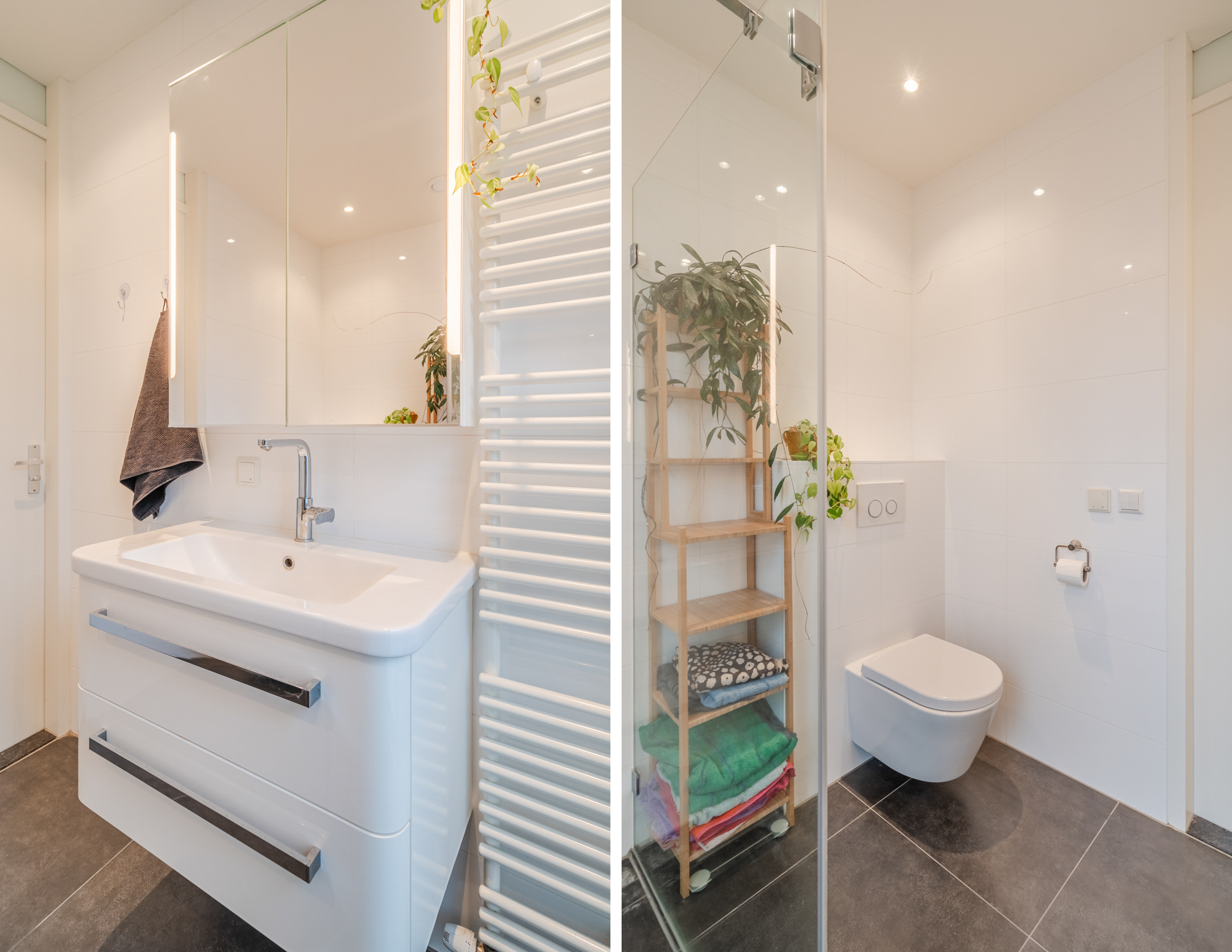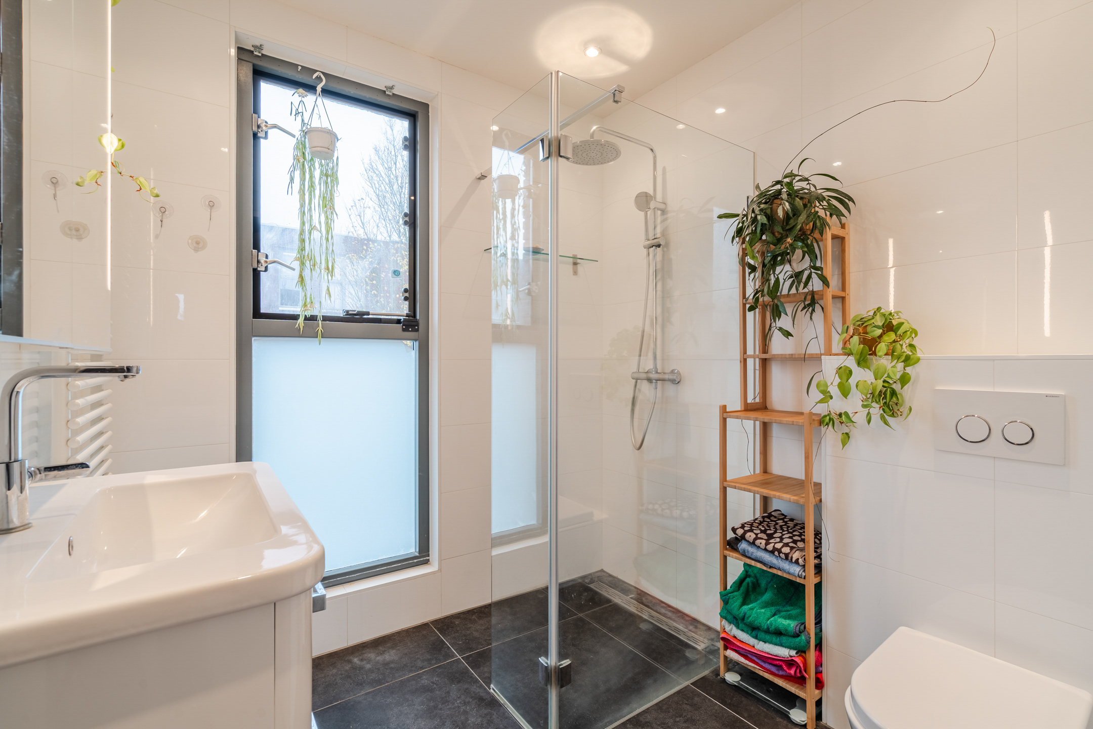 De verzorgde badkamer is geheel betegeld in een tijdloze wit-/ grijze betegeling en uitgerust met een inloopdouche, een tweede toilet, een designradiator en wastafel met meubel. Dankzij het raam kan de ruimte goed worden geventileerd en komt er voldoende daglicht naar binnen.
