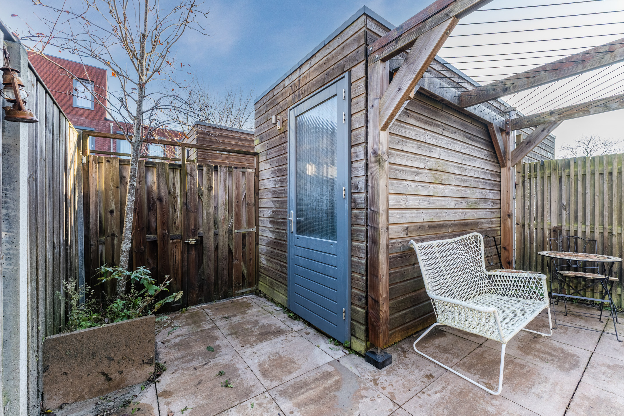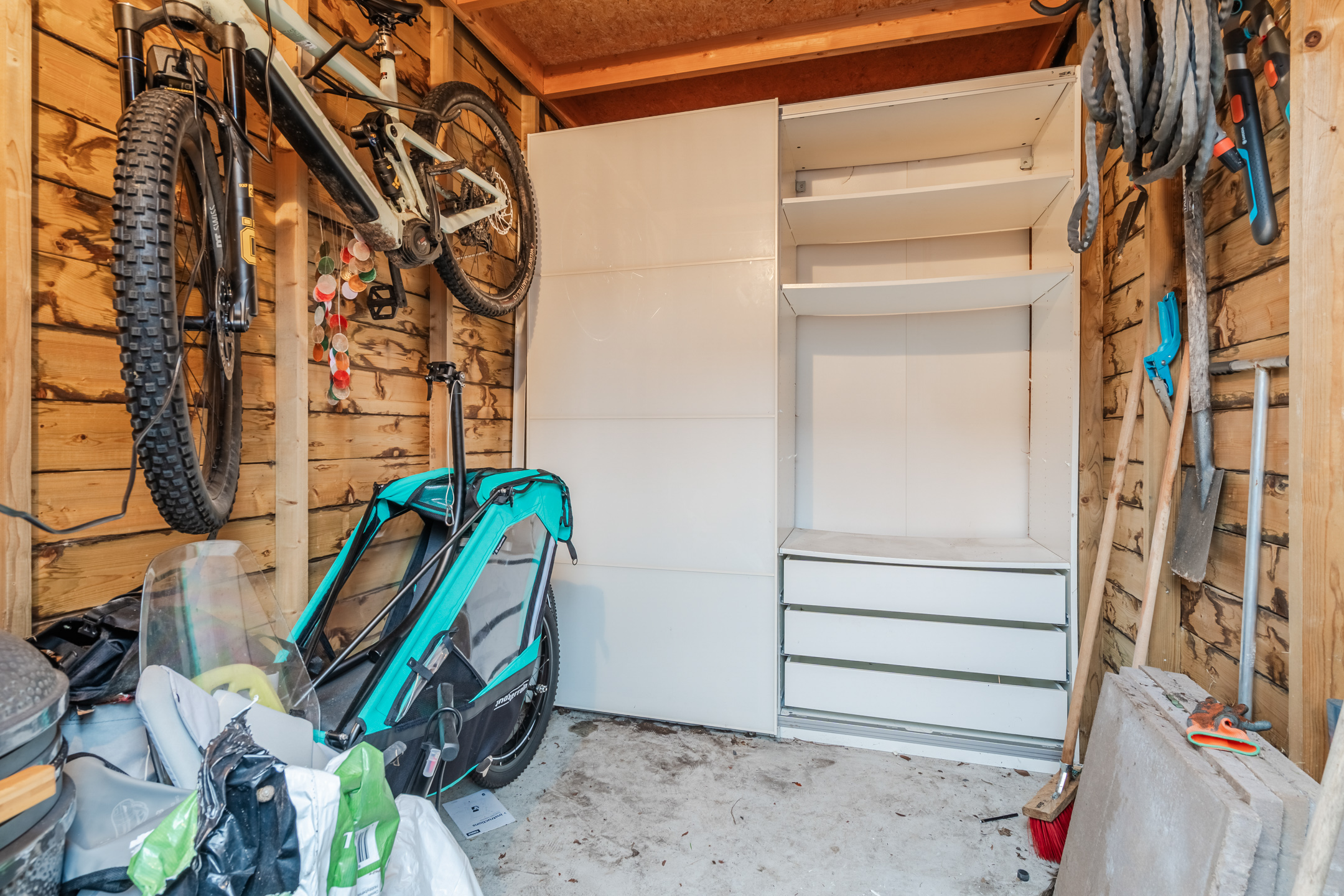 De tuin beschikt over een tweetal terrassen, een gazon, een houten erfafscheiding, diverse plantenborders, een vrijstaande houten berging v.v. elektra en een achterom. Handig voor het parkeren van de fietsen in de berging.