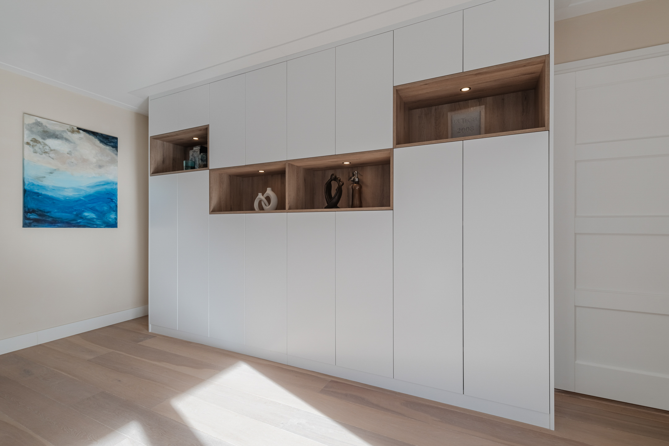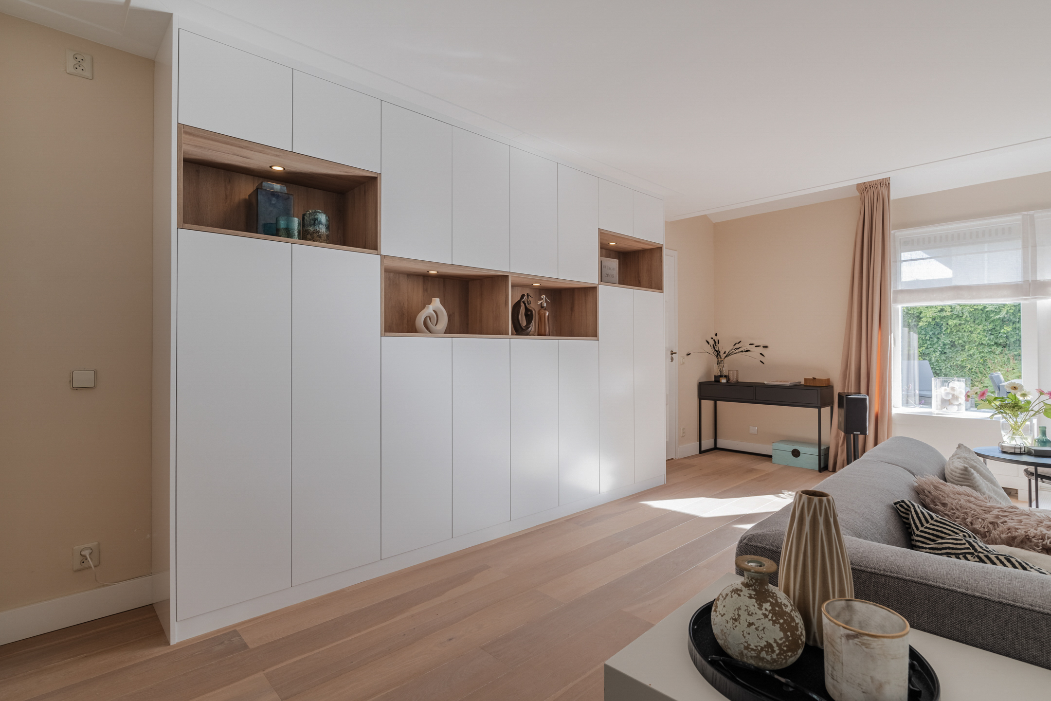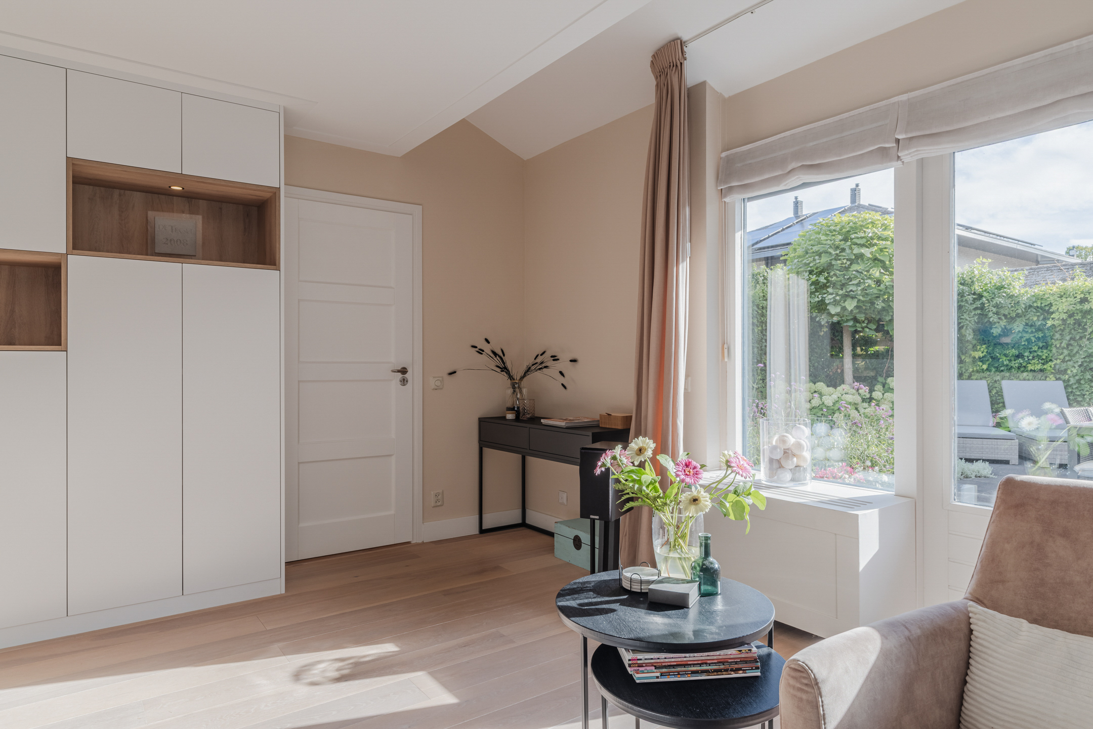 De royale overstek zorgt voor een uitnodigende, overdekte entree die zowel stijlvol als praktisch is. Vervolgens tref je de ruime en lichte entree met garderobe, moderne toiletruimte met hangend toilet en fontein (2018), meterkast en door het zijraam is er natuurlijke lichtinval en zicht op de eigen oprit. De lichte, tuingerichte en uitgebouwde woonkamer is ruim door de prettige breedte maat van de woning (ca. 9 m). De eikenhouten vloer met de strakke wand- en plafondafwerking uitgevoerd in een smaakvol kleurenpalet vormt een fijne basis voor ieder interieur. De wanden en het plafond van de woonkamer zijn in 2024 geschilderd toen de huidige eigenaren de prachtige inbouwkast hebben laten plaatsen. Vanuit de woonkamer is de werkruimte en de groene tuin op het zuidoosten te bereiken.