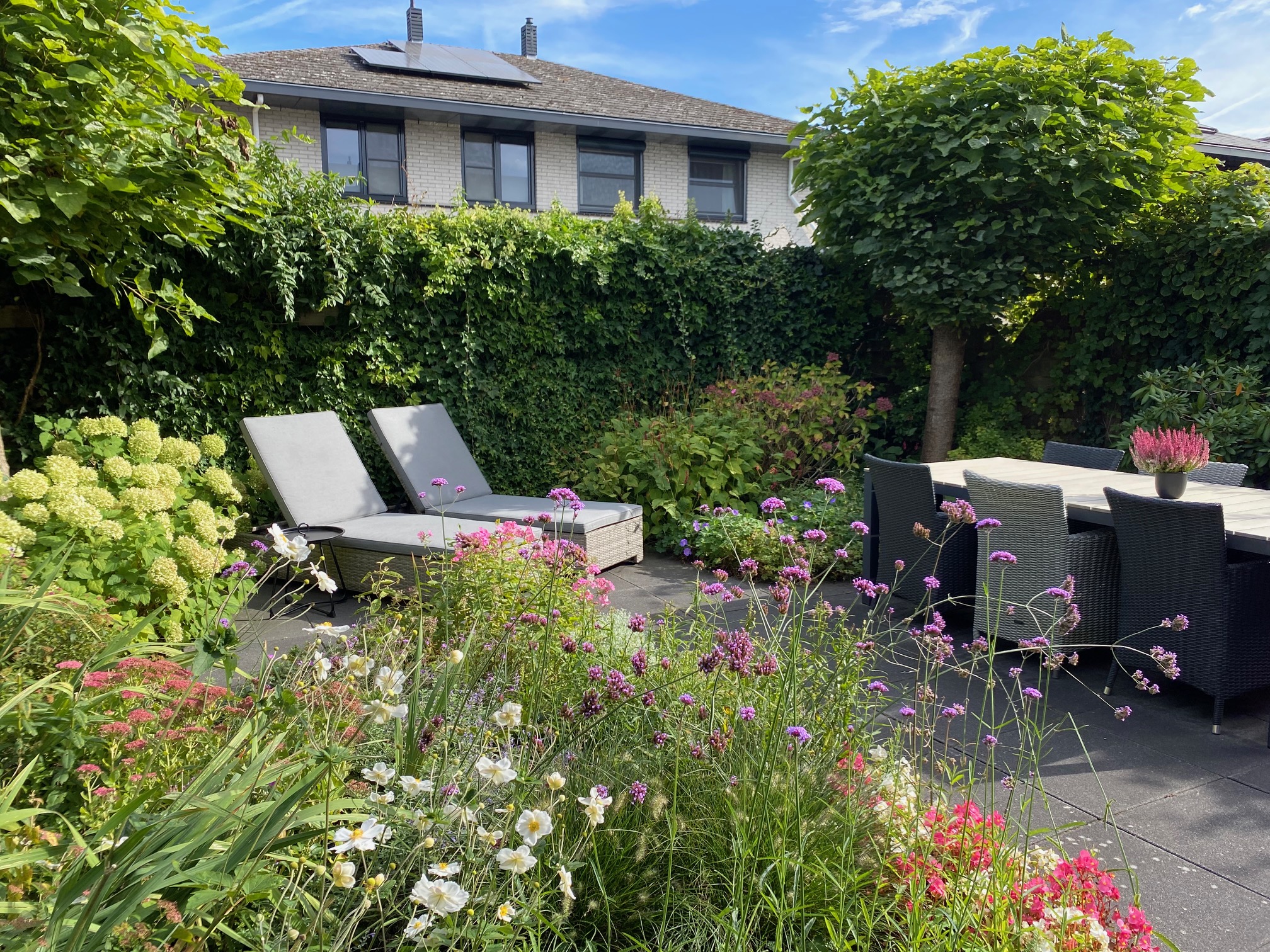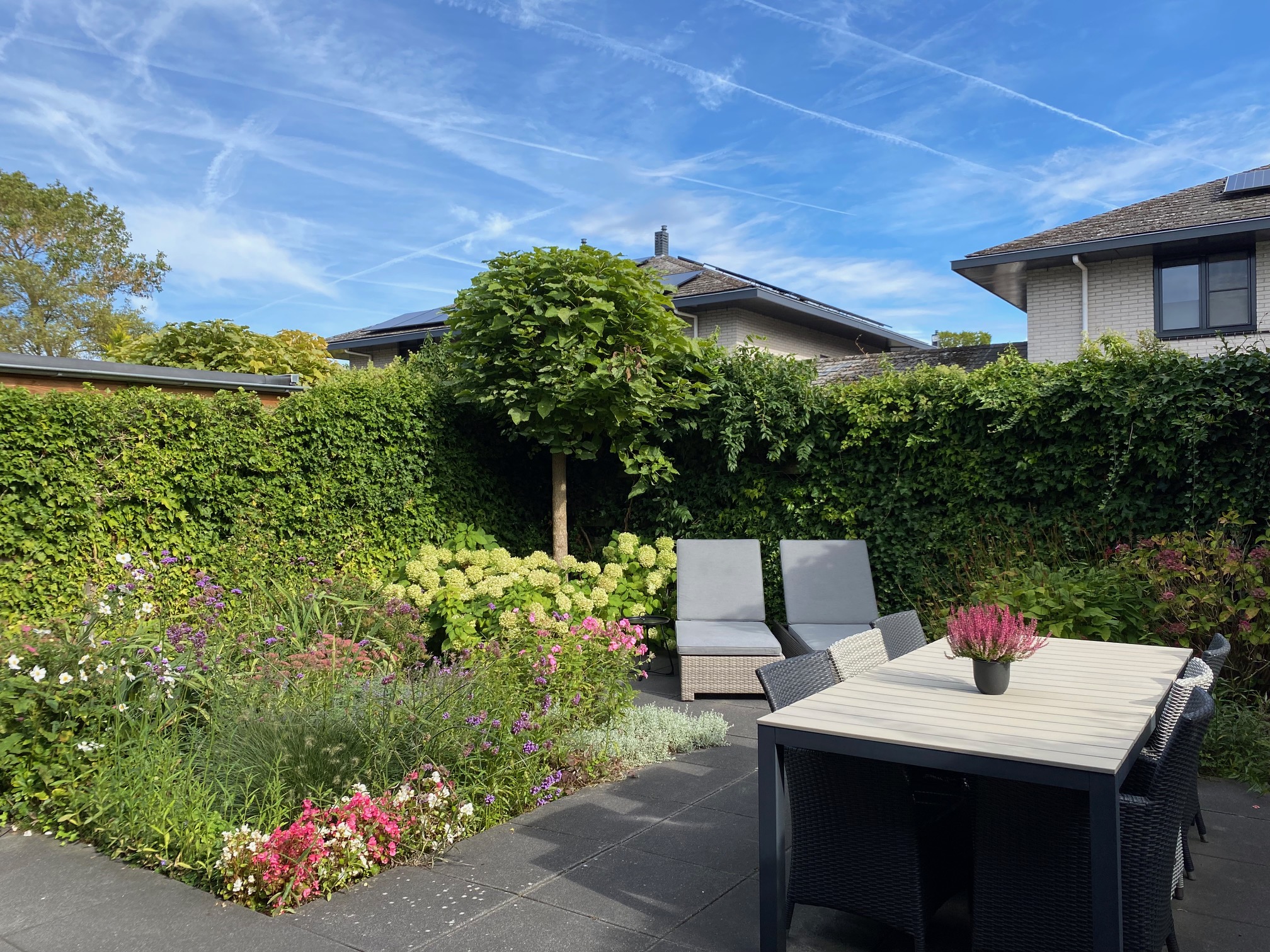 De tuin is door alle seizoenen heen heerlijk groen en keurig onderhouden. De tuin biedt meerdere fraaie terrassen waarbij je de gehele dag in de zon dan wel in de schaduw kunt zitten. De ligging op het zuidoosten is eigenlijk perfect, hierdoor valt de zon in de ochtend heerlijk de woonkamer binnen. De borders zijn kleurrijk aangelegd en zo is er van het voorjaar tot aan het najaar kleur te vinden in deze prettige achtertuin.