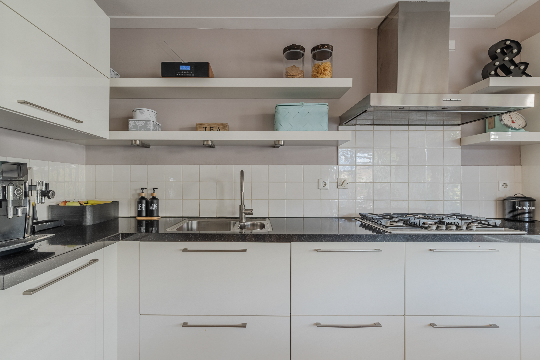 Aan de voorzijde van de woning tref je de open en complete woonkeuken voorzien van sfeervolle shutters. Deze woonkeuken is georiënteerd op het westen waardoor hier aan het einde van de dag de zon heerlijk naar binnen valt terwijl jij samen met vrienden en/of familie aan het tafelen bent. De keuken is in een L-opstelling geplaatst en uitgerust met alle wenselijke inbouwapparatuur van o.a. Siemens. Er is een oven, magnetron, 5-pits gasfornuis met afzuiger, grote koelkast, vriezer en vaatwasser. De keuken is uitgevoerd in een toegankelijke kleurstelling; witte fronten in combinatie met een stijlvol diep zwart stenenblad.