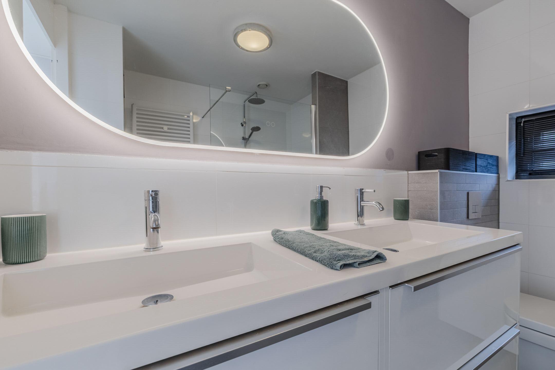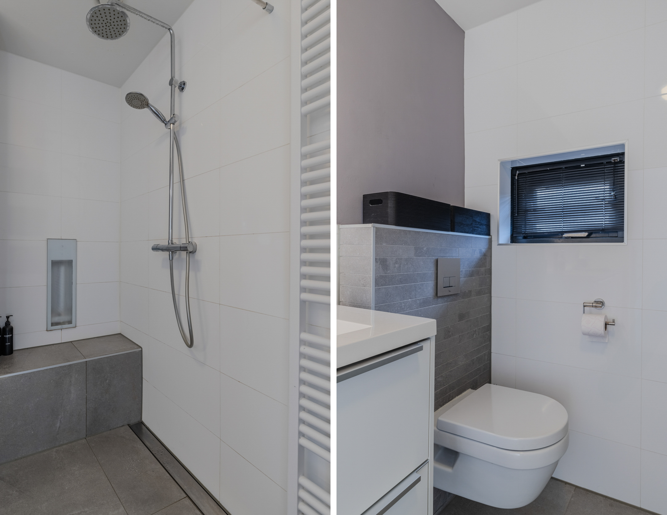De moderne en complete badkamer, geheel verbouwd in 2014, is voorzien van een grote inloopdouche (ca. 2,49 x 2,21m) mét zitbank en Sunshower (heerlijk na een koude winterdag, aldus de verkoper), een dubbele wastafel, een hangend toilet en een raam ten behoeve van daglicht en ventilatie. De badkamer is uitgevoerd in een moderne kleurstelling met grijstinten, trendy ovale verwarmde spiegel met verlichting én een uiterst praktische maar bovenal stijlvolle nis voor het opbergen van handdoeken, shampoo’s etc.