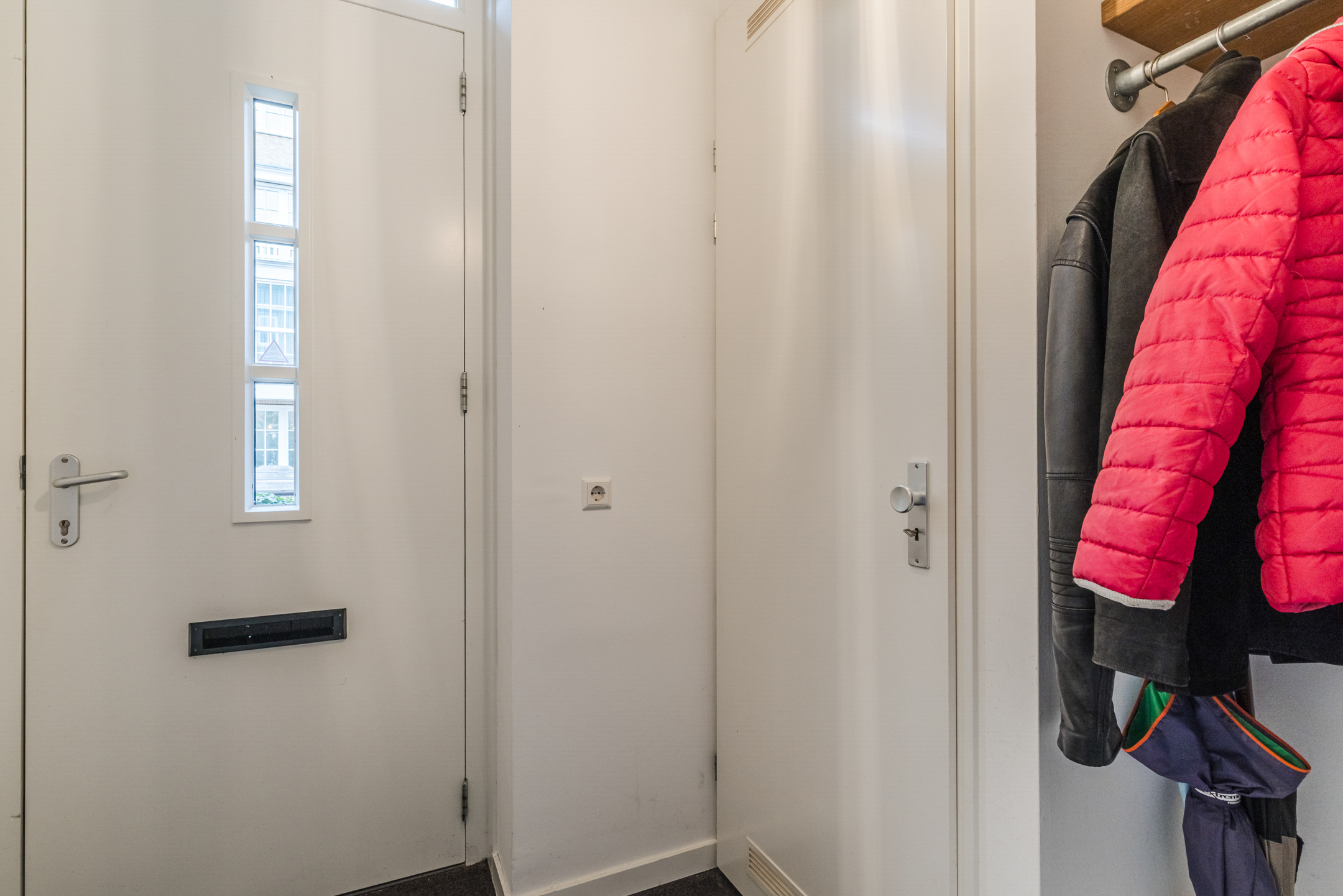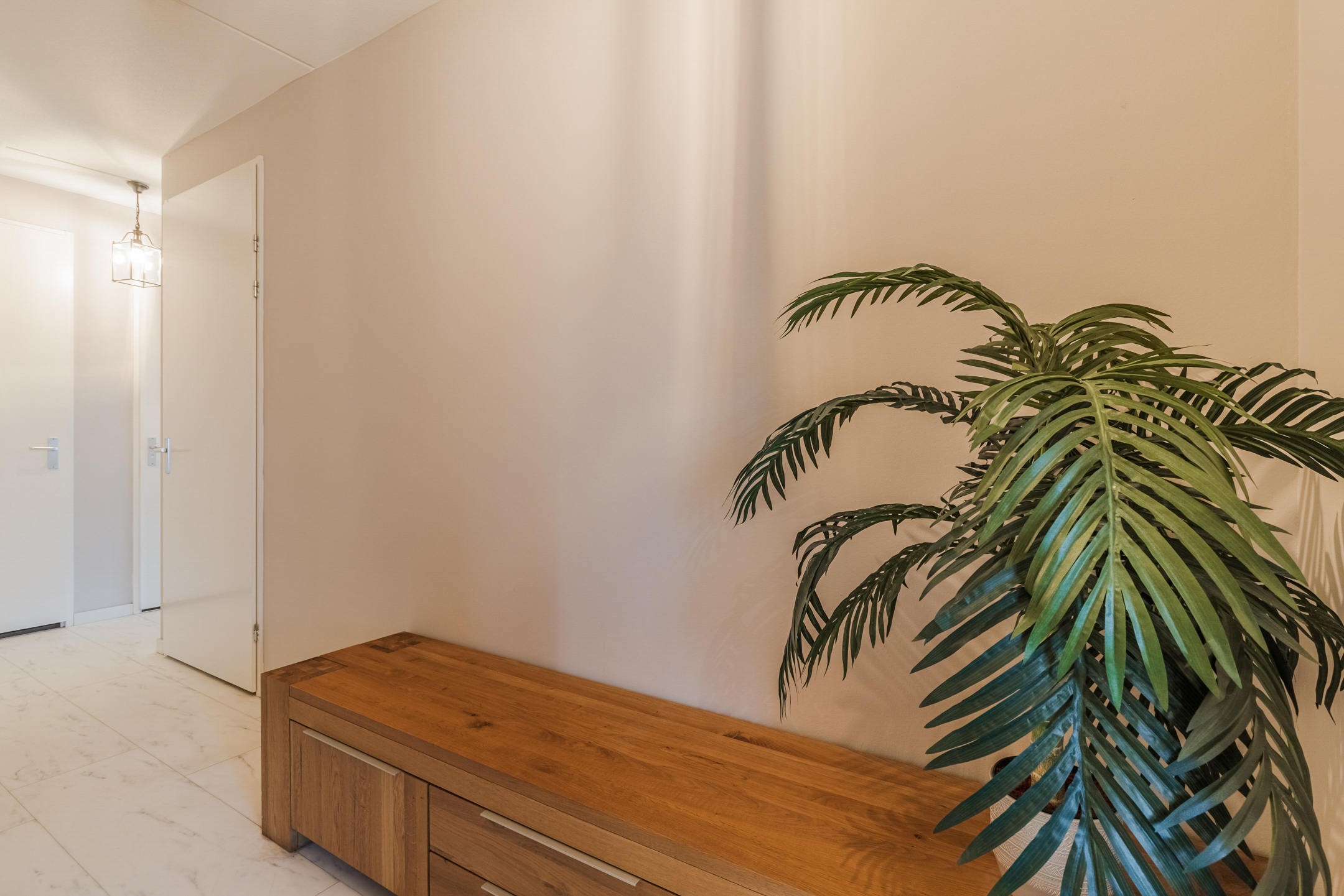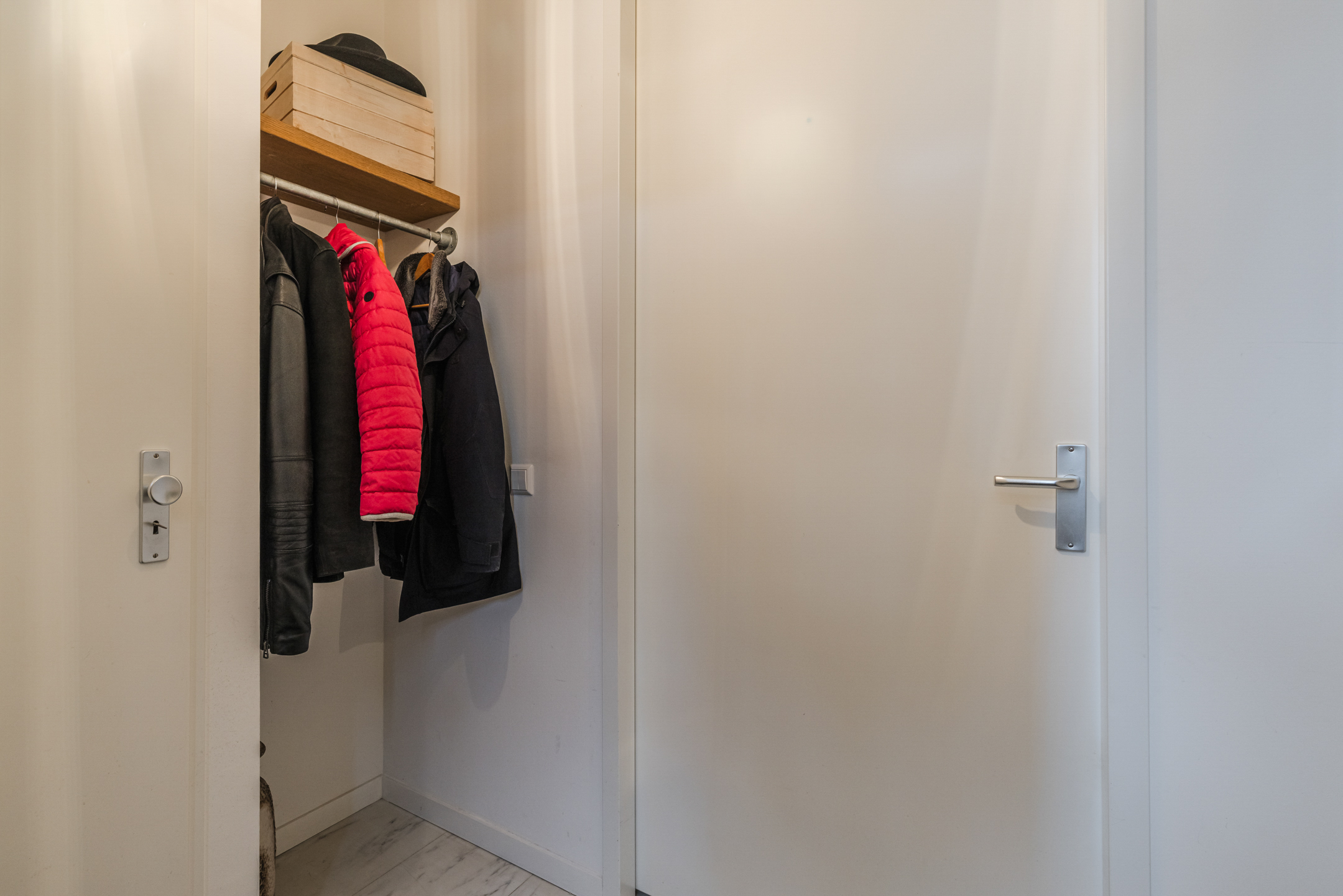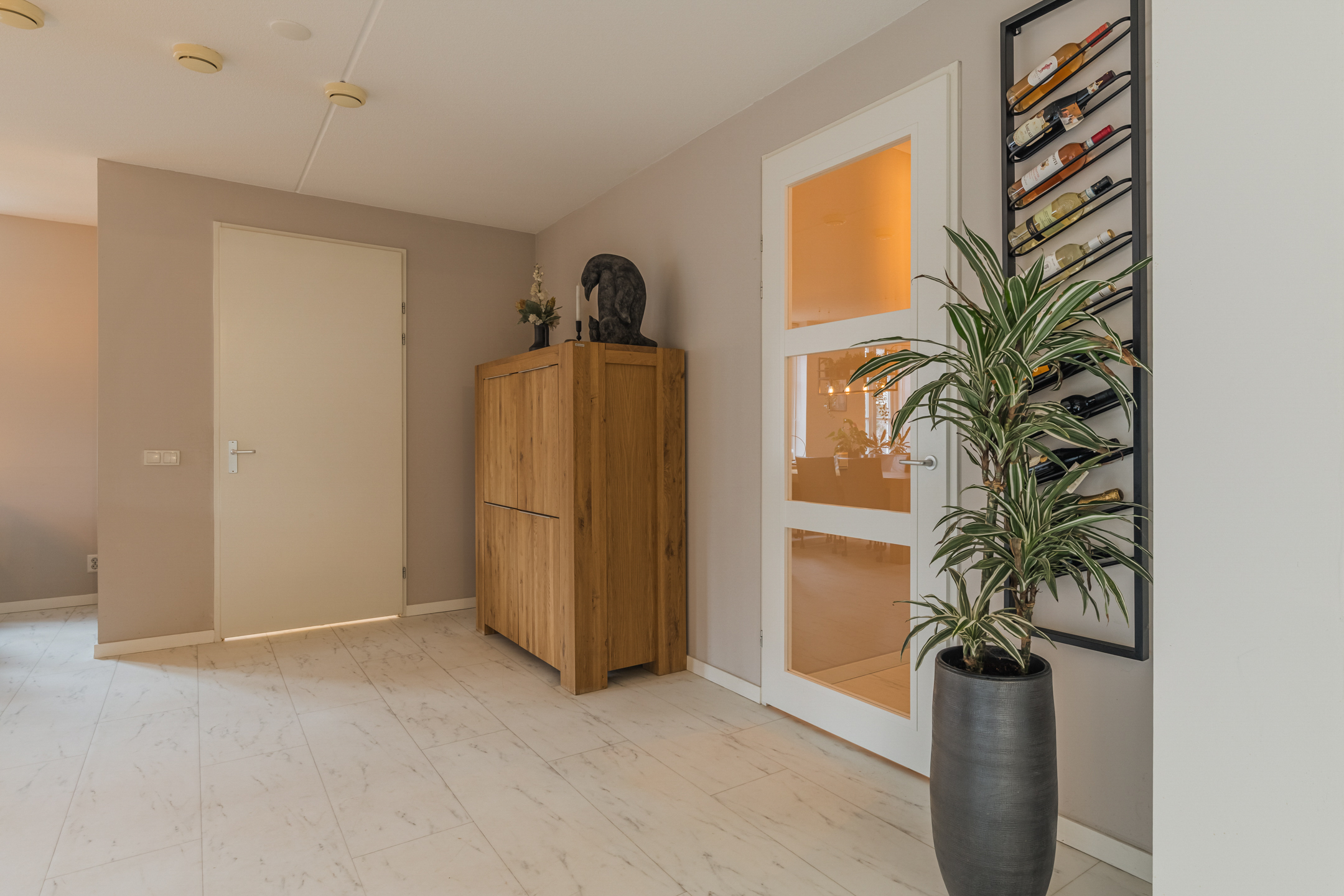 Entree, hal met garderobe, meterkast, toegang tot de woonkamer en half open keuken.