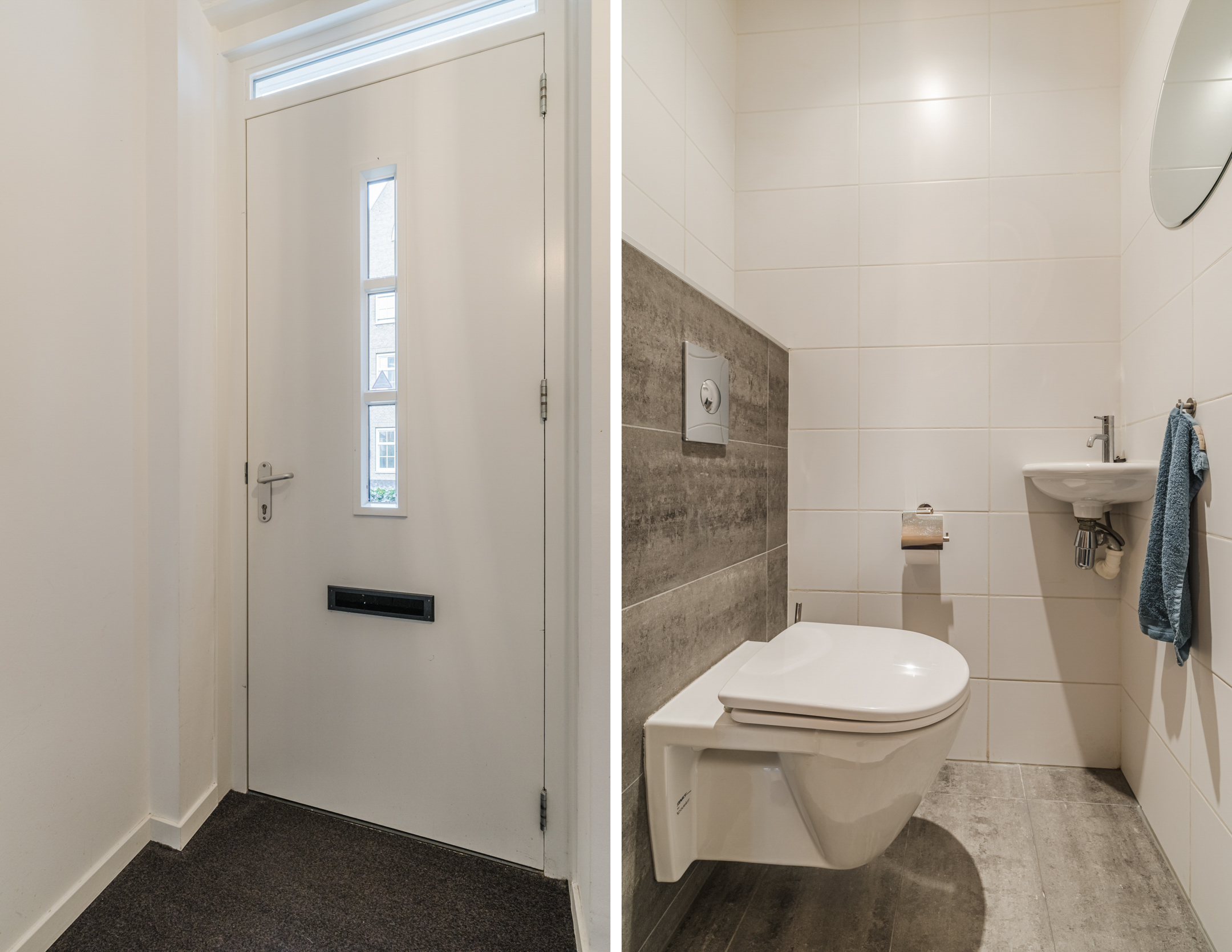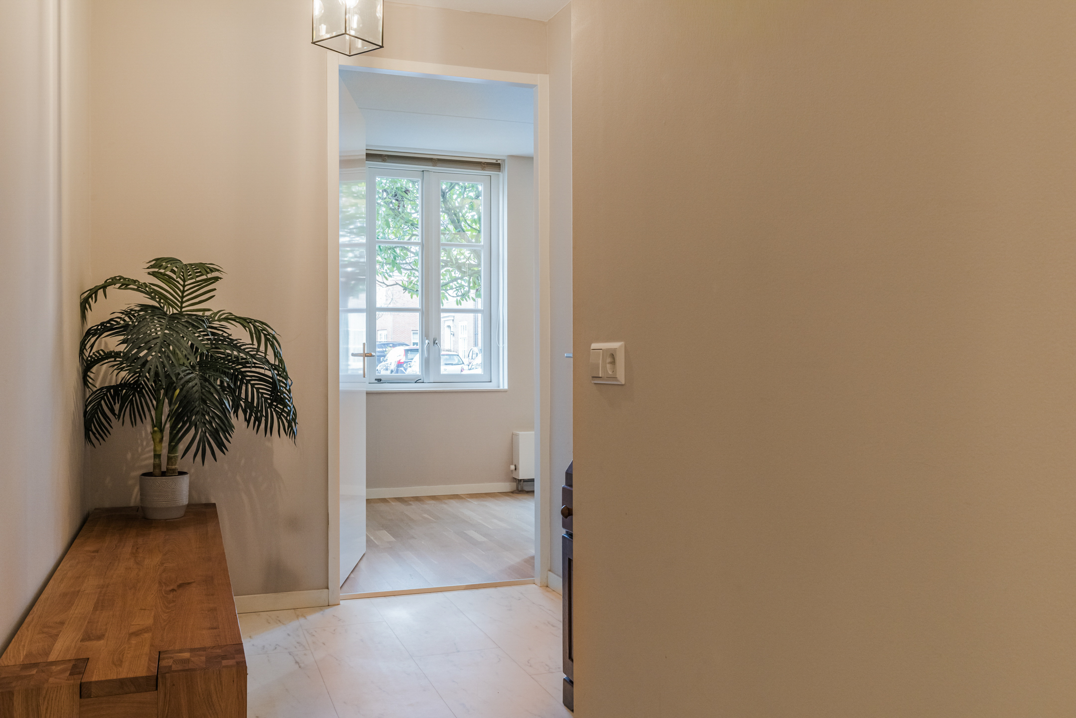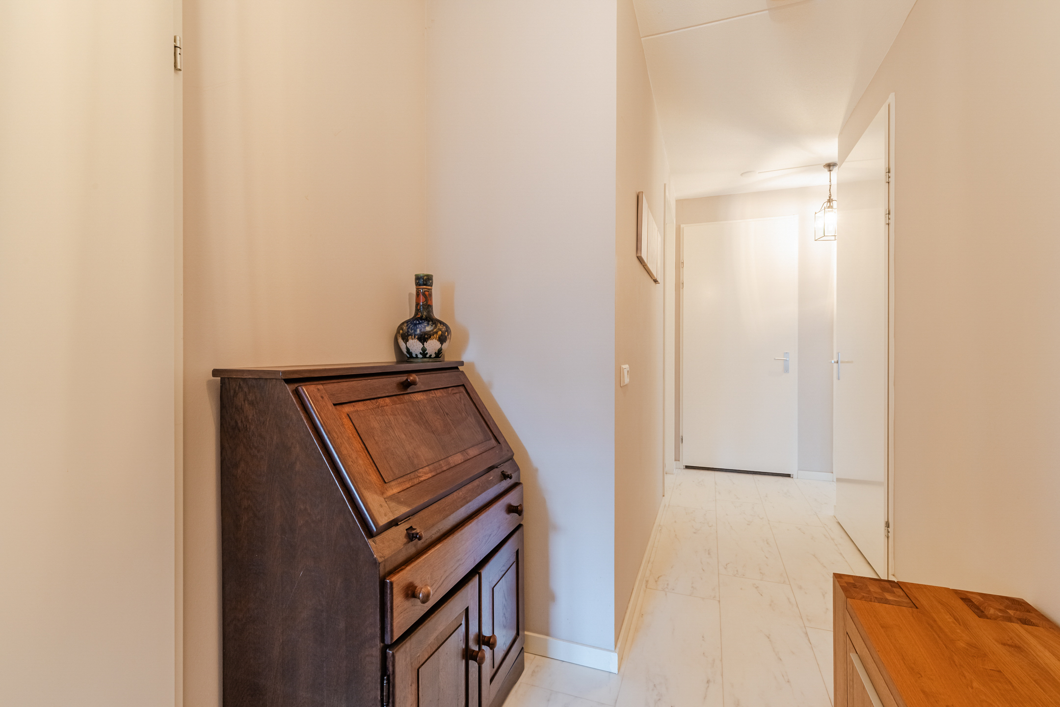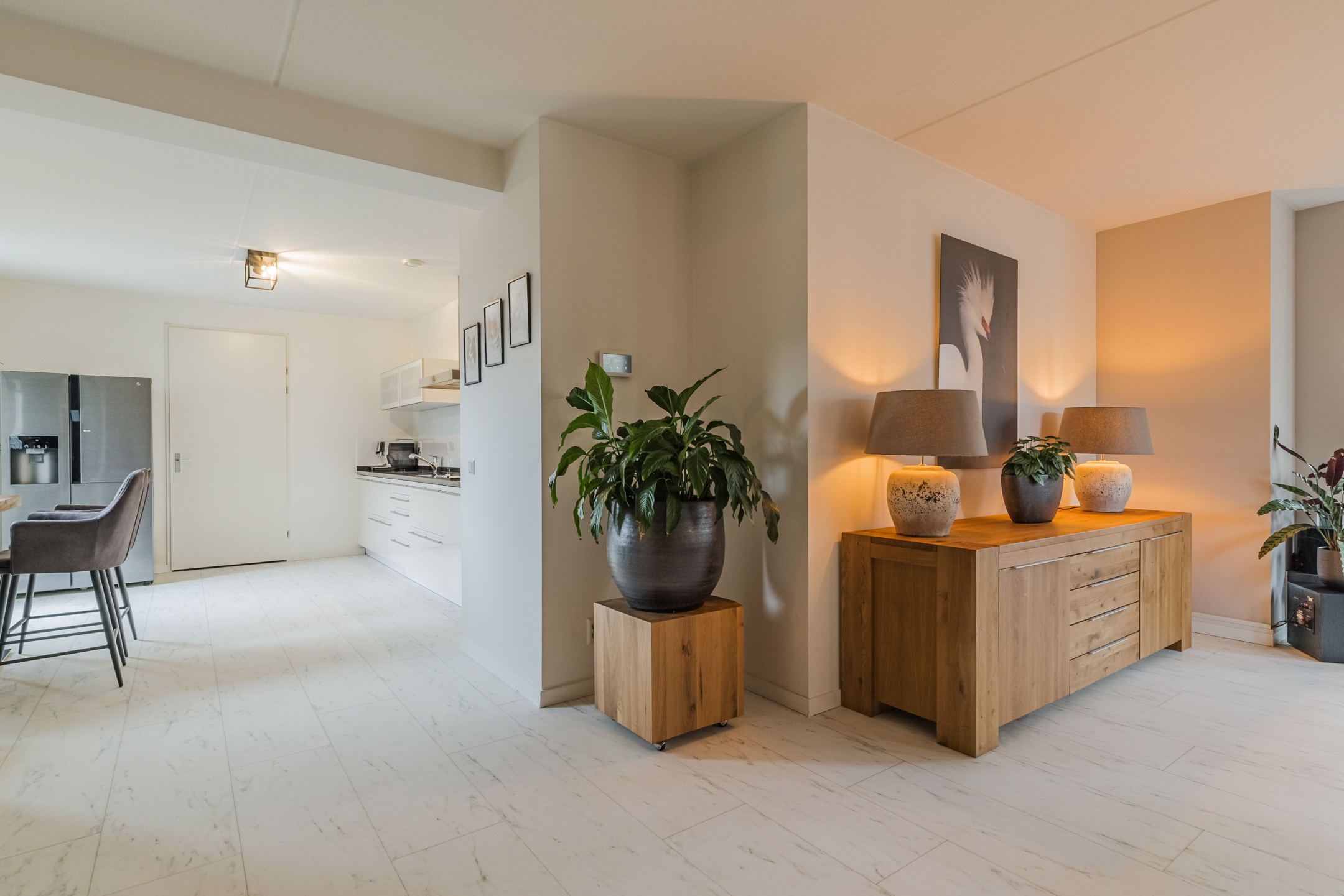 Entree, hal met garderobe, meterkast, toegang tot de woonkamer en half open keuken.