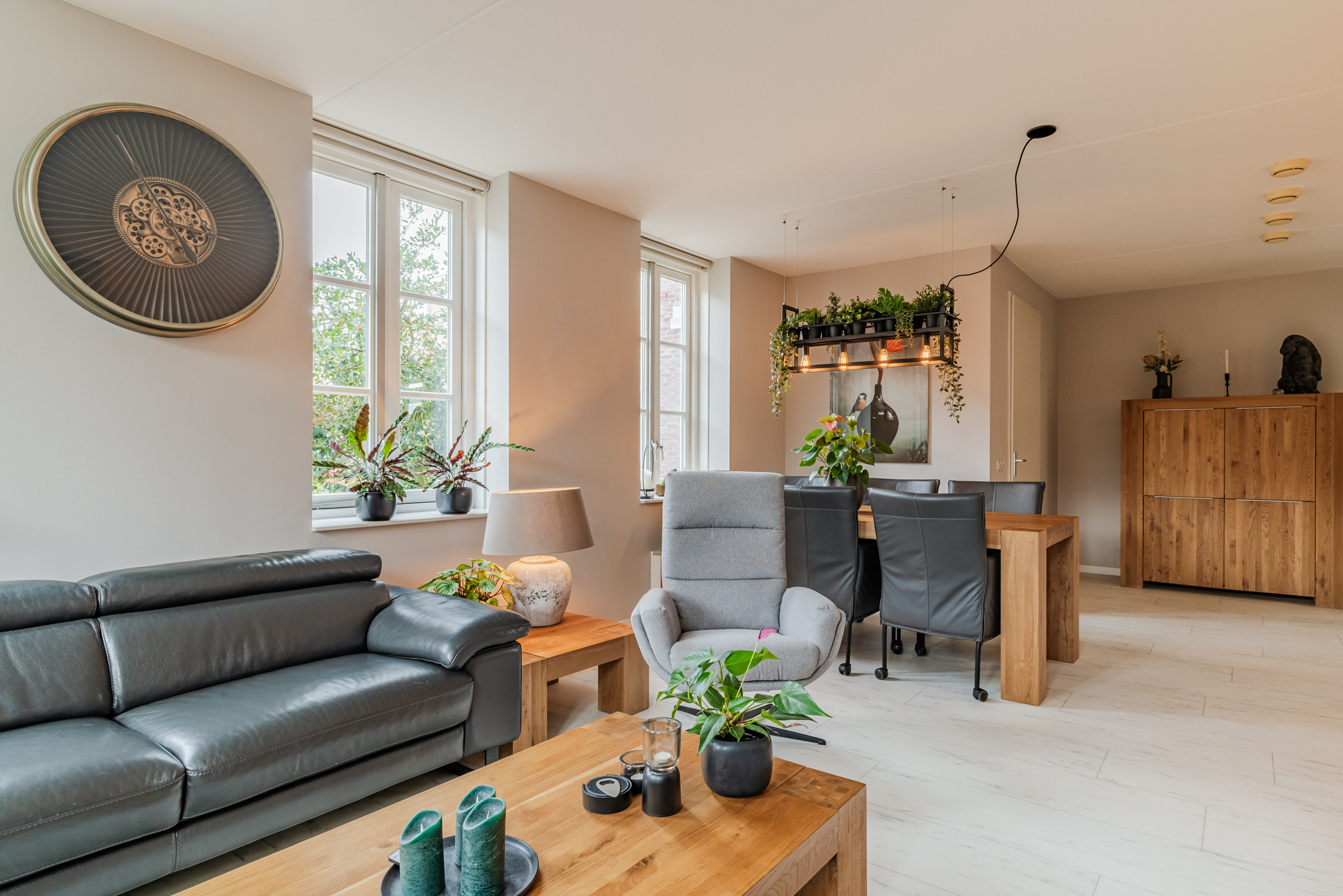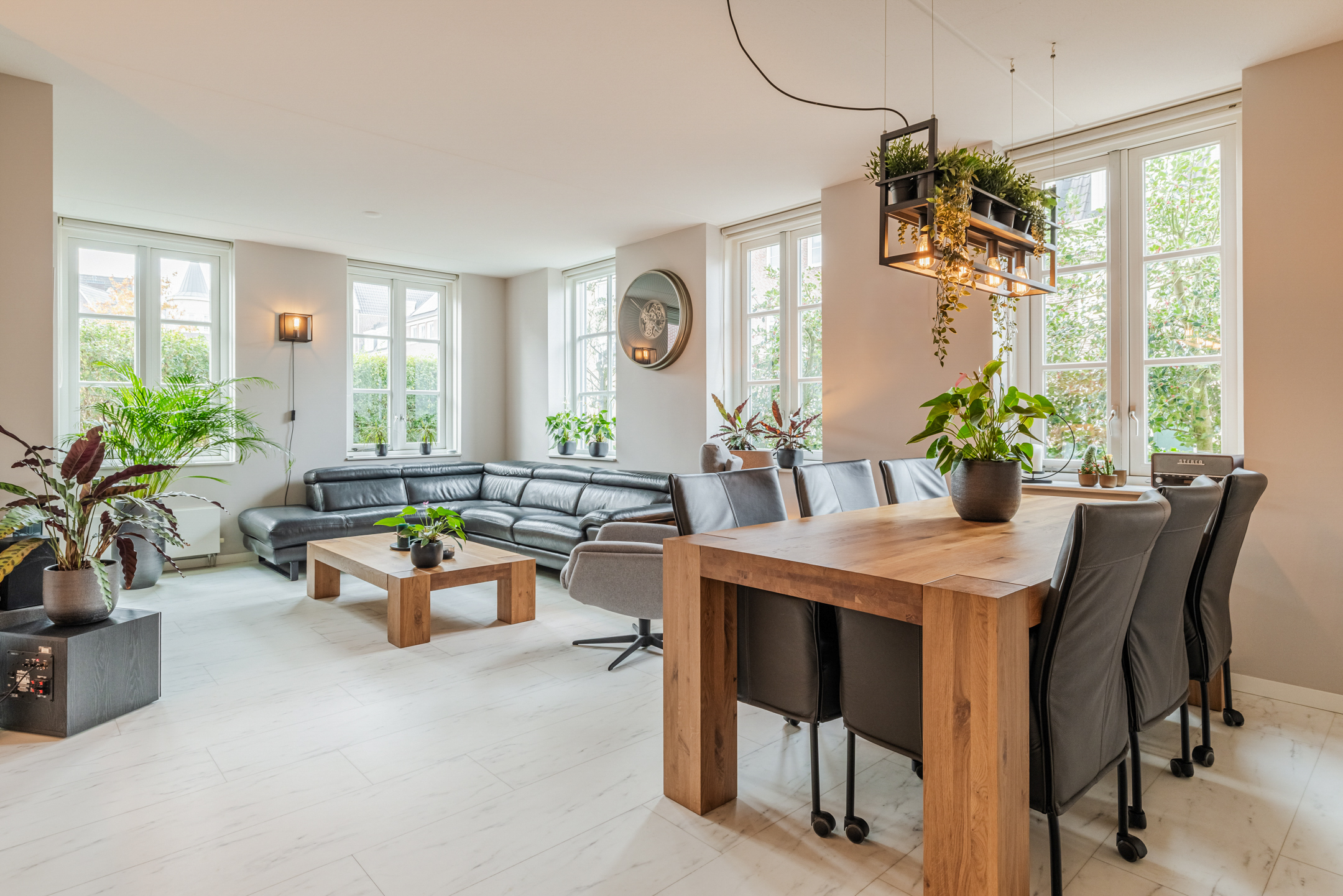 Aan de voorzijde van het appartement bevindt zich de gezellig woonkamer. De woonkamer is voorzien van een vijftal raampartijen, waardoor de ruimte heerlijk licht te noemen is. In het verlengde van de woonkamer, richting de keukenruimte, is er voldoende ruimte voor de plaatsing van een grote eettafel.