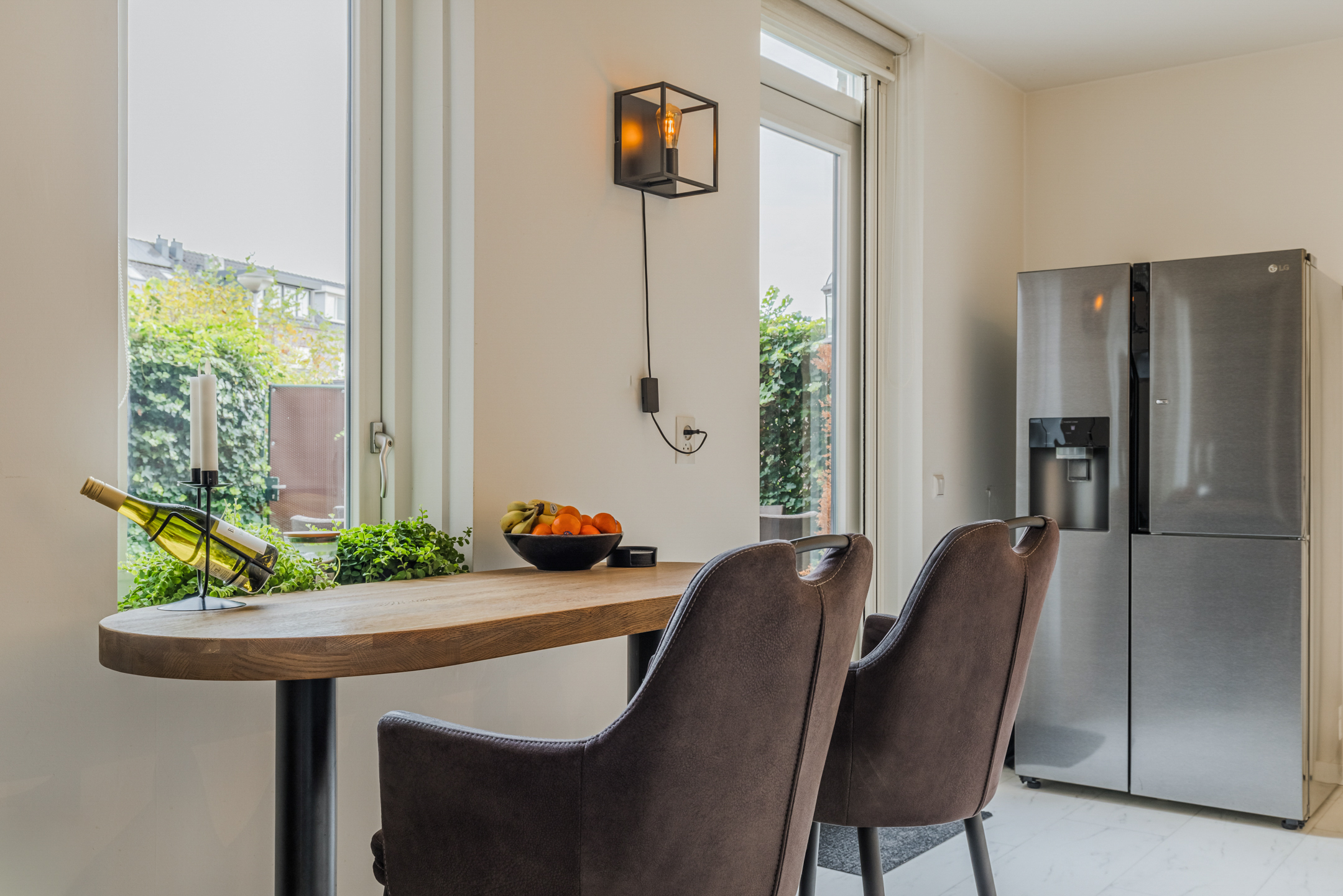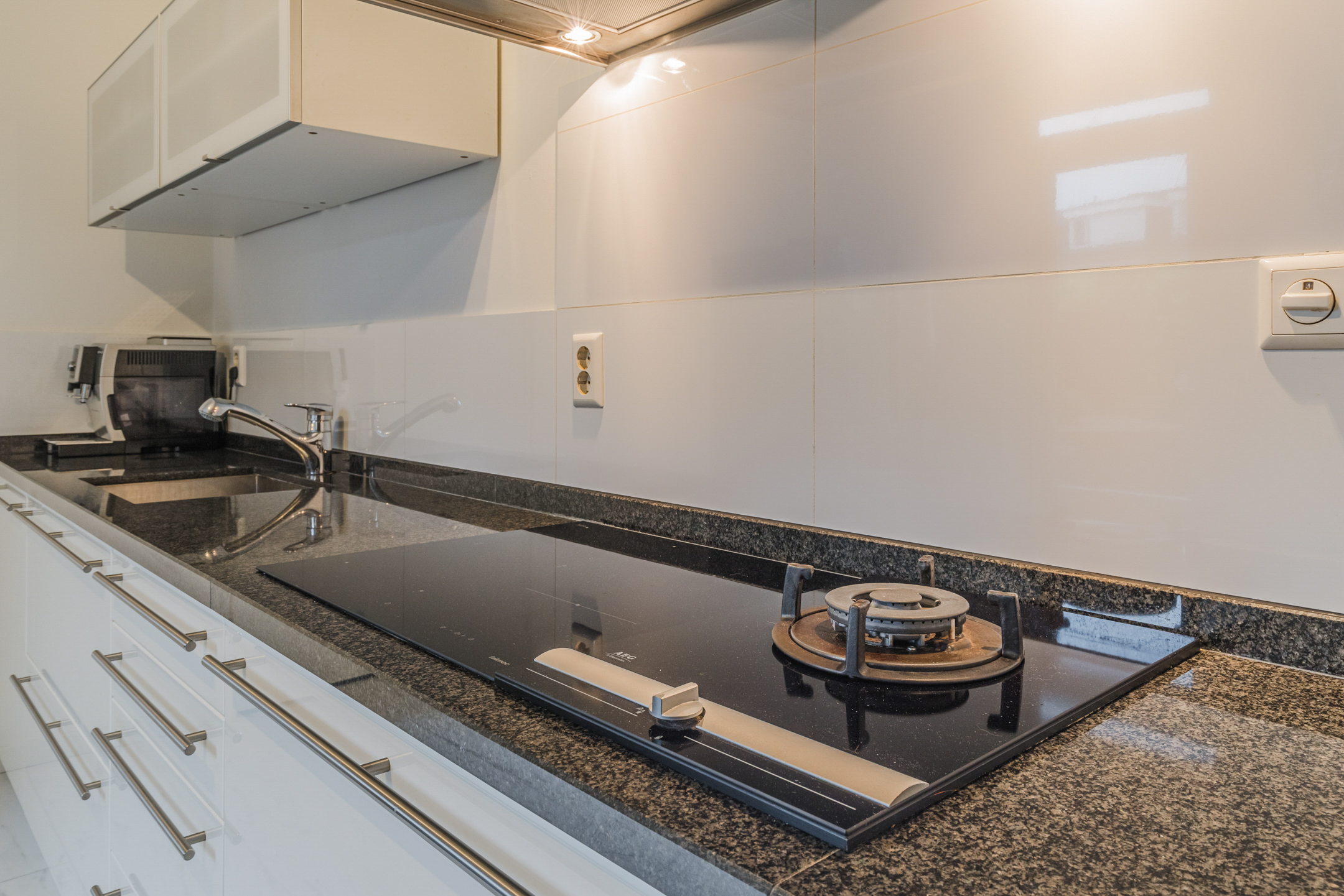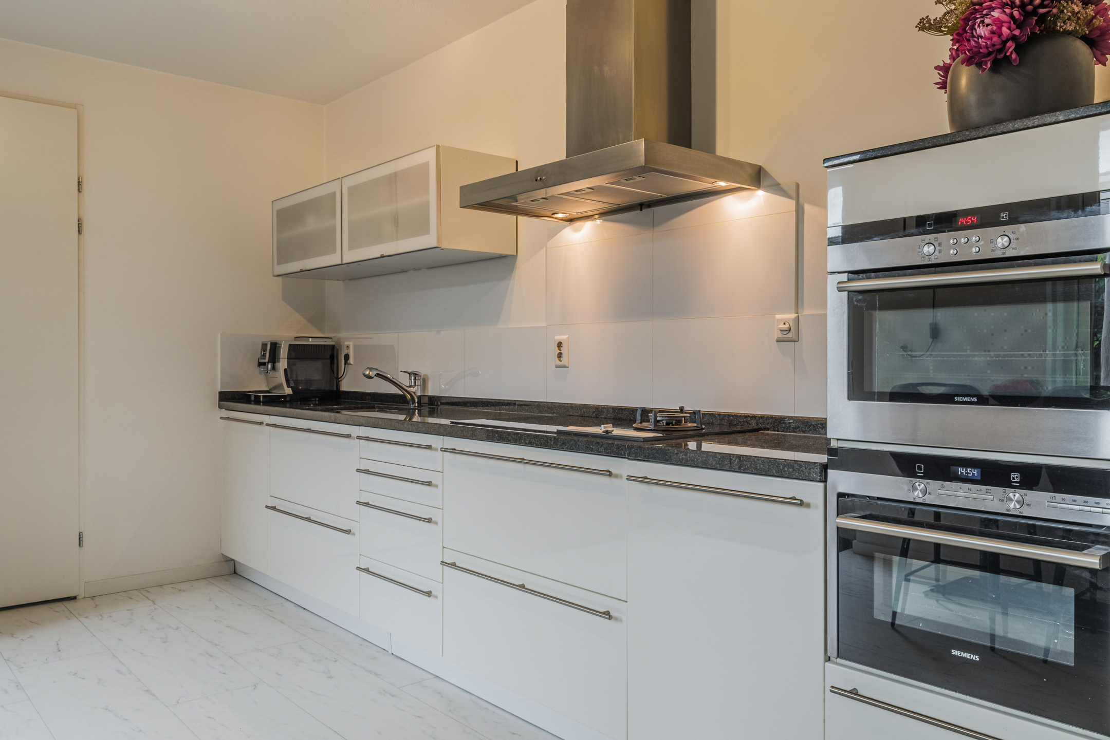 De moderne keuken is gelegen aan de achterzijde van het appartement. De keuken is geplaatst in een lange wandopstelling, uitgevoerd in een tijdloze kleurstelling en is voorzien van alle wenselijke inbouwapparatuur, te weten: een inductiekookplaat, een wokbrander op gas, een oven, een combi-oven/ magnetron, een koelkast, een vaatwasser en een rvs- afzuigkap. Vanuit de keukenruimte zijn de ruime inpandige berging (ca. 5 m2) en de gezellige achtertuin te bereiken.