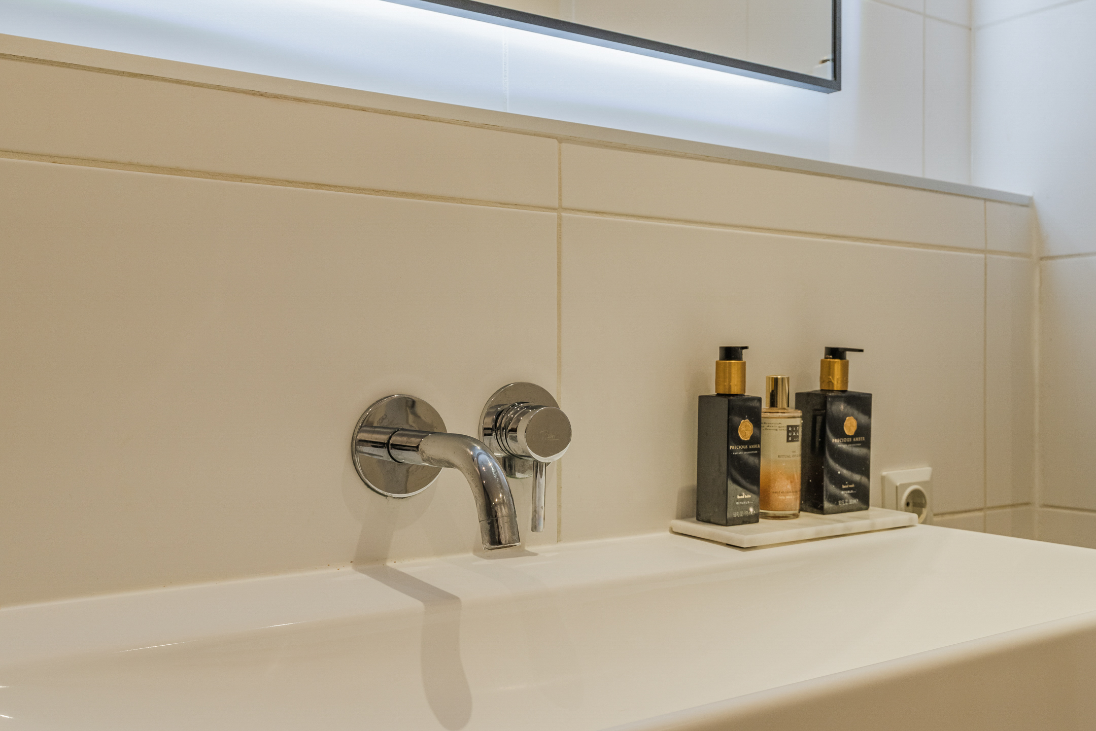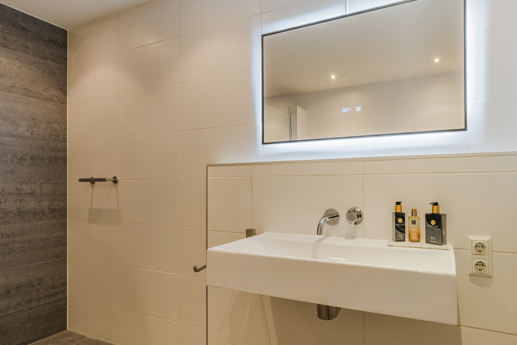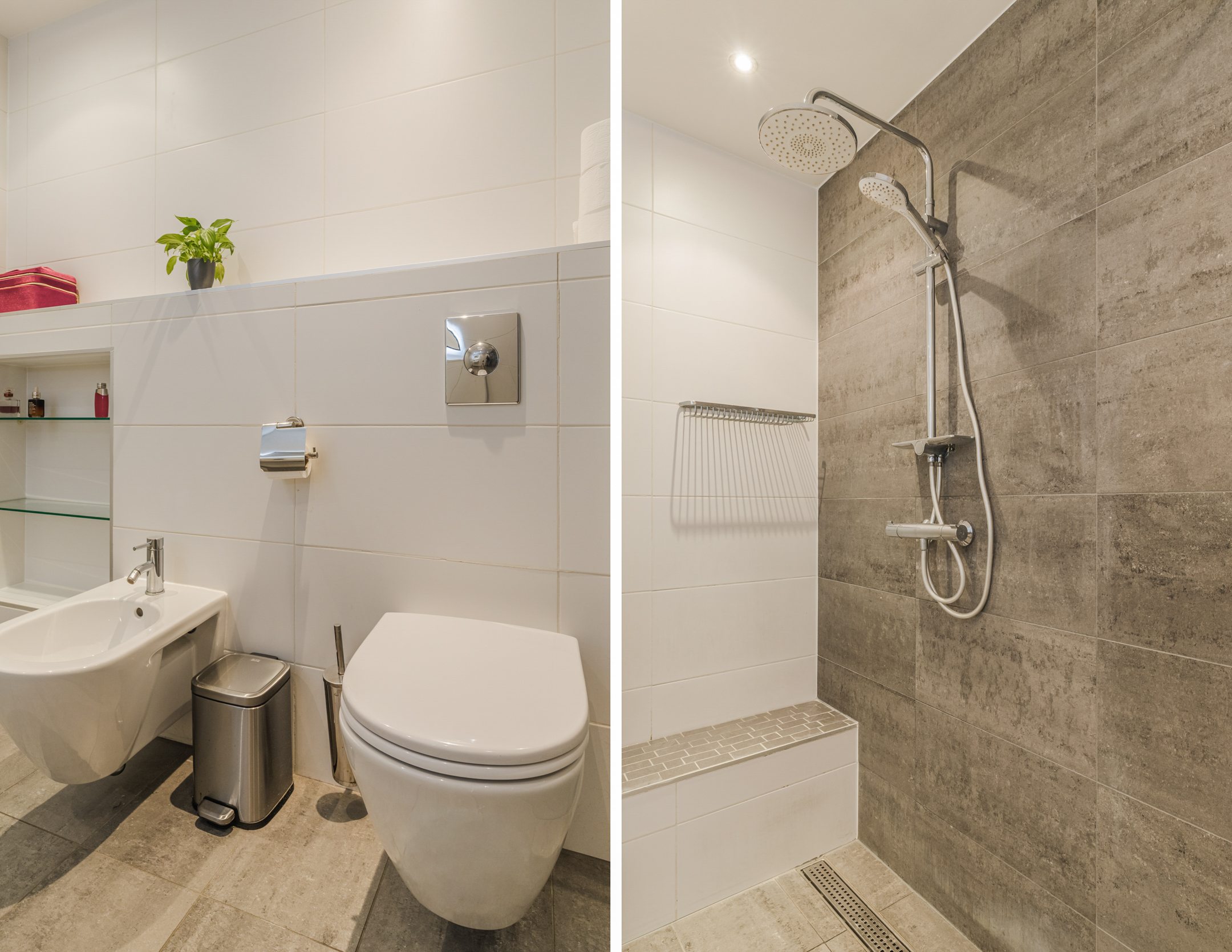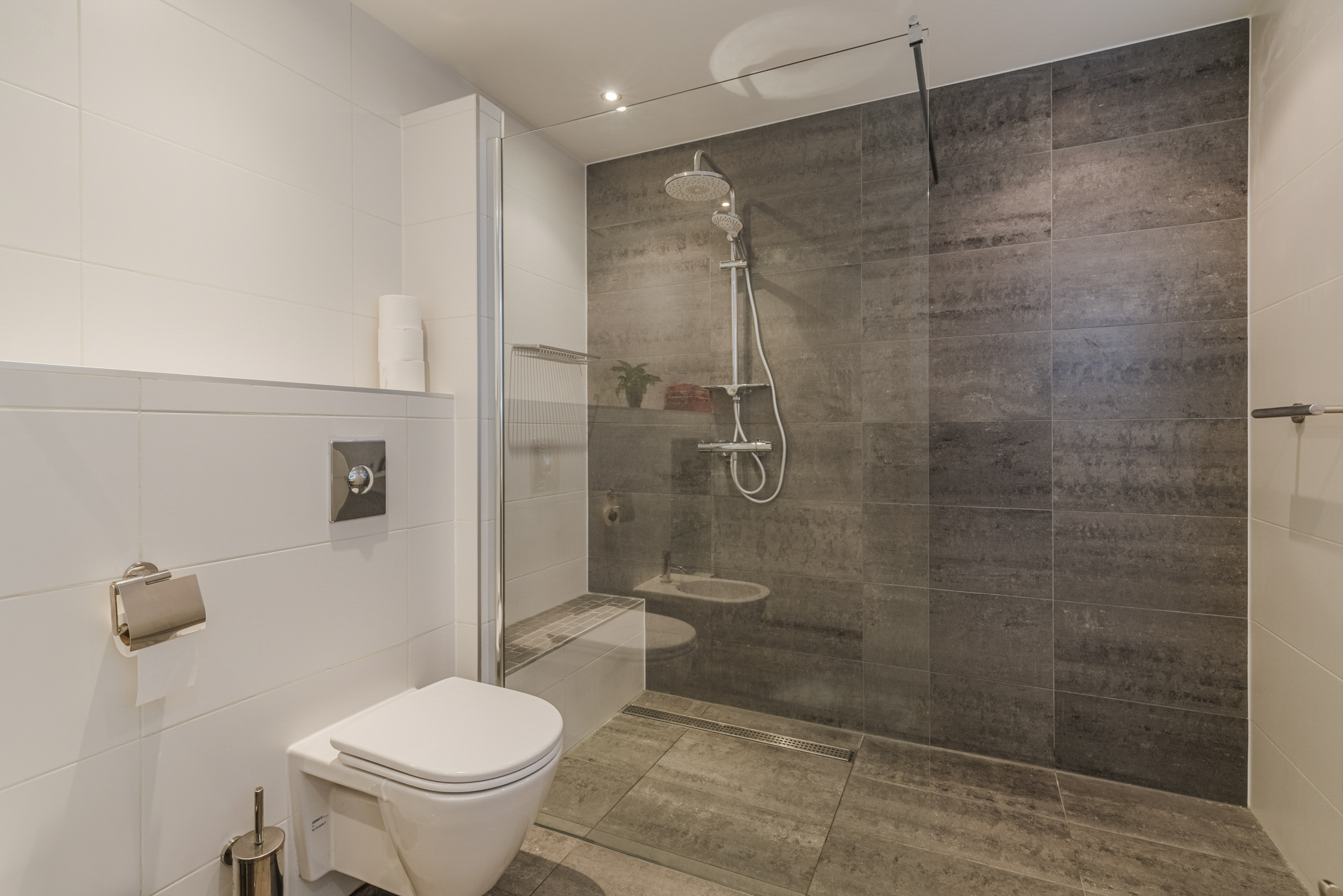 De verzorgde badkamer (ca. 9 m2) is geheel betegeld in een moderne wit-/ grijze kleurstelling en voorzien van een ruime inloopdouche, een toilet, een bidet, een wastafel en handdoekradiator.