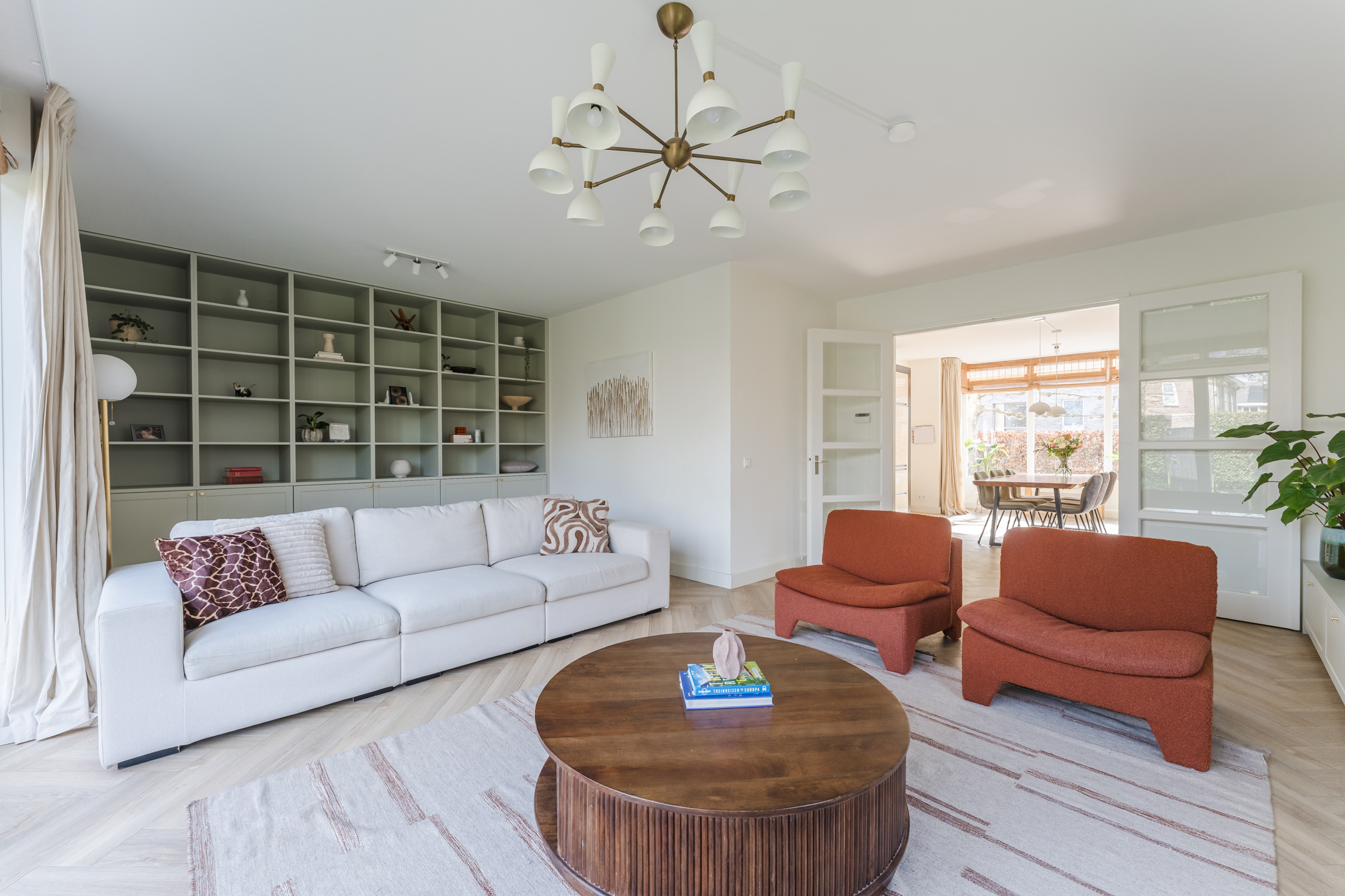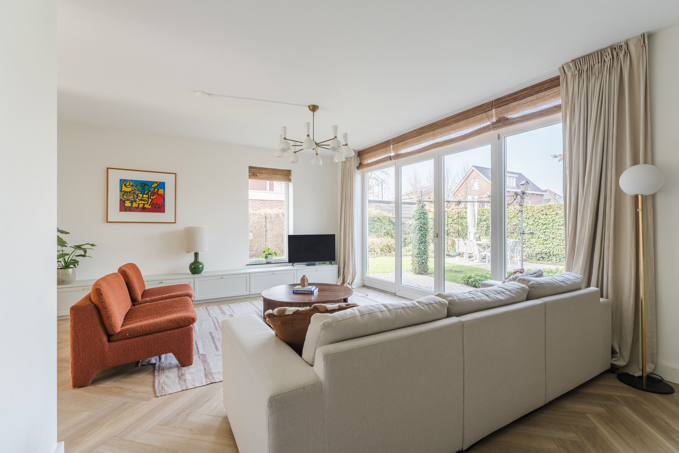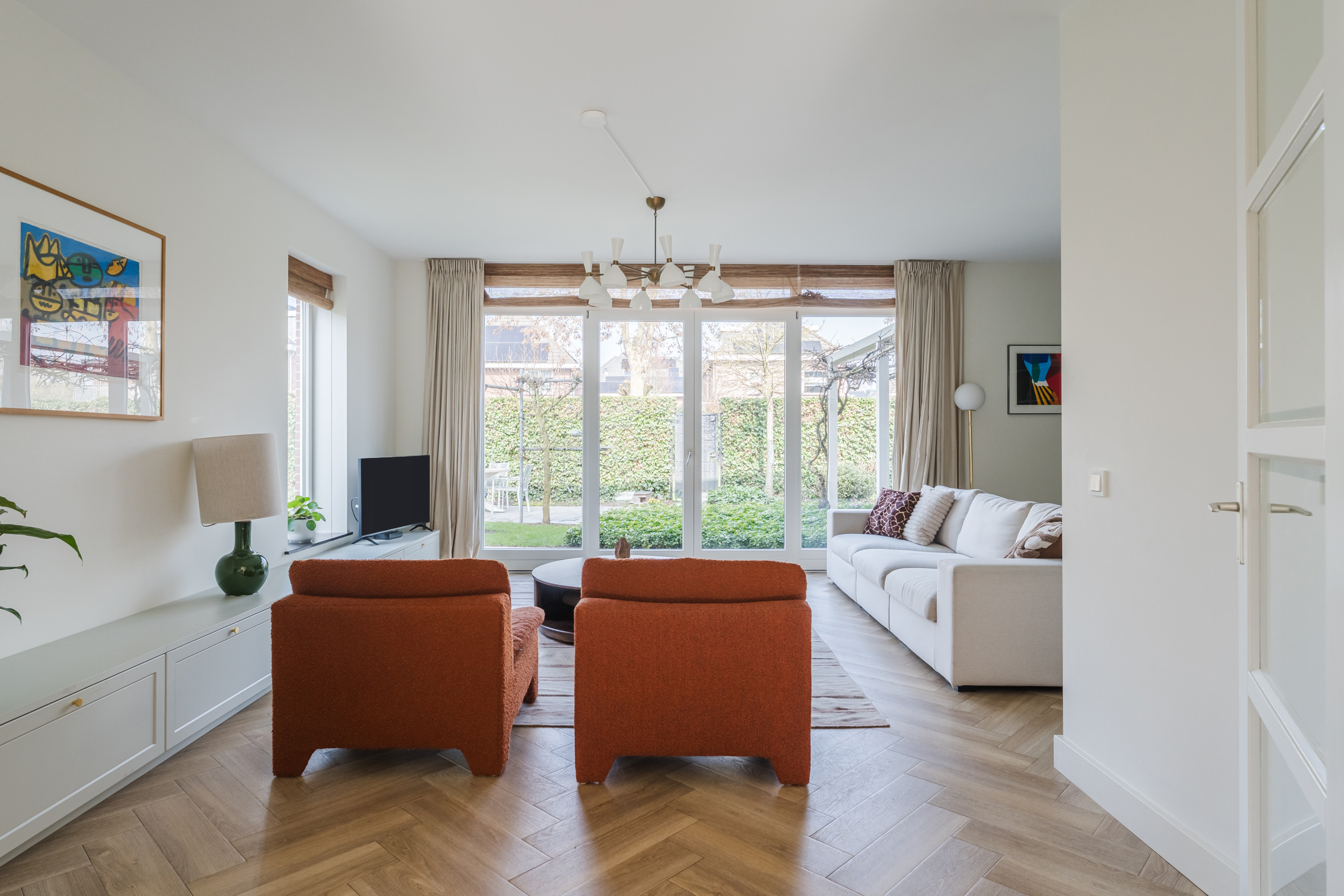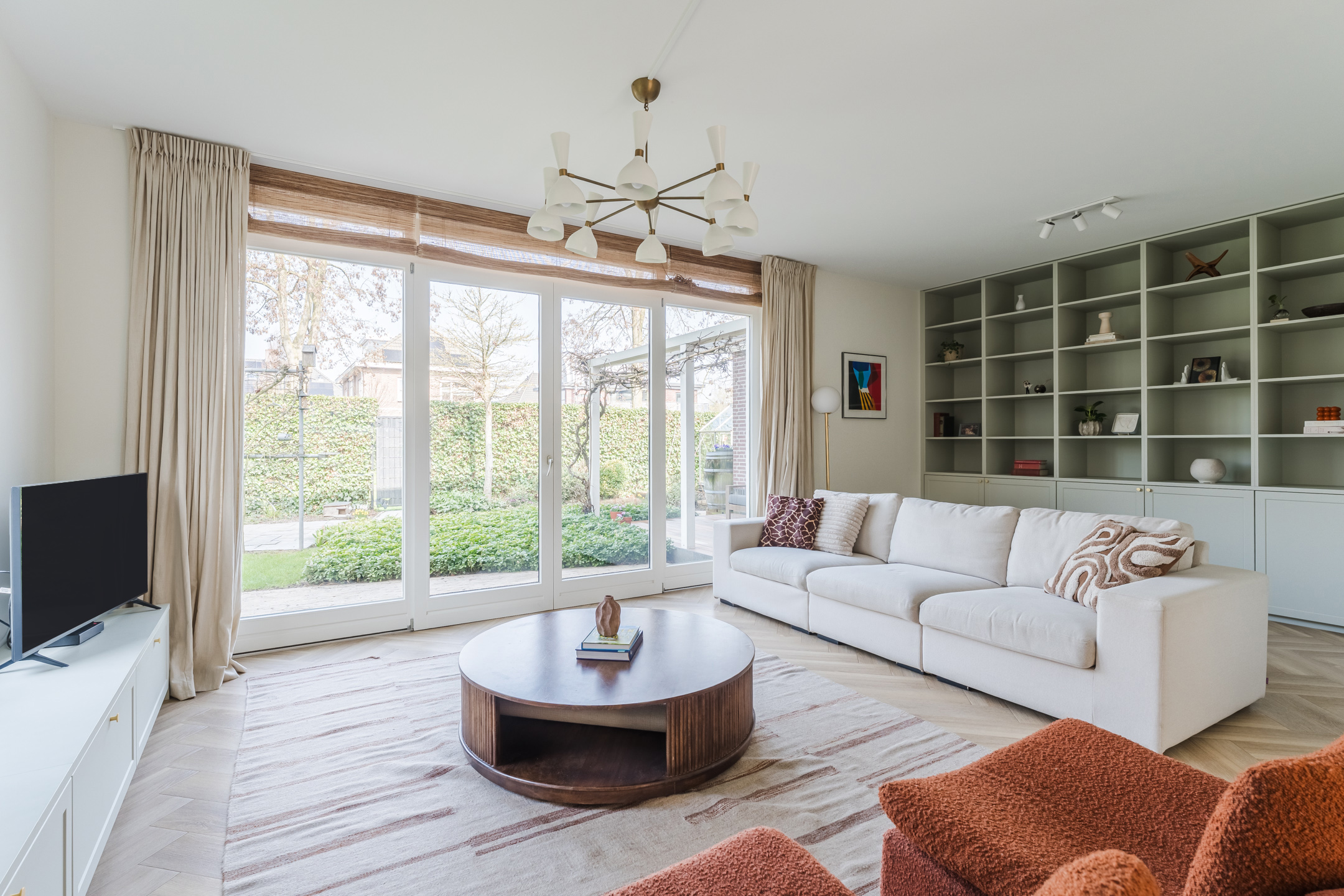 De ruime woonkamer bevindt zich aan de achterzijde van de woning. Deze prettige tuingerichte woonkamer is bereikbaar via de openslaande deuren vanuit de woonkeuken. Dankzij de grote raampartijen en de openslaande deuren naar de tuin valt hier een aangename hoeveelheid daglicht naar binnen. De stijlvolle materiaalkeuze en verzorgde afwerking zorgen voor een warme en rustige uitstraling. De woonkamer beschikt over twee fraaie op maat gemaakte inbouwkasten, die het praktische met de verfijnde afwerking combineren.