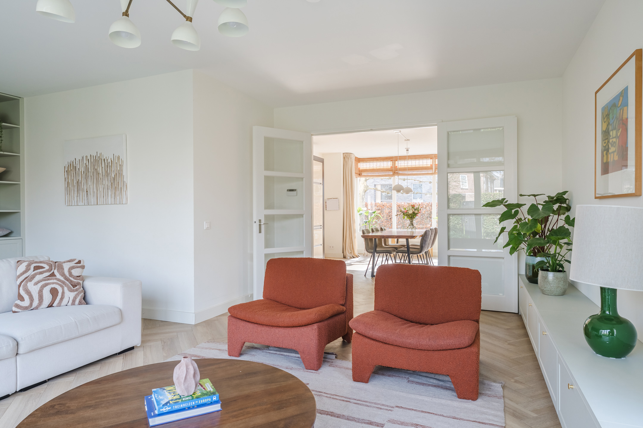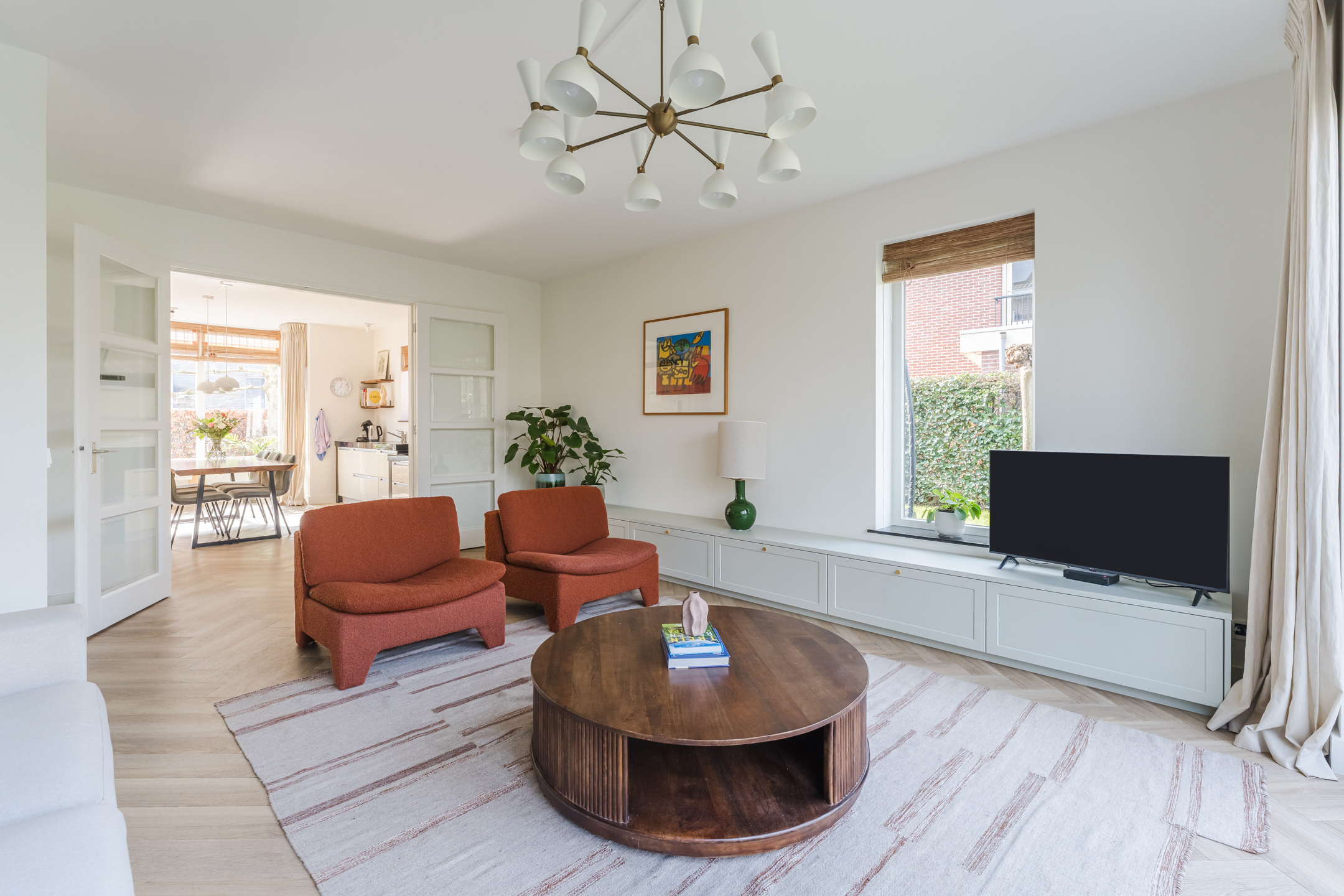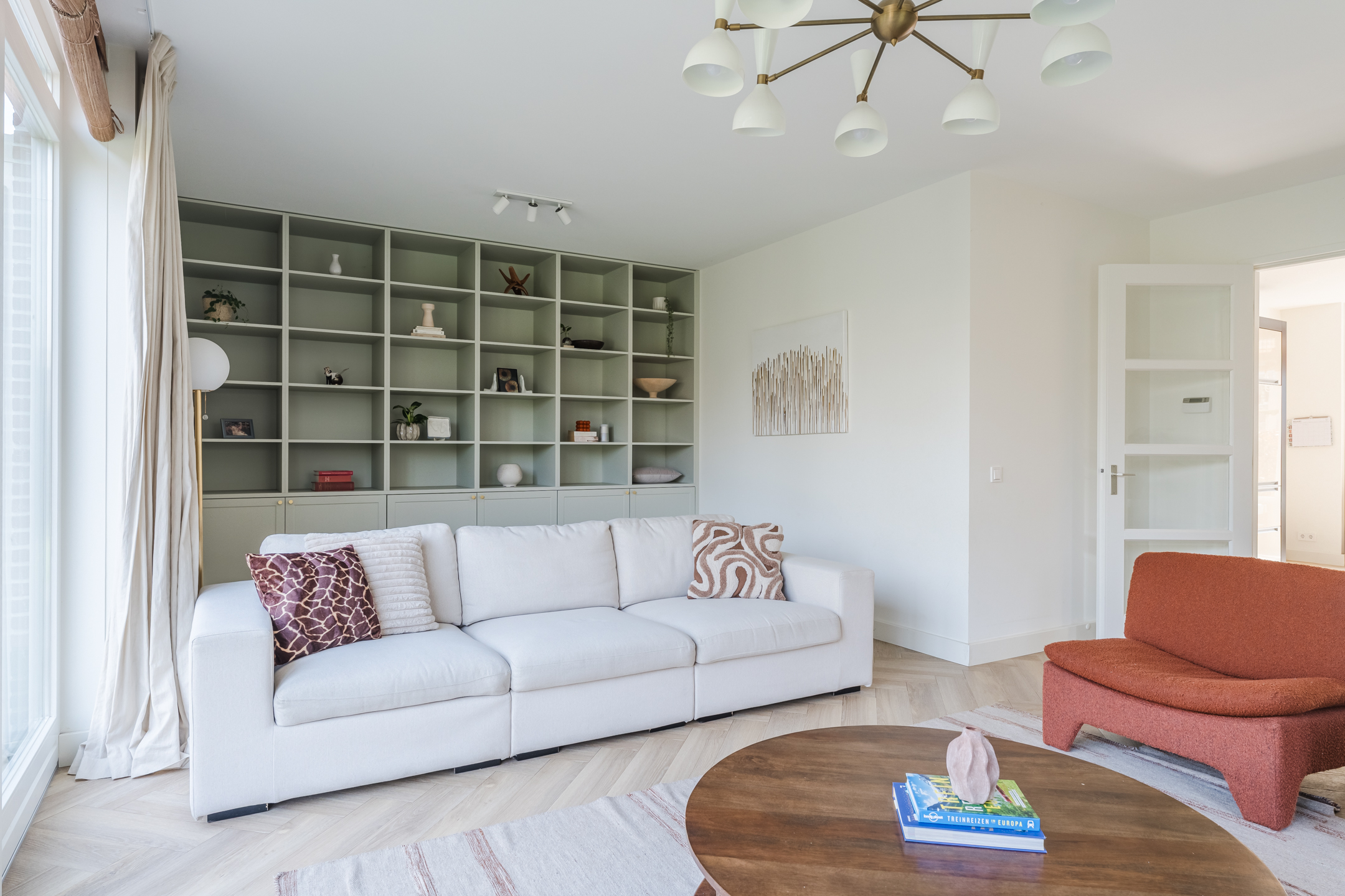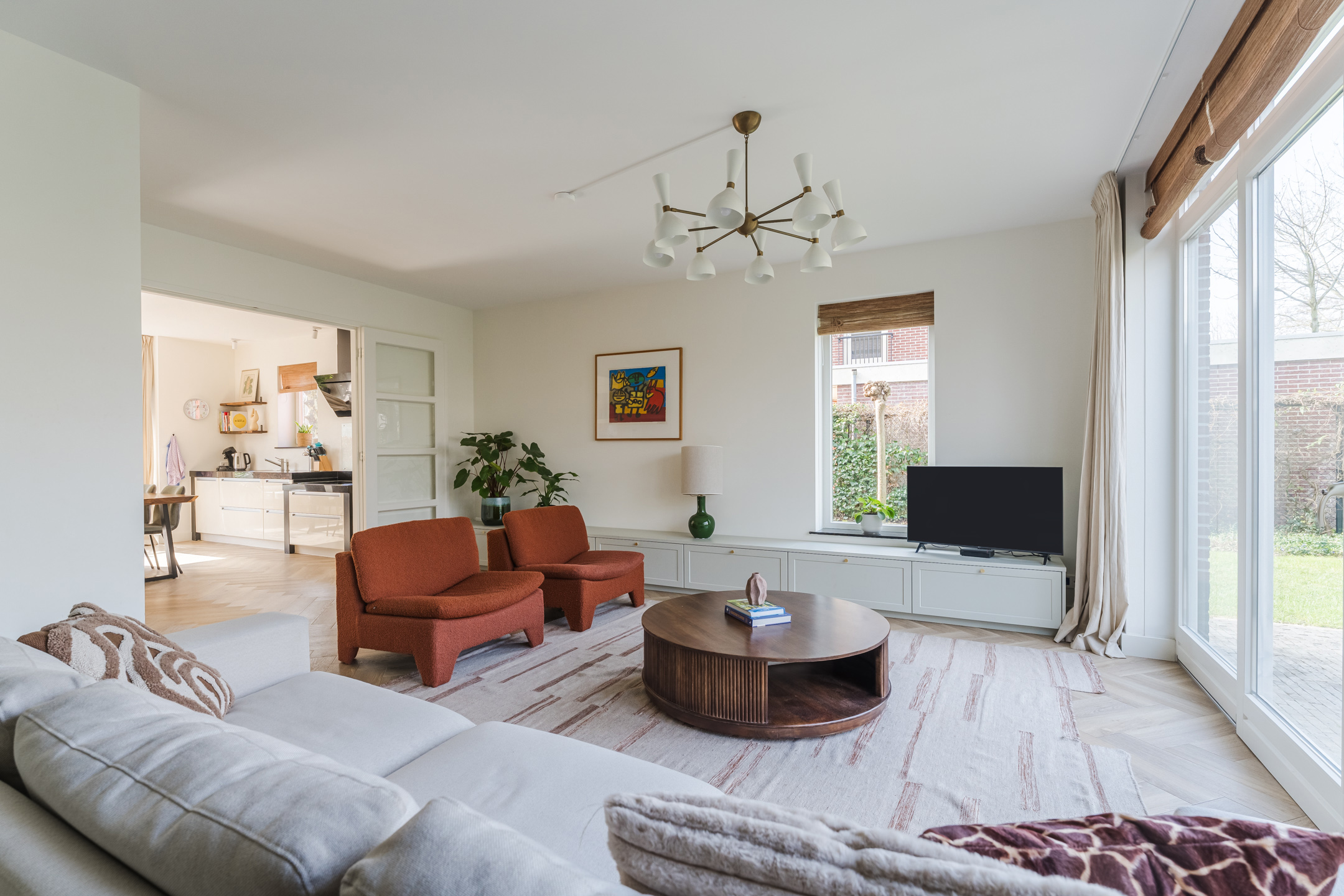 De ruime woonkamer bevindt zich aan de achterzijde van de woning. Deze prettige tuingerichte woonkamer is bereikbaar via de openslaande deuren vanuit de woonkeuken. Dankzij de grote raampartijen en de openslaande deuren naar de tuin valt hier een aangename hoeveelheid daglicht naar binnen. De stijlvolle materiaalkeuze en verzorgde afwerking zorgen voor een warme en rustige uitstraling. De woonkamer beschikt over twee fraaie op maat gemaakte inbouwkasten, die het praktische met de verfijnde afwerking combineren.
