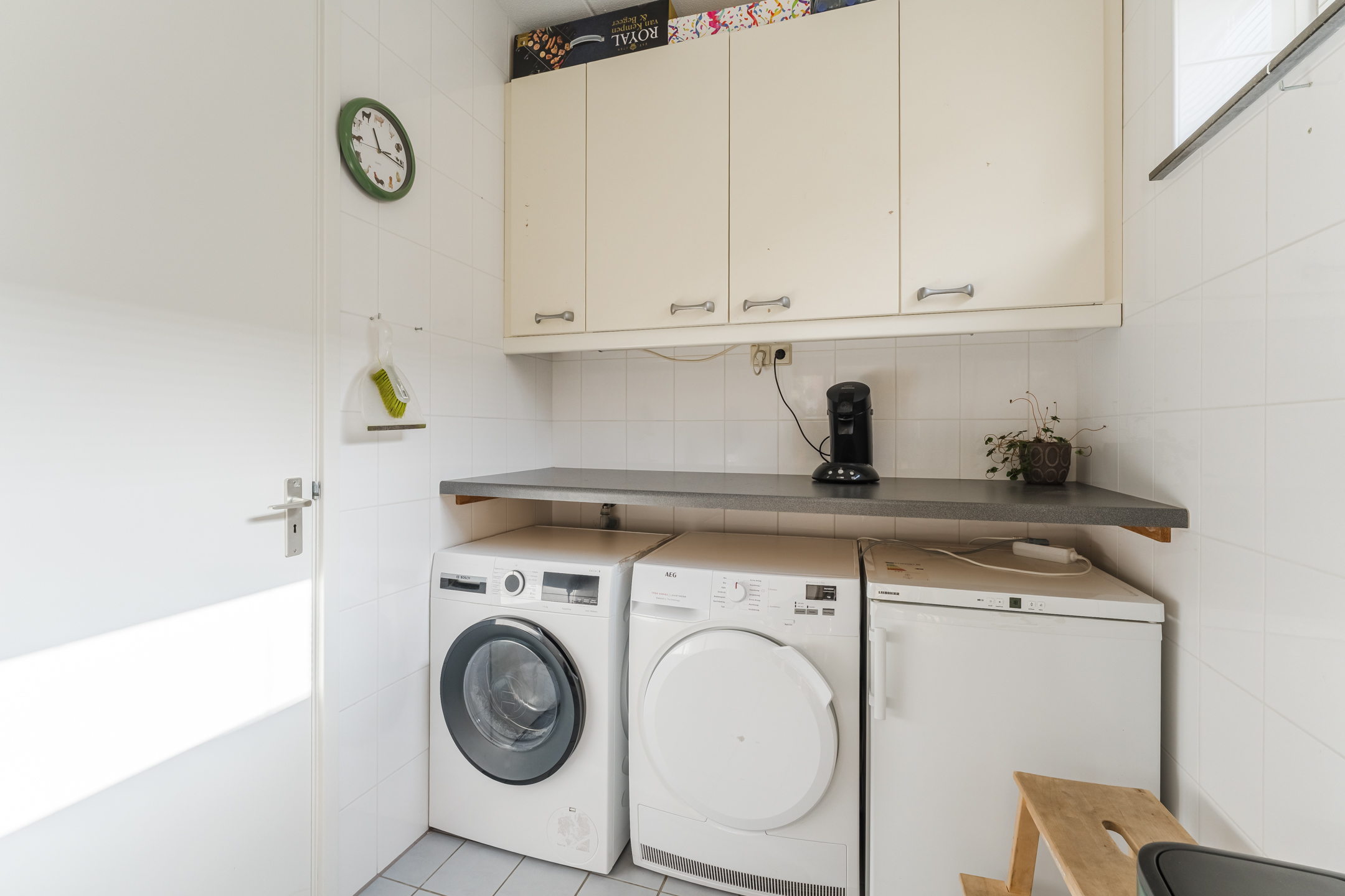 Aansluitend aan de keuken bevindt zich een multifunctionele bijkeuken (ca. 4 m2) met veel extra kastruimte en een opstelplaats voor een vriezer, wasmachine en wasdroger.
