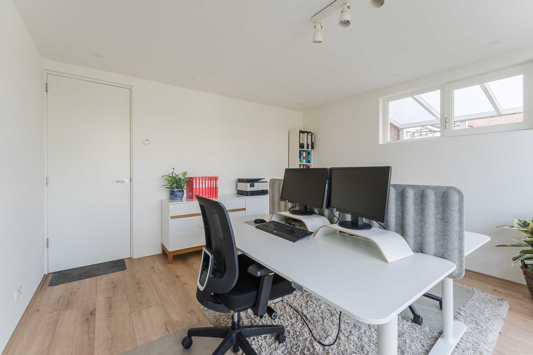 Een deel van de garage is in 2021 omgebouwd tot een comfortabele kantoorruimte (ca. 18 m2) aan huis met twee volwaardige werkplekken die van alle gemakken zijn voorzien (internetaansluiting, wateraansluiting, prachtige inbouwspots). De garage was vanuit de bouw al geïsoleerd en verwarmd, en is bij de realisatie van de kantoorruimte aanvullend geïsoleerd, wat zorgt voor optimaal comfort. Door de ligging aan de achterzijde is het een heerlijk rustige werkplek en dankzij de openslaande deuren naar de tuin is het alsof je middenin het groen zit te werken.
