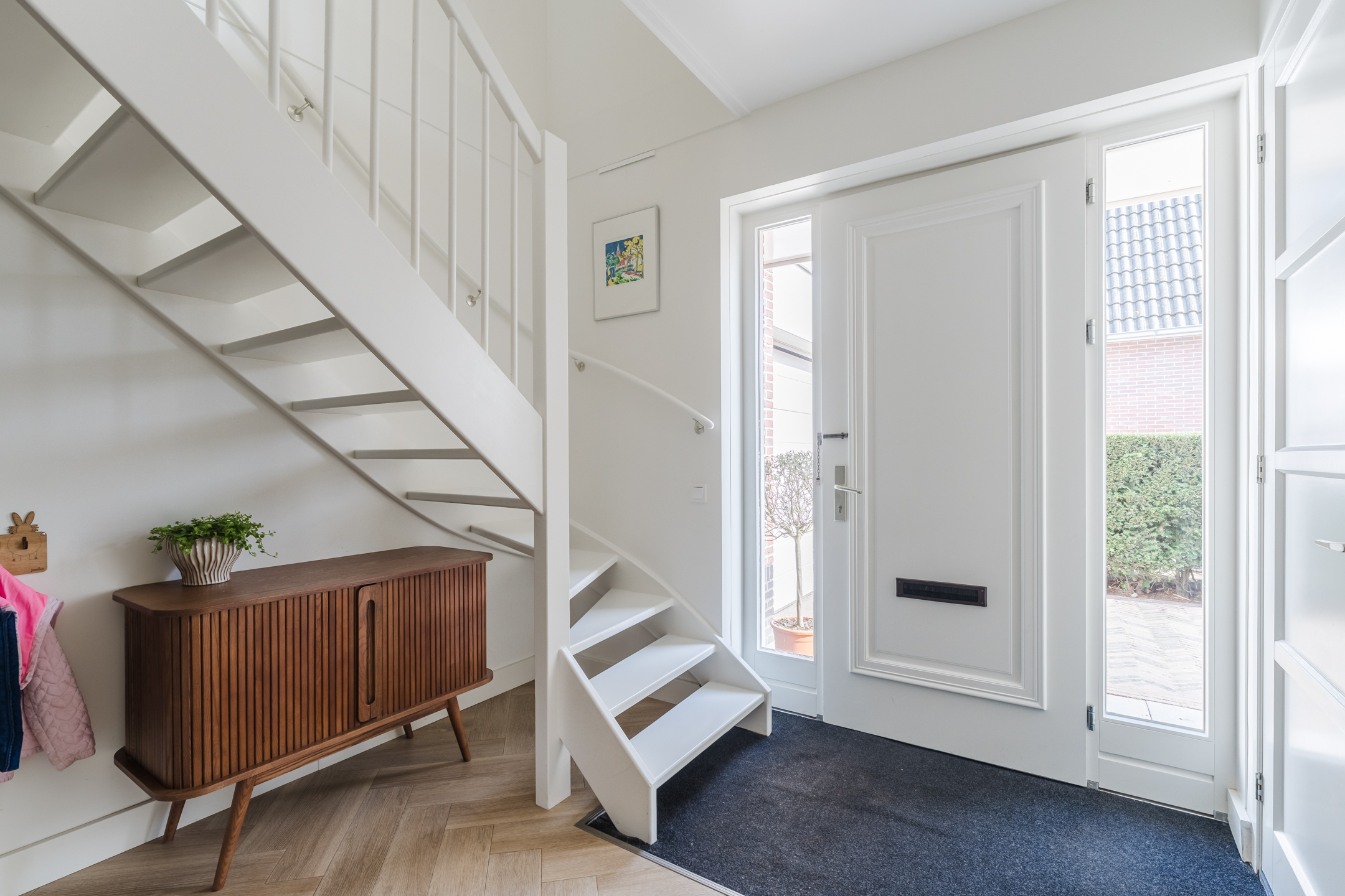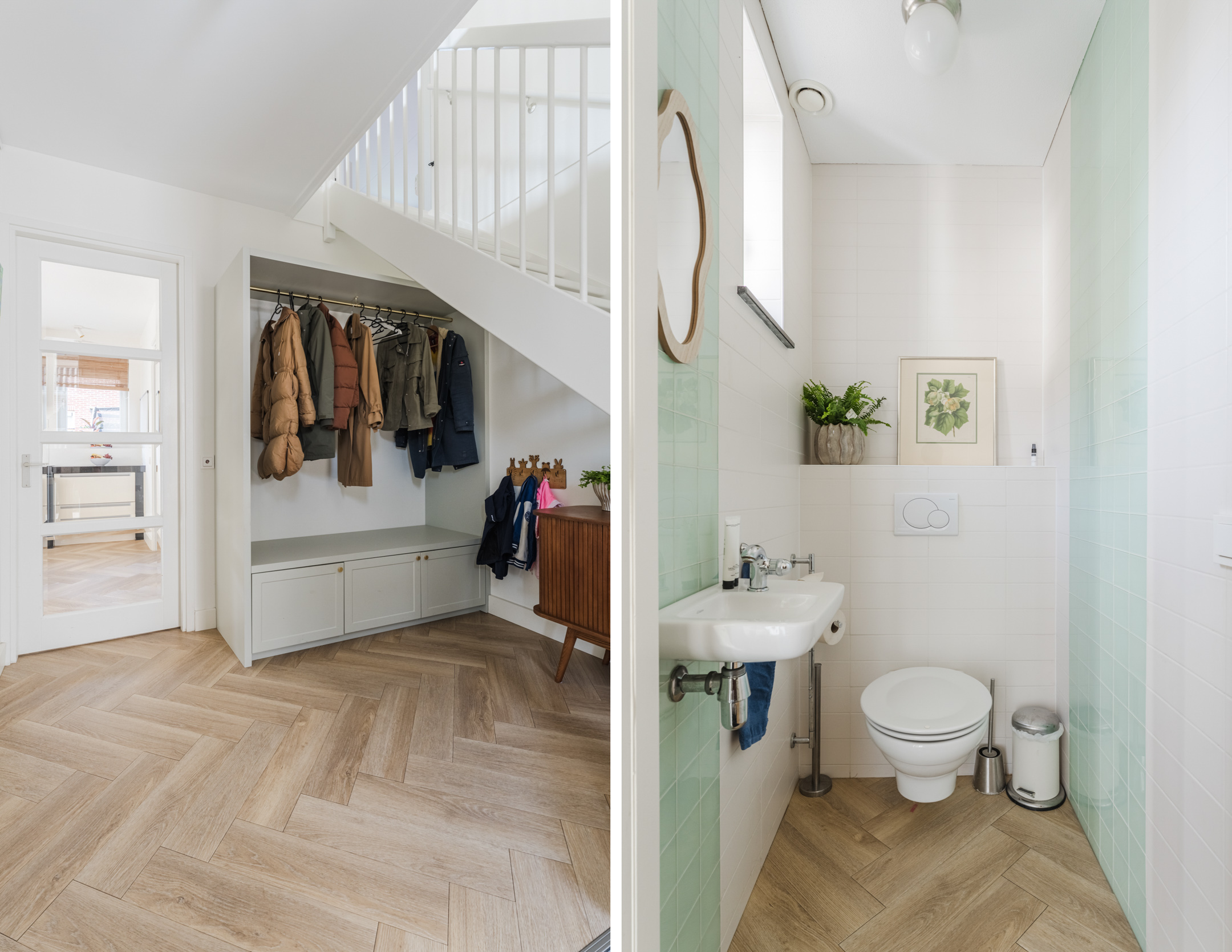 De zeer riante hal biedt een fijn welkom en beschikt over een fraaie, op maat gemaakte, garderobekast en voldoende ruimte voor een toiletruimte met hangend toilet en fontein, de meterkast en een open trapopgang naar de eerste verdieping. Vanuit de hal is de doorgang naar de woonkeuken.
