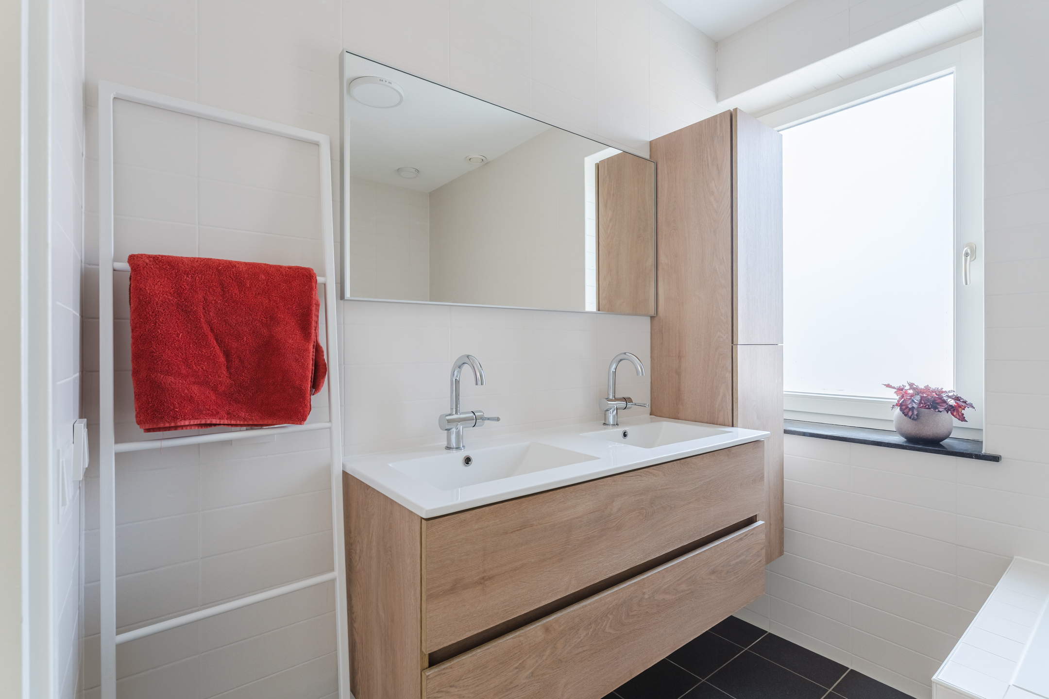 De goed onderhouden badkamer is in 2021 gedeeltelijk vernieuwd en heeft een frisse uitstraling. De badkamer beschikt over een inloopdouche, een riant ligbad en een dubbele wastafel met bijpassend badkamermeubel. Tevens is er een raam en mechanische ventilatie aanwezig voor natuurlijke lichtinval en goede ventilatie. In 2026 is de handdoekradiator vernieuwd.