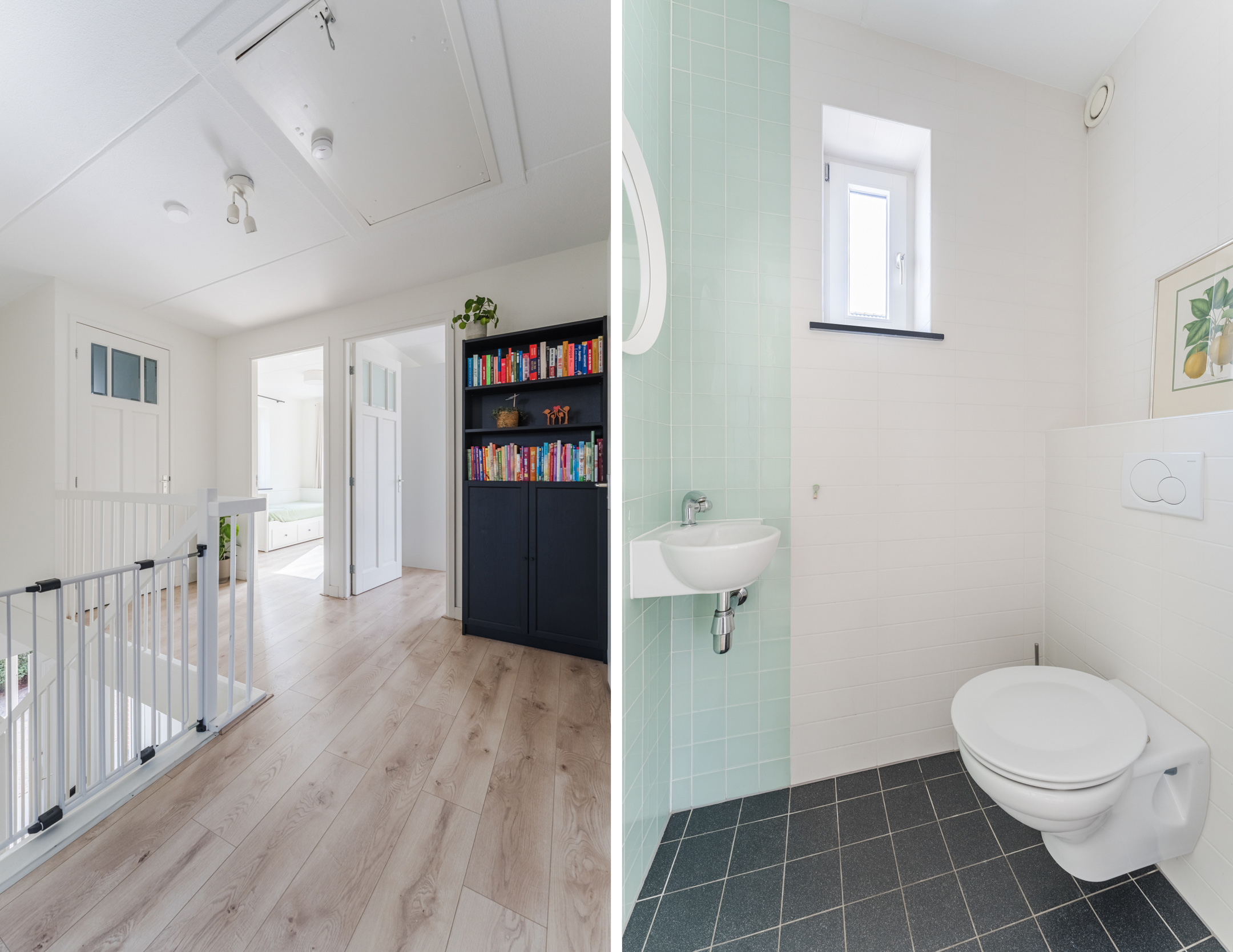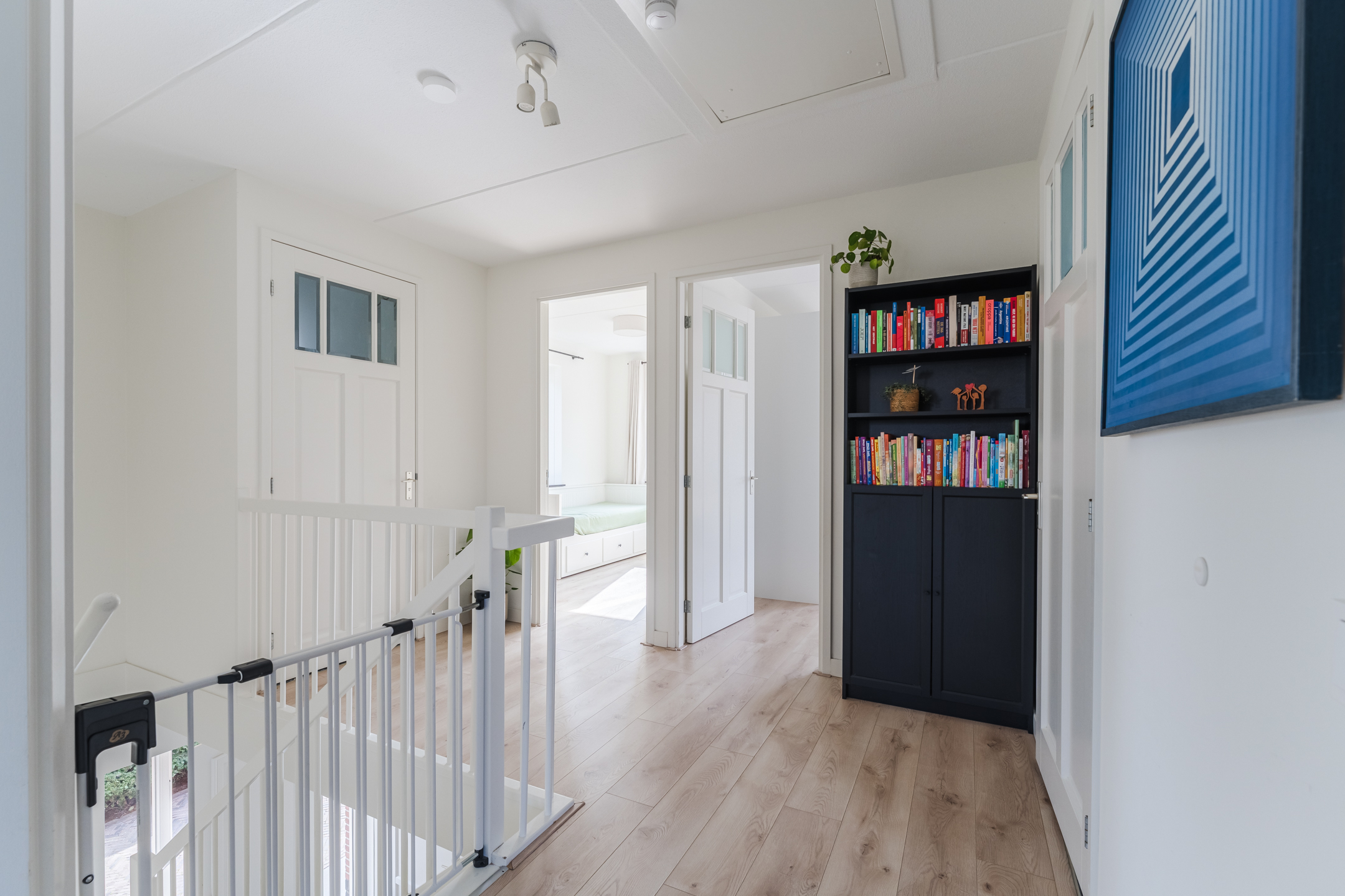 Overloop, toegang tot de badkamer, het separate toilet en vier multifunctionele (slaap)kamers.