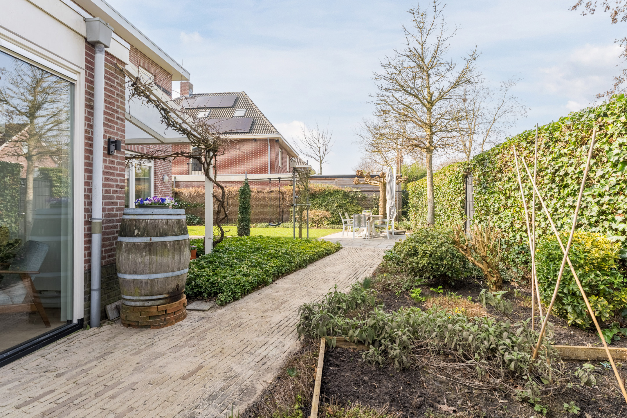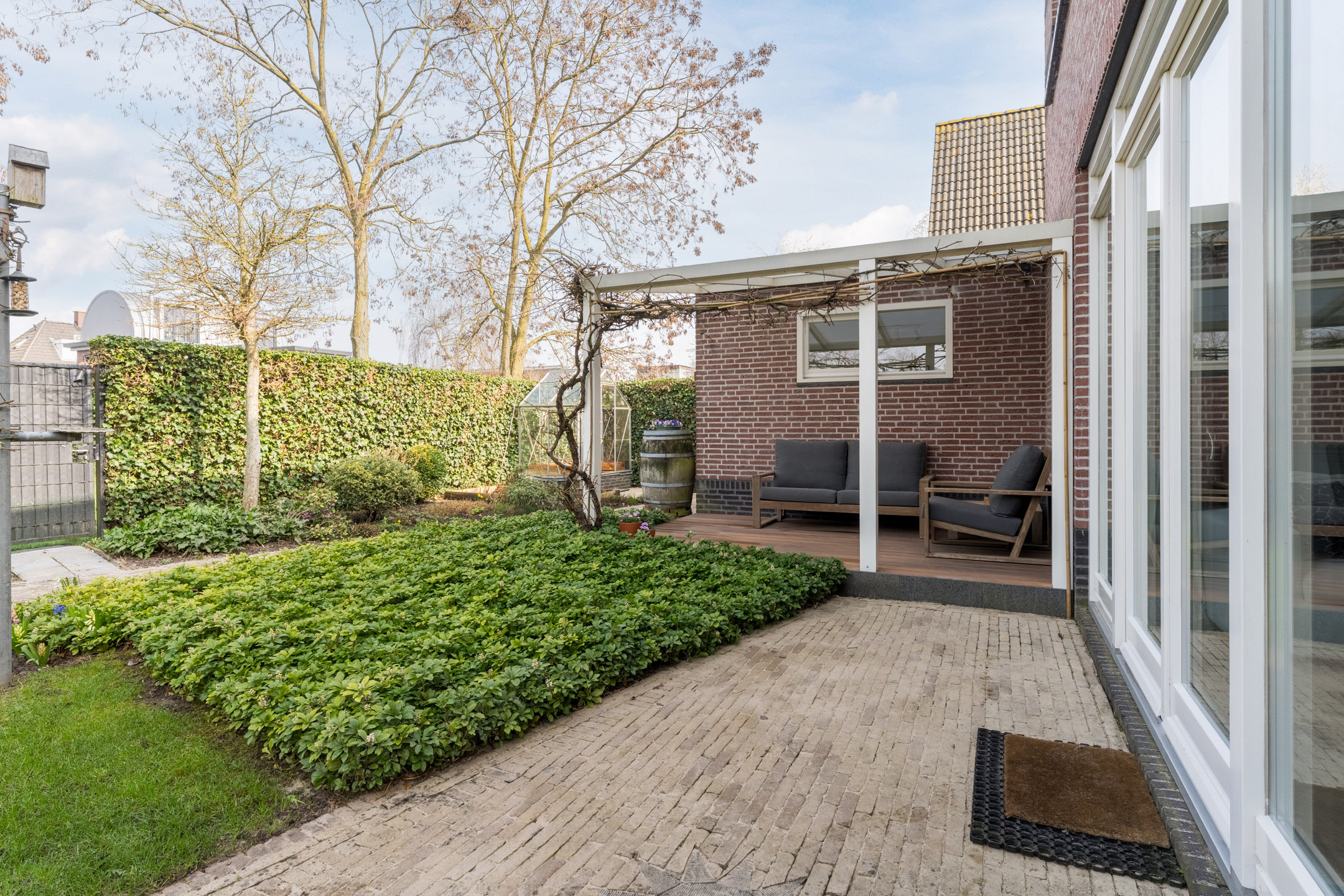 De fraai aangelegde voor-, zij- en achtertuin vormen een heerlijke plek om van het buitenleven te genieten. Vanuit de woonkamer geven openslaande deuren toegang tot de achtertuin en tevens is de tuin bereikbaar via de kantoorruimte. In de achtertuin bevinden zich een fijn terras, een sfeervolle overkapping, een groen gazon en kleurrijke plantenborders. Tevens beschikt de tuin over een moestuin en een kas waar u uw eigen groenten kunt verbouwen. Ook is er ruimte voor de trampoline, waardoor ook kinderen hier volop speelruimte hebben. De voor- en achtertuin zijn gescheiden middels een poort met afsluitbare deur voor extra privacy. Doordat de tuin gesitueerd is rondom de woning is er op ieder moment van de dag een plek in de zon of schaduw te vinden.