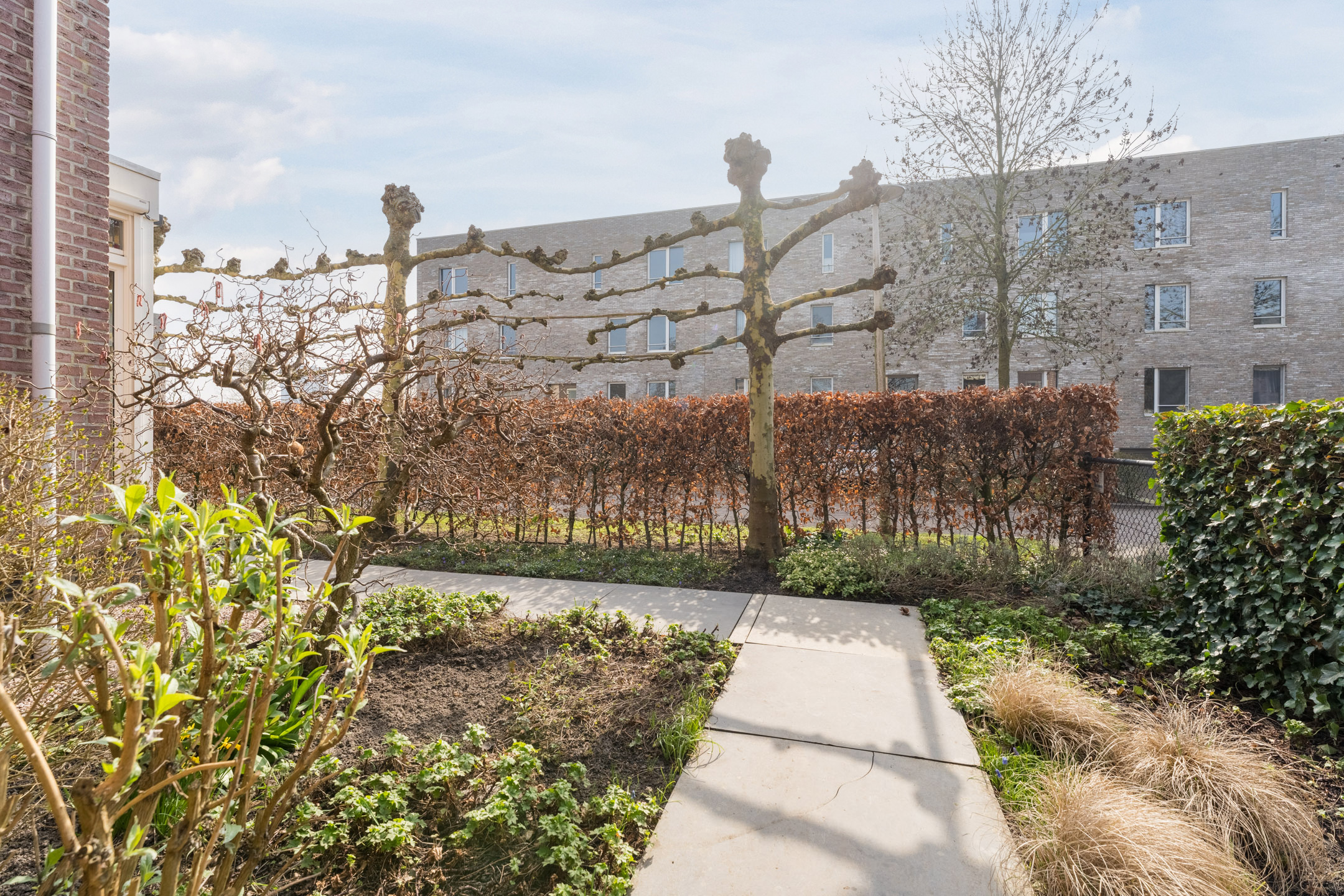 Er is een achterom naar de achtergelegen groenstrook met wandelpad en mooie hoge bomen. Dit biedt een fijn verlengstuk van de al riante tuin en zorgt voor een extra gevoel van ruimte en rust van de woning en de tuin en de aanwezigheid van veel vogels en soms zelfs egels en een haas.