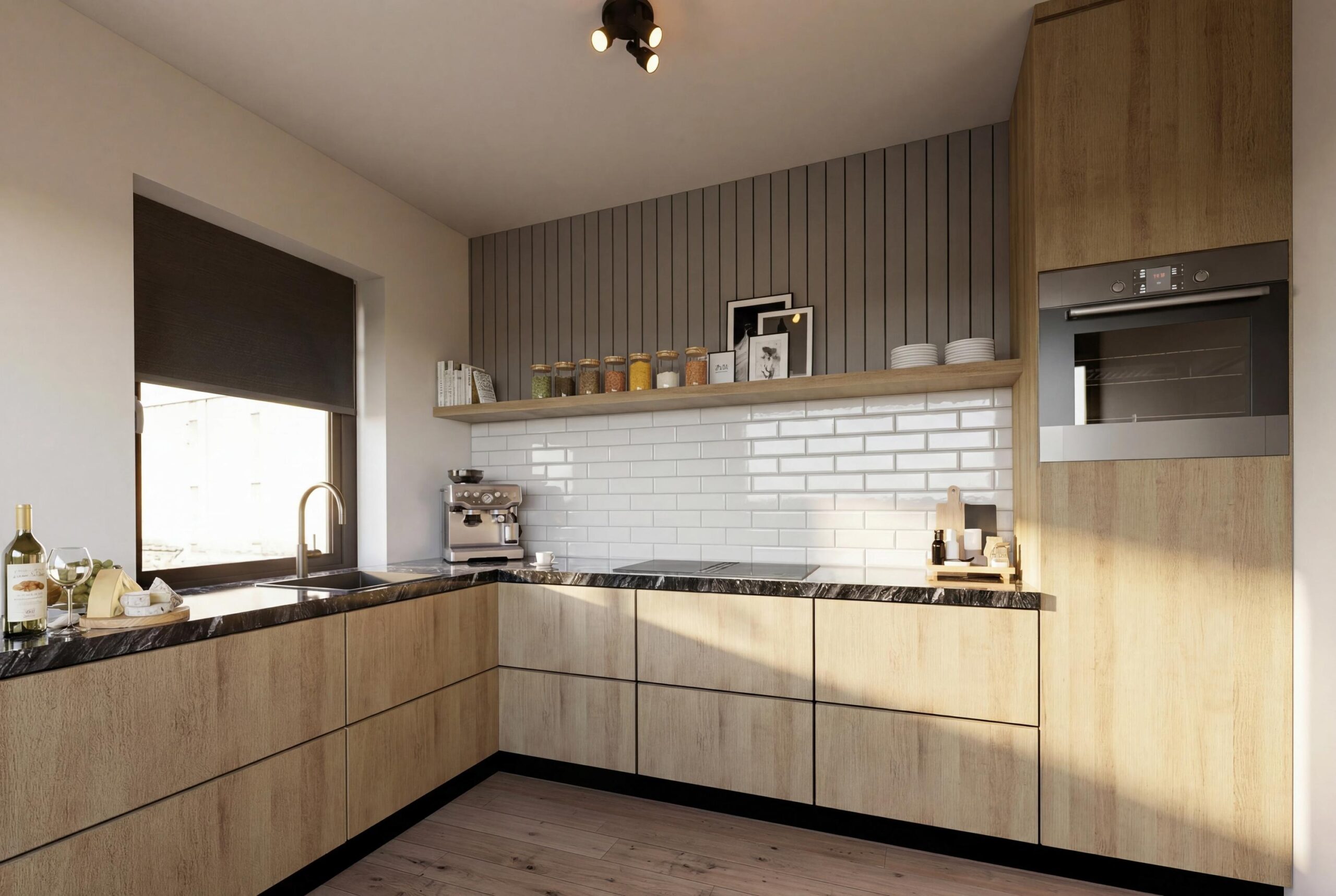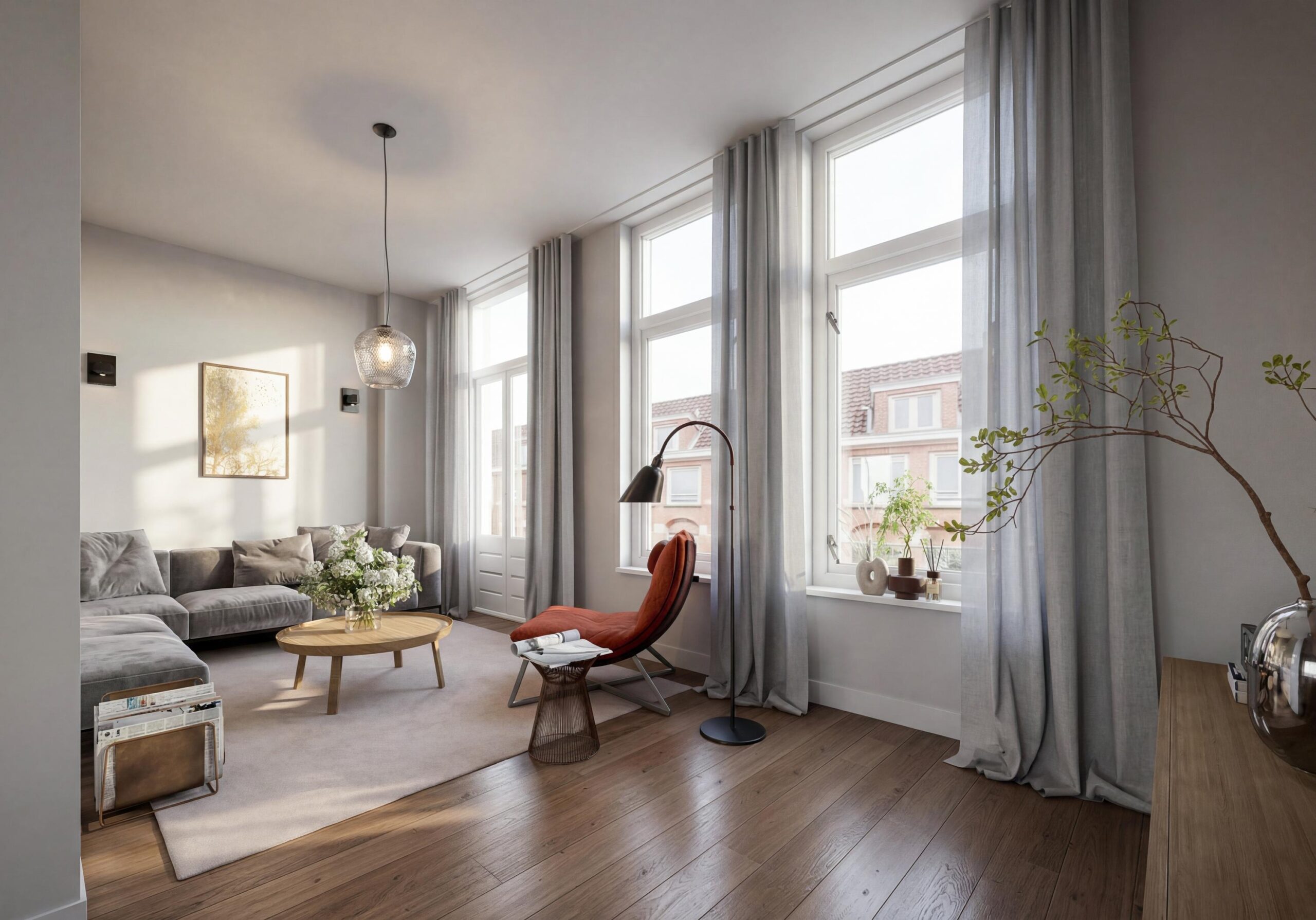 Middels artist impressions laten we zien wat de potentie is van de woning om het afwerkingsniveau naar een hoger level te tillen. Bijvoorbeeld een moderne, open en luxe keuken. De lichte woonkamer is ingericht met een zitgedeelte aan de voorzijde en een eetgedeelte naast de keuken. Zo creëer je een heerlijk open en lichte woonverdieping!