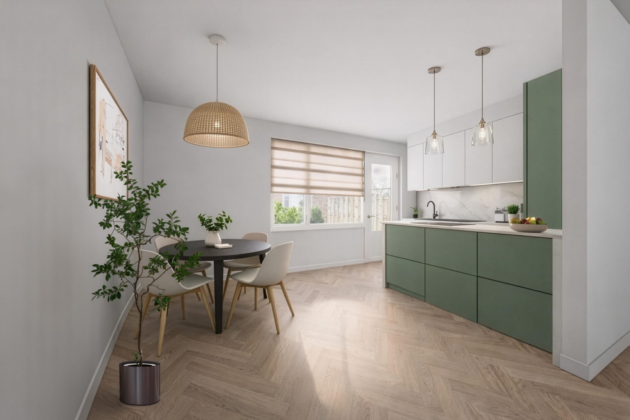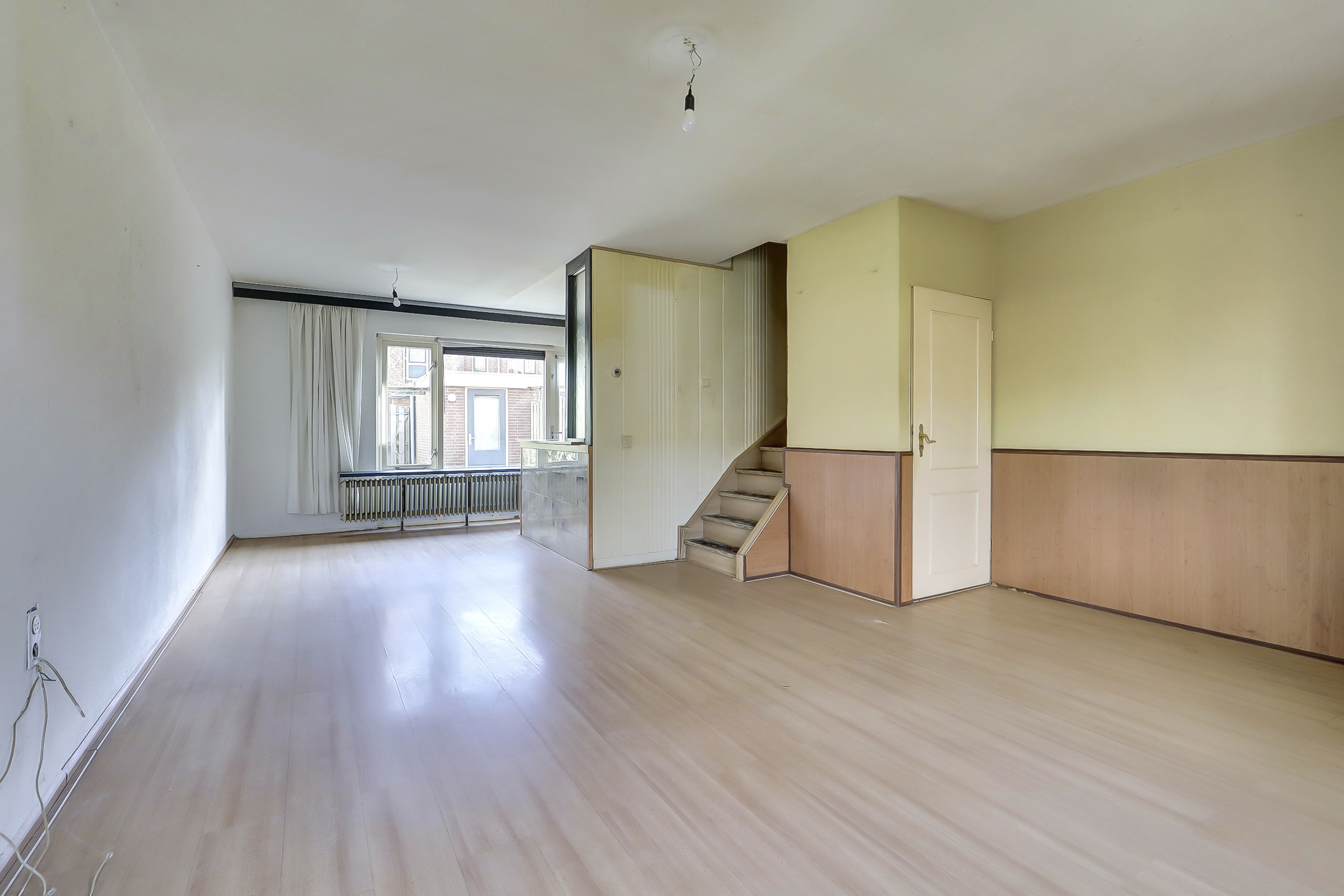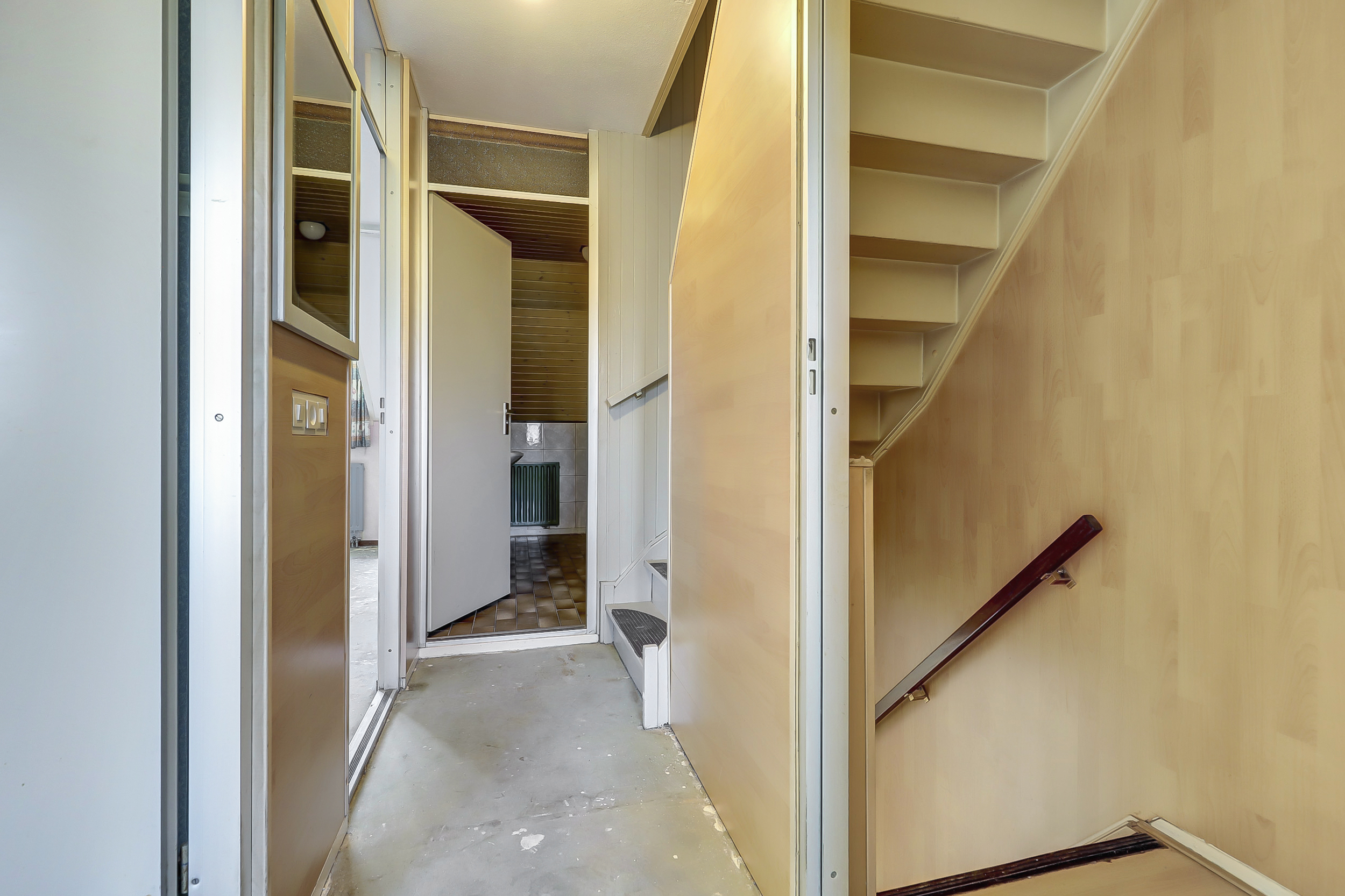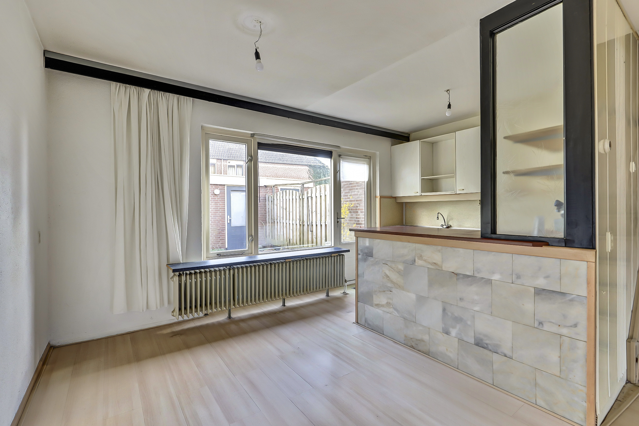 Begane grond: Entree, toilet, meterkast en doorgang naar woonkamer. De doorzonwoonkamer biedt een mooi uitzicht op zowel de voor- als achtertuin. Naast het woonblok is een groen speelveldje, ideaal voor kinderen om fijn te kunnen spelen. De open keuken aan de achterzijde van de woning geeft toegang tot de achtertuin. Deze eenvoudige keuken beschikt over water-, gas- en elektra-aansluiting. De woonkamer is uitgerust met een vaste trap naar de eerste verdieping.