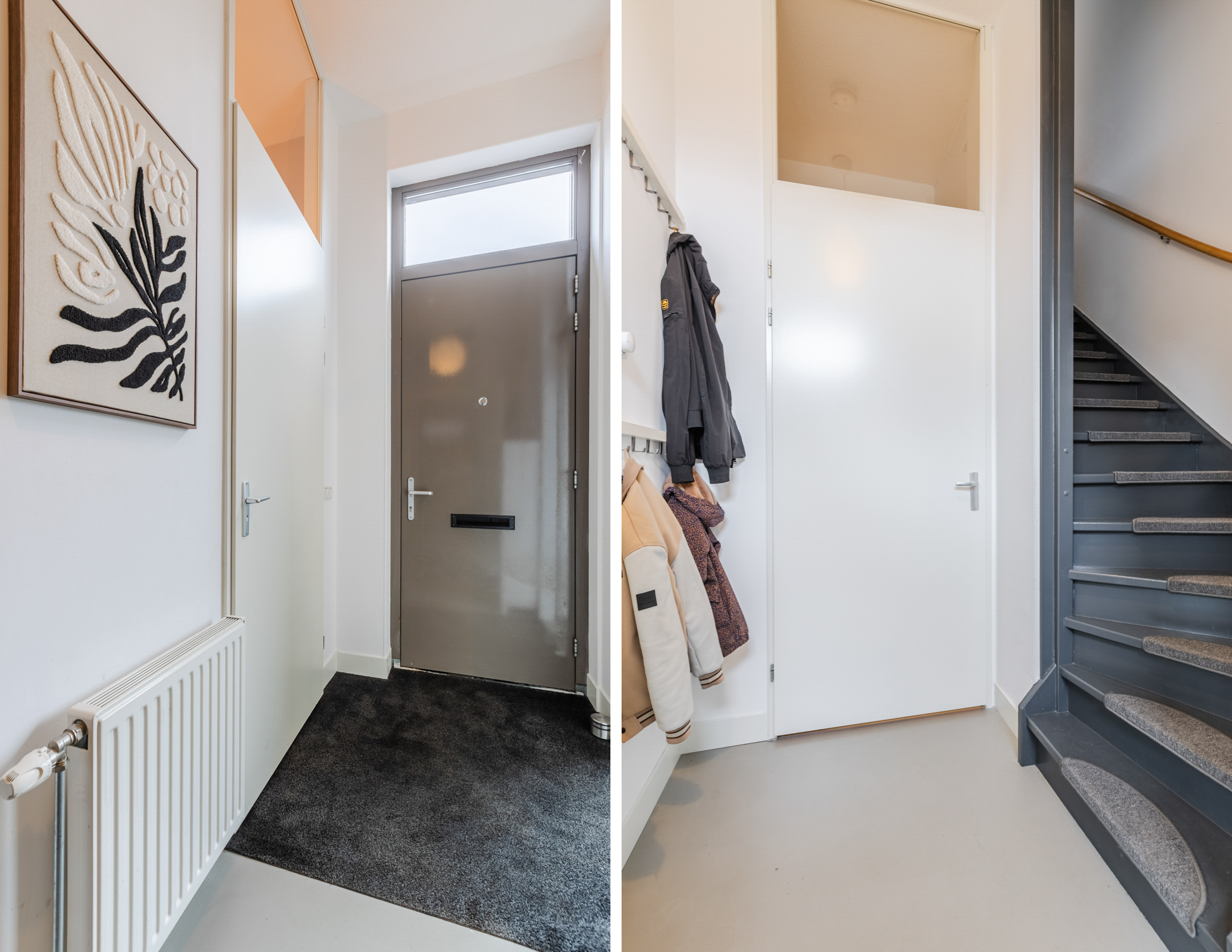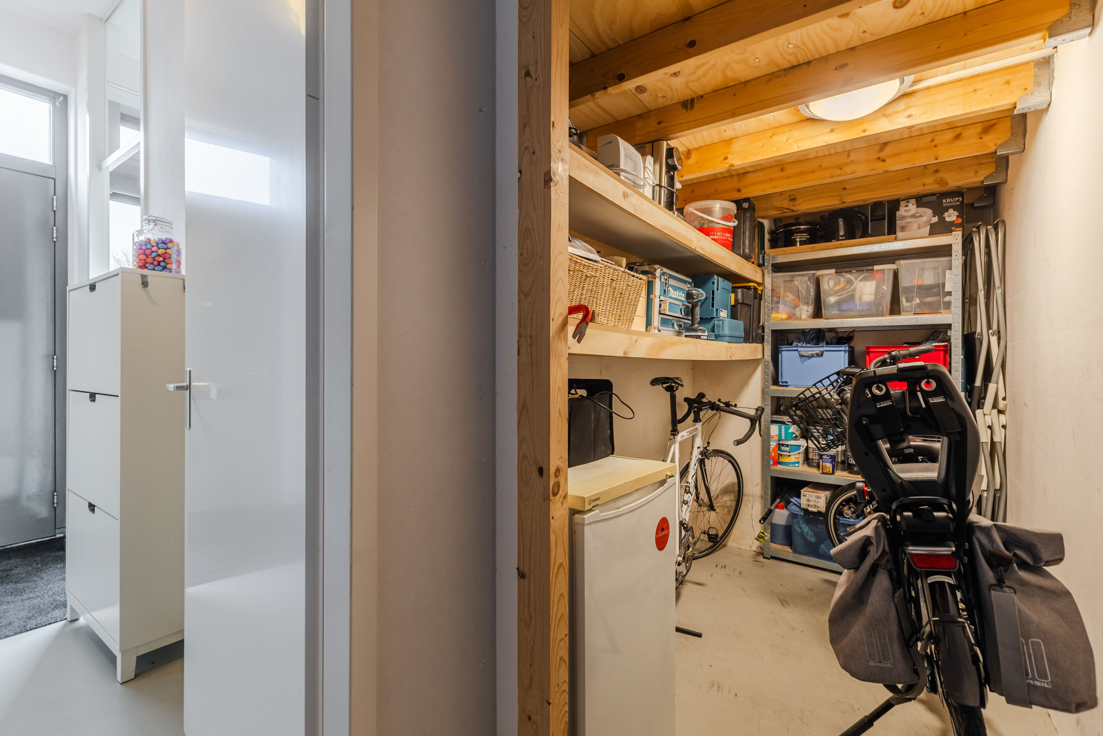 Entree, hal, garderobe, toiletruimte met hangend toilet, urinoir en fontein. In de hal bevinden zich tevens de meterkast, de inpandige berging met trapkast en de toegang tot een multifunctionele (slaap)kamer aan de voorzijde, ideaal als werkruimte, praktijkruimte of slaapkamer. Vanuit de berging heb je toegang tot de parkeergarage, waar zich direct jouw eigen parkeerplaats bevindt.