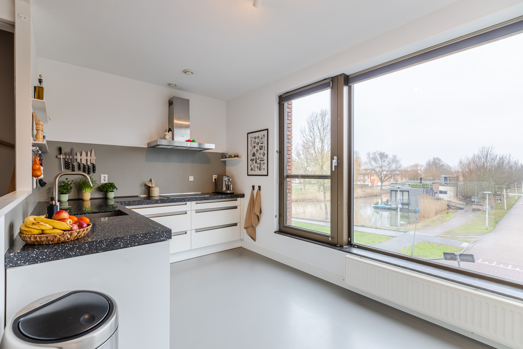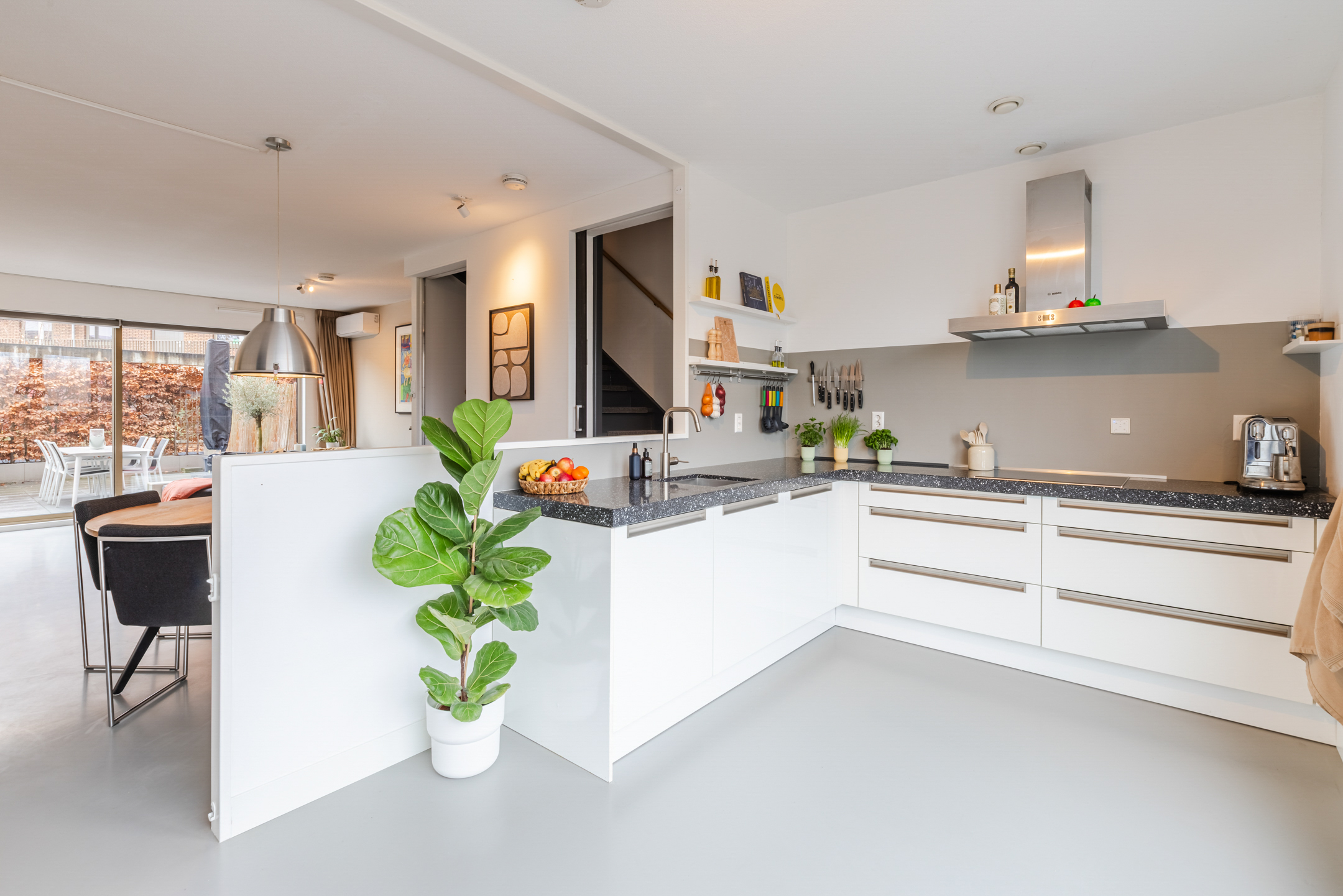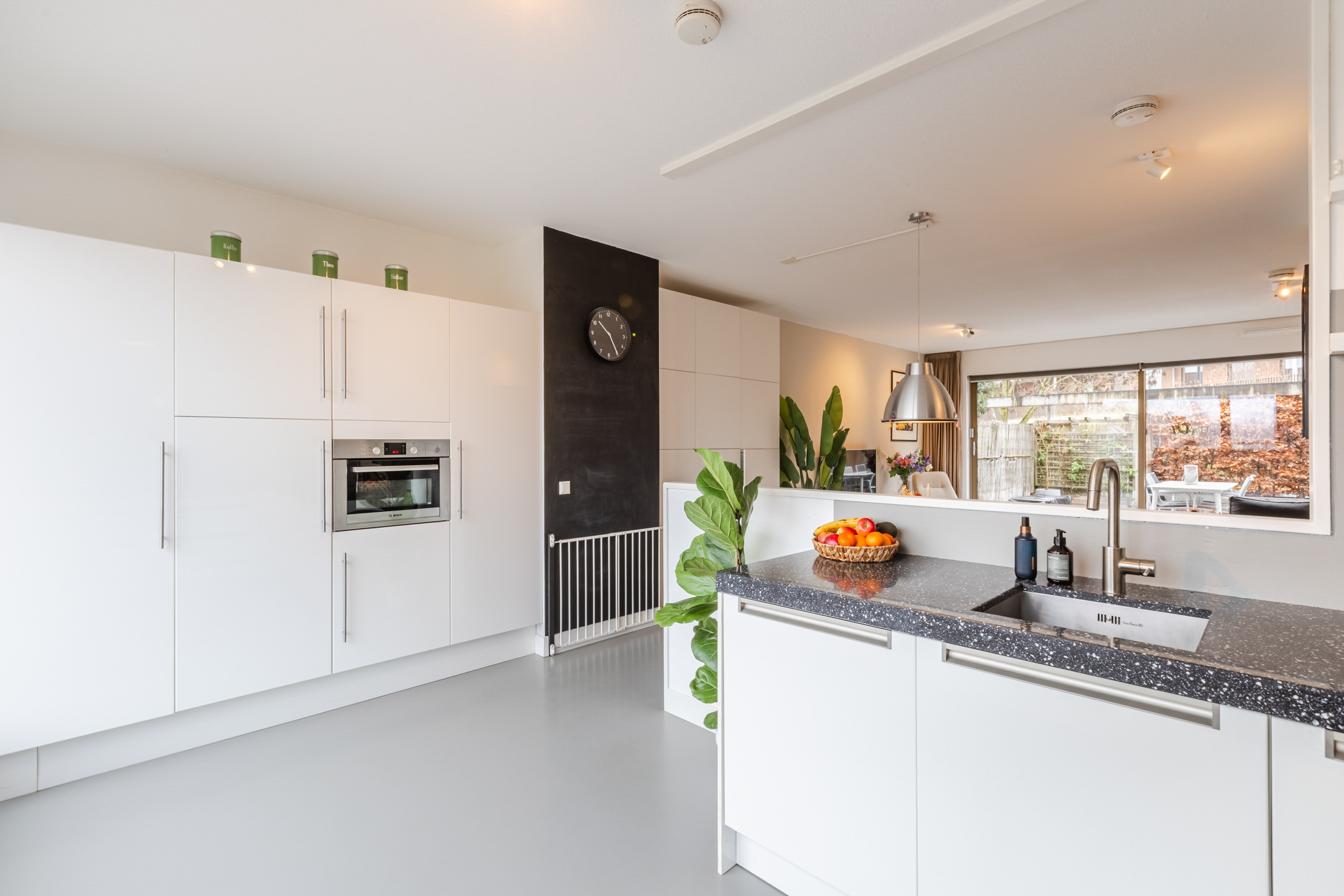 Aan de voorzijde van de woning bevindt zich de moderne halfopen keuken. De keuken is geplaatst in een ruime hoekopstelling met keukenwand en uitgevoerd in hoogglans wit met een zwart composiet werkblad. Deze verzorgde en complete keuken is tevens voorzien van alle wenselijke inbouwapparatuur, te weten: een inductiekookplaat, een combi-oven/magnetron, een koelkast, een vriezer, een vaatwasser en een afzuigkap.