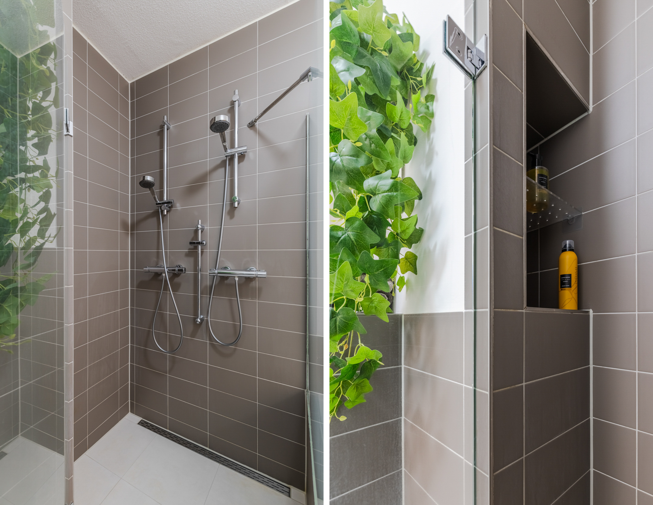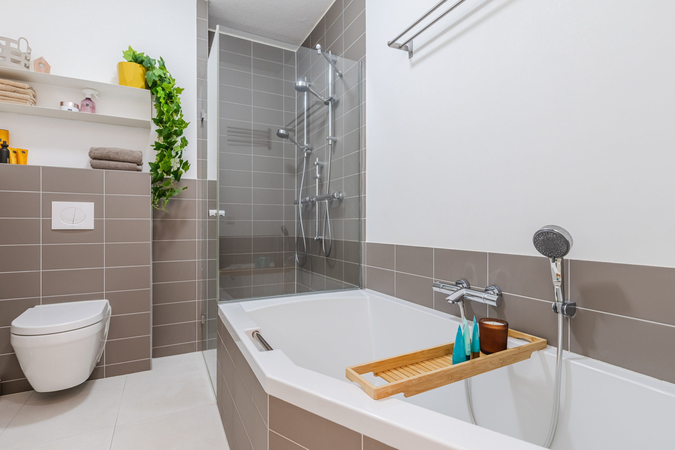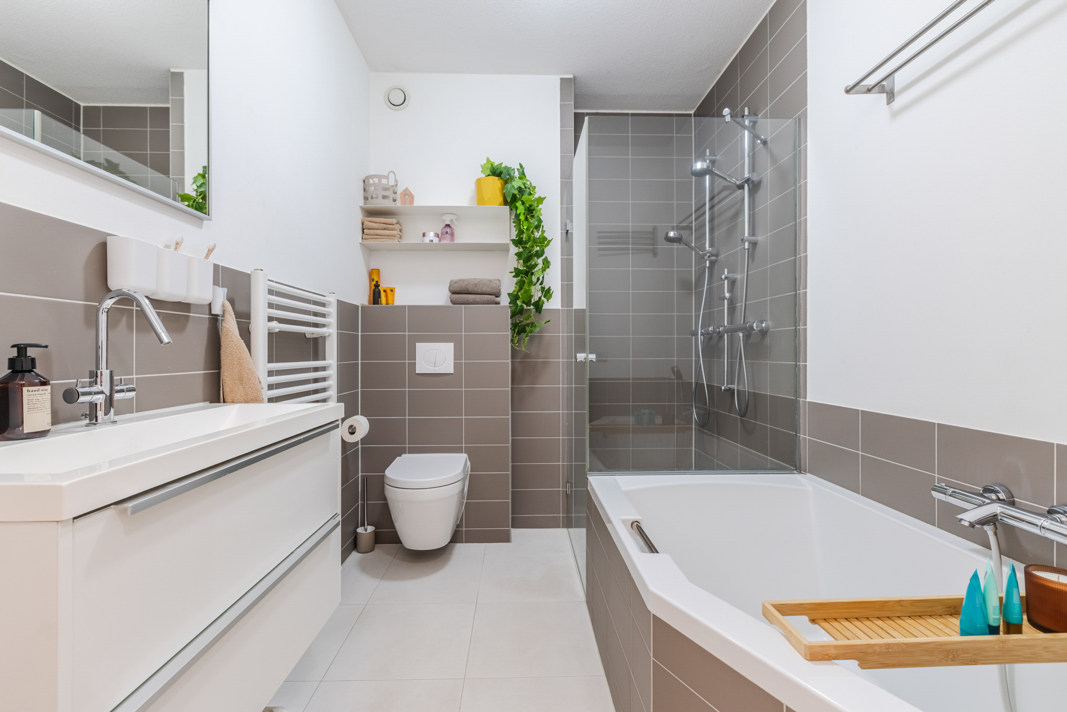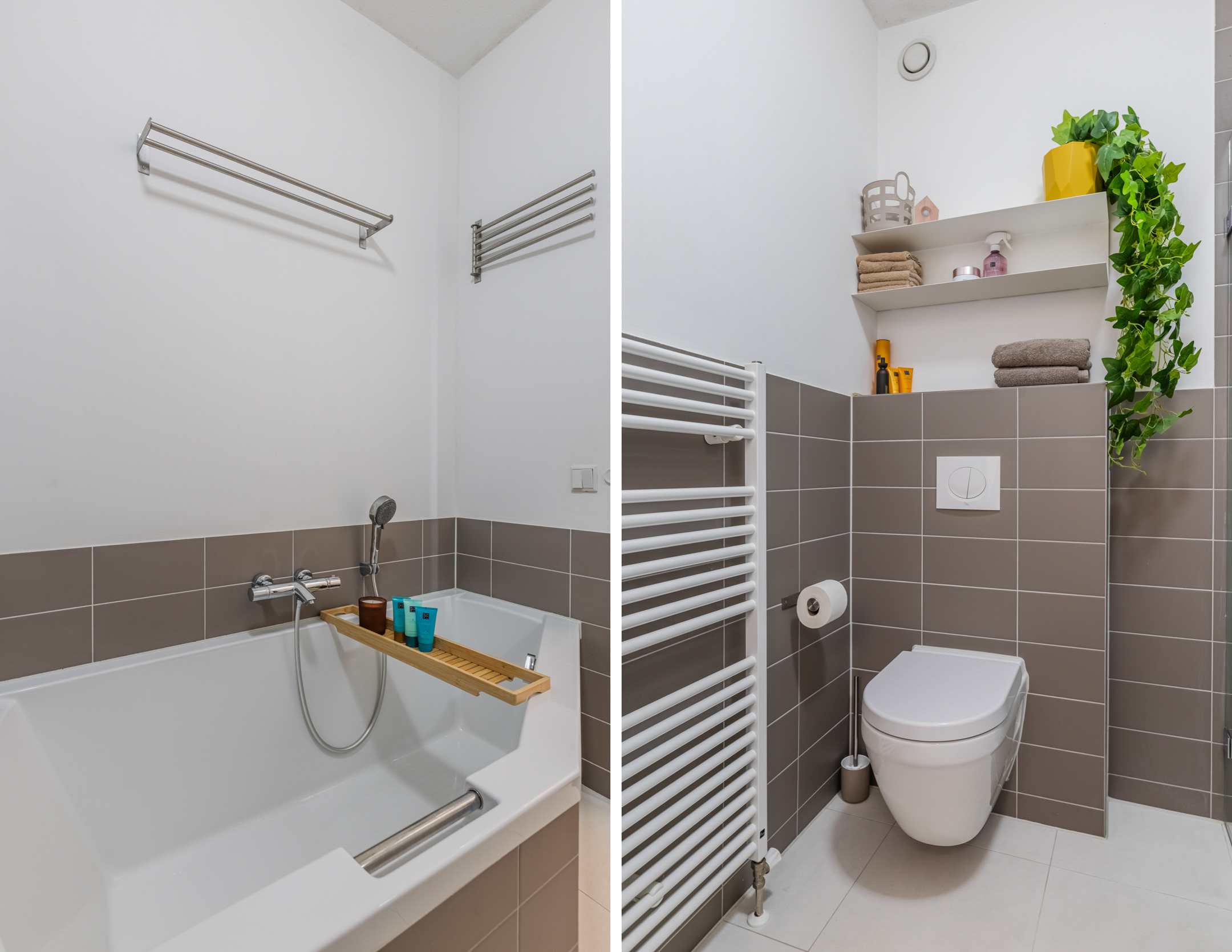 In het midden bevindt zich de inpandige badkamer, uitgevoerd met warmgrijze wandtegels en licht beige vloertegels (Mosa). Deze moderne en complete badkamer is voorzien van een douchecabine met nis, een ligbad, een wastafel met meubel, een tweede toilet en mechanische ventilatie.