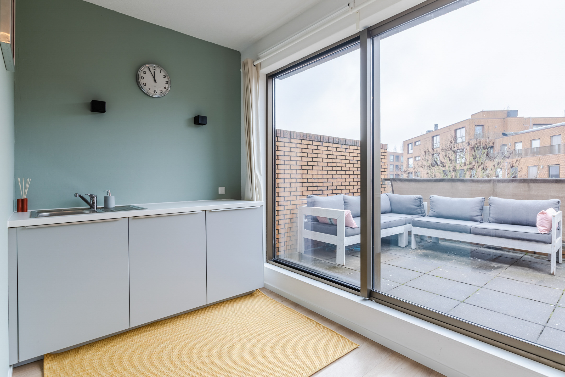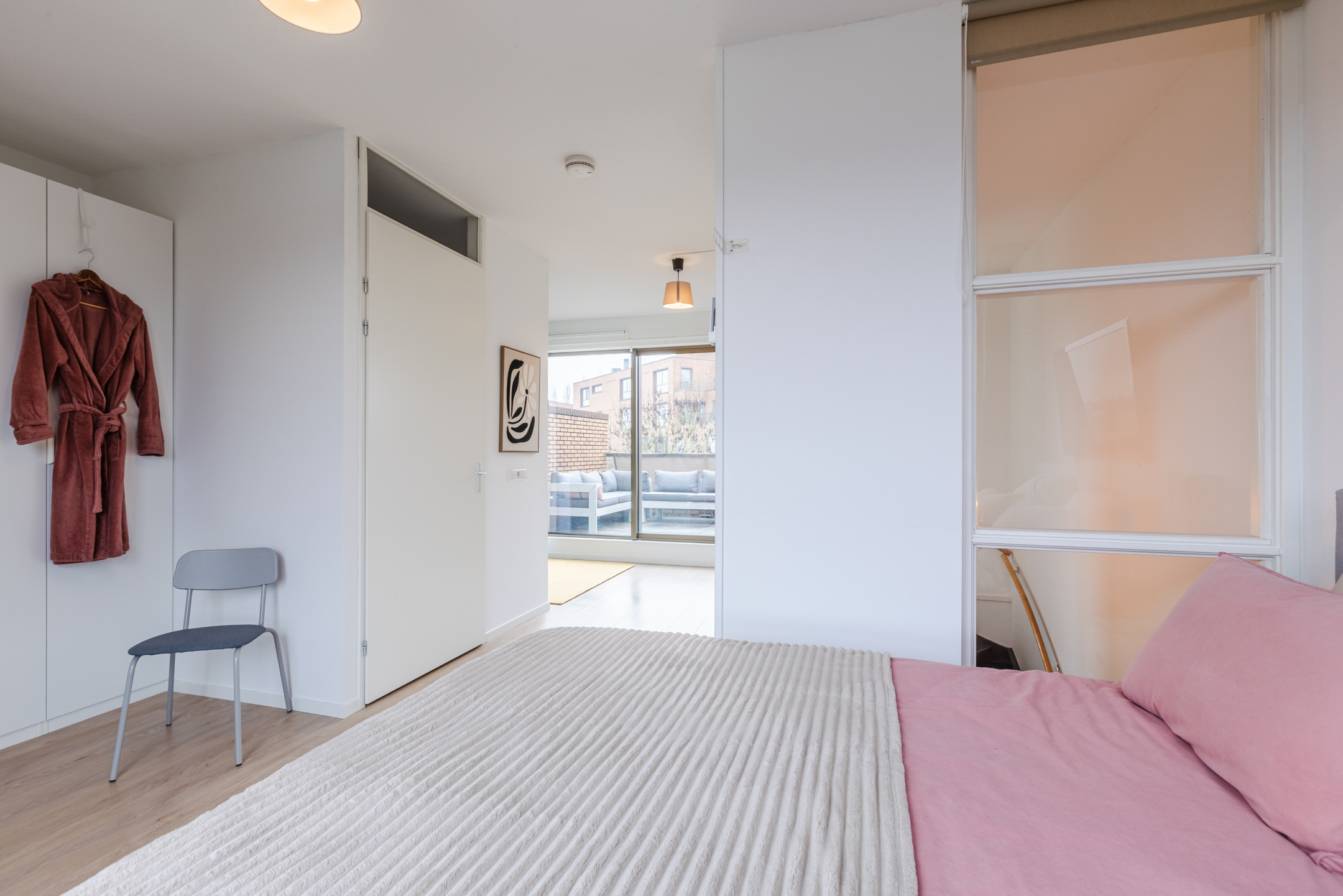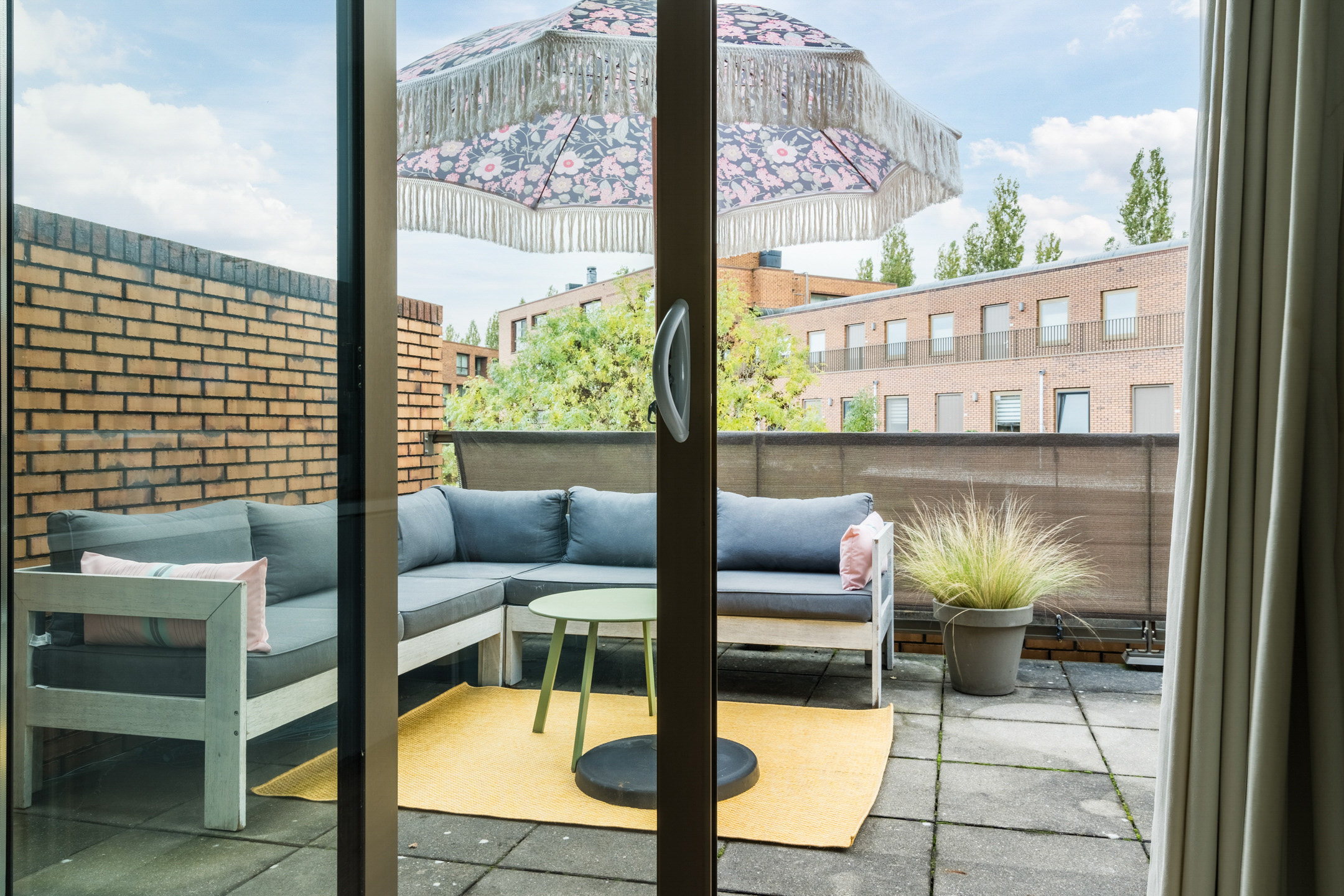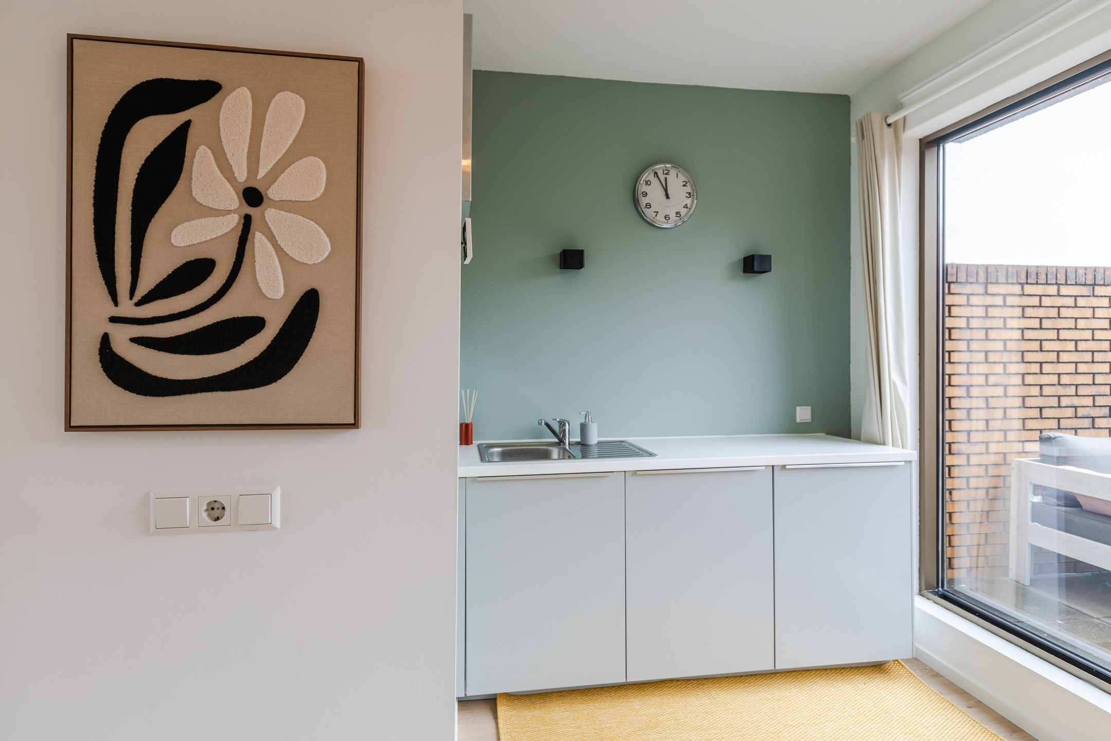 Vanuit de pantry aan de achterzijde heb je, middels een schuifpui, toegang tot het heerlijke dakterras op het zonnige zuiden, waar je in alle rust kunt genieten van het zonnetje.