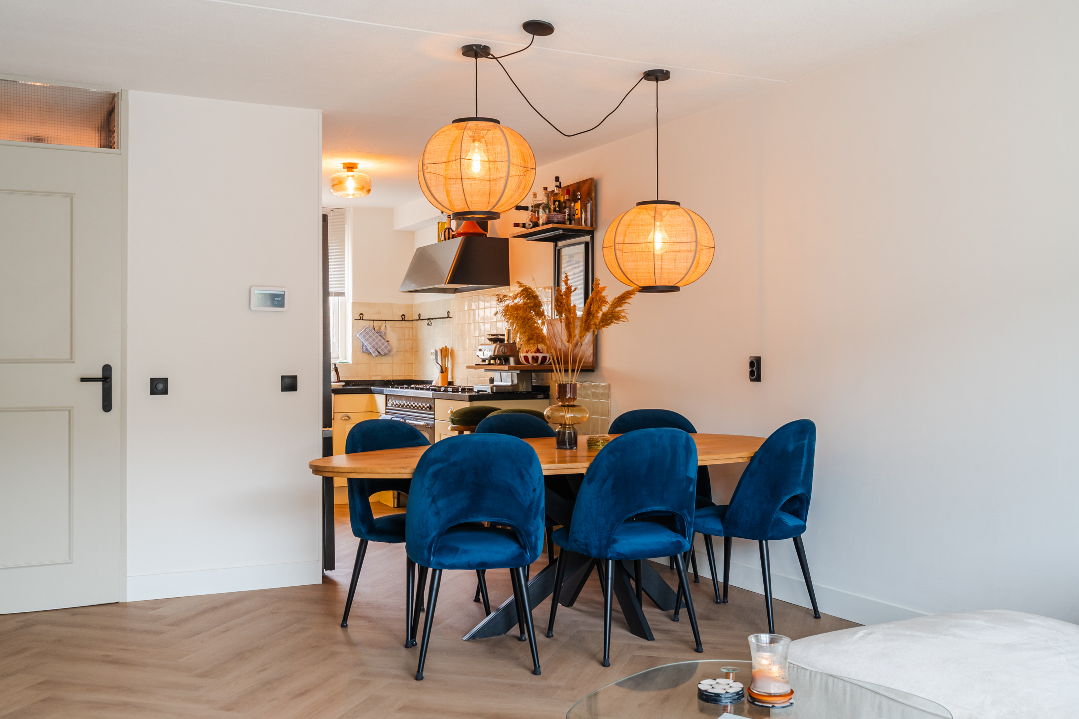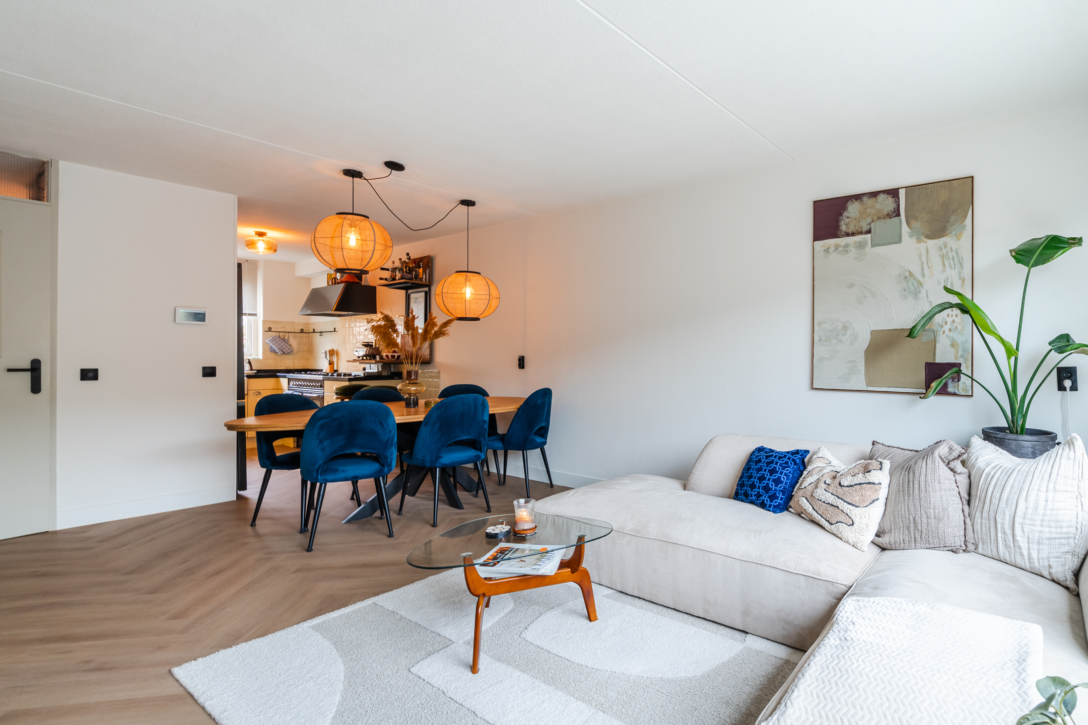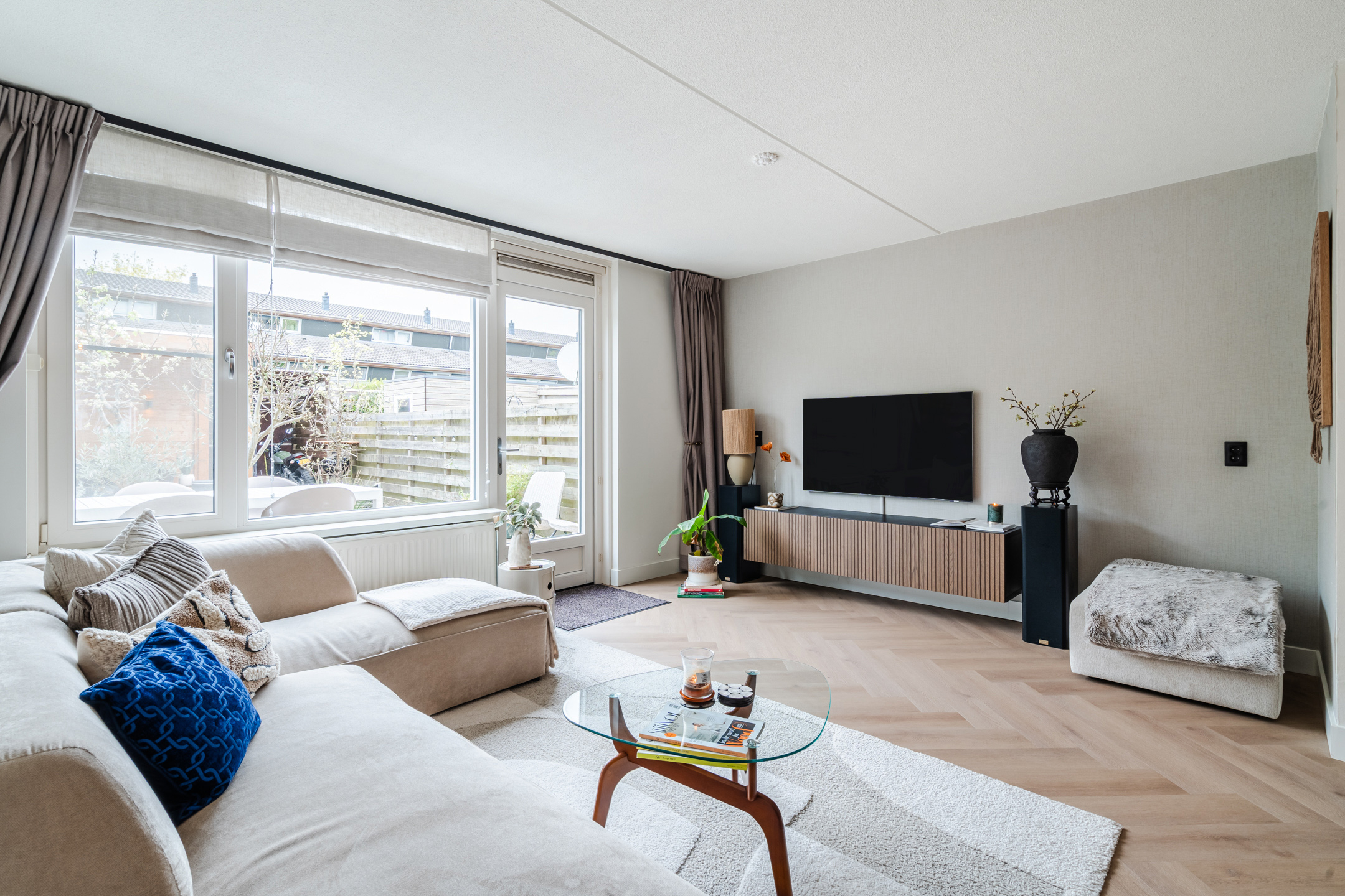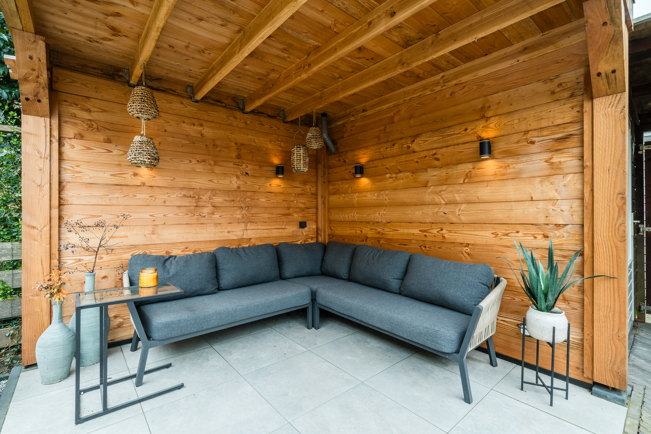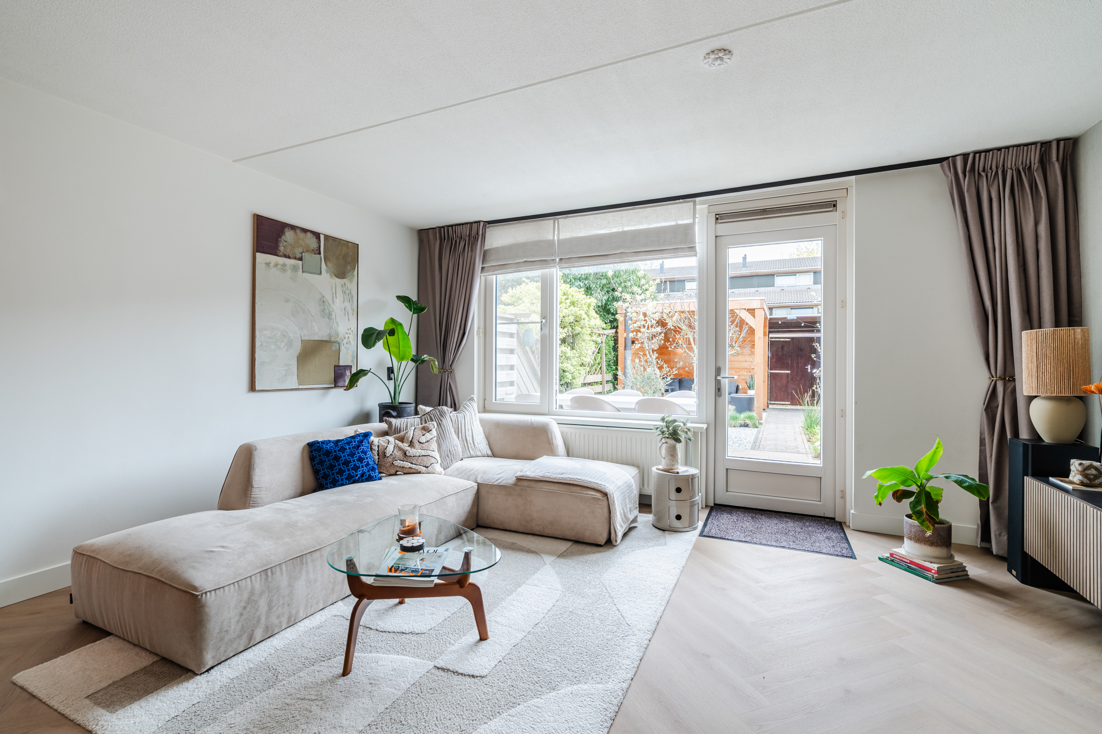 Aan de achterzijde van de woning bevindt zich de sfeervolle, tuingerichte woonkamer. Door de grote raampartijen geniet je hier van een prettige lichtinval en een fijn uitzicht op de tuin. Via de deur stap je zo de zonnige achtertuin in, ideaal voor lange zomeravonden, een kop koffie in de ochtendzon of een gezellige barbecue met vrienden en familie.