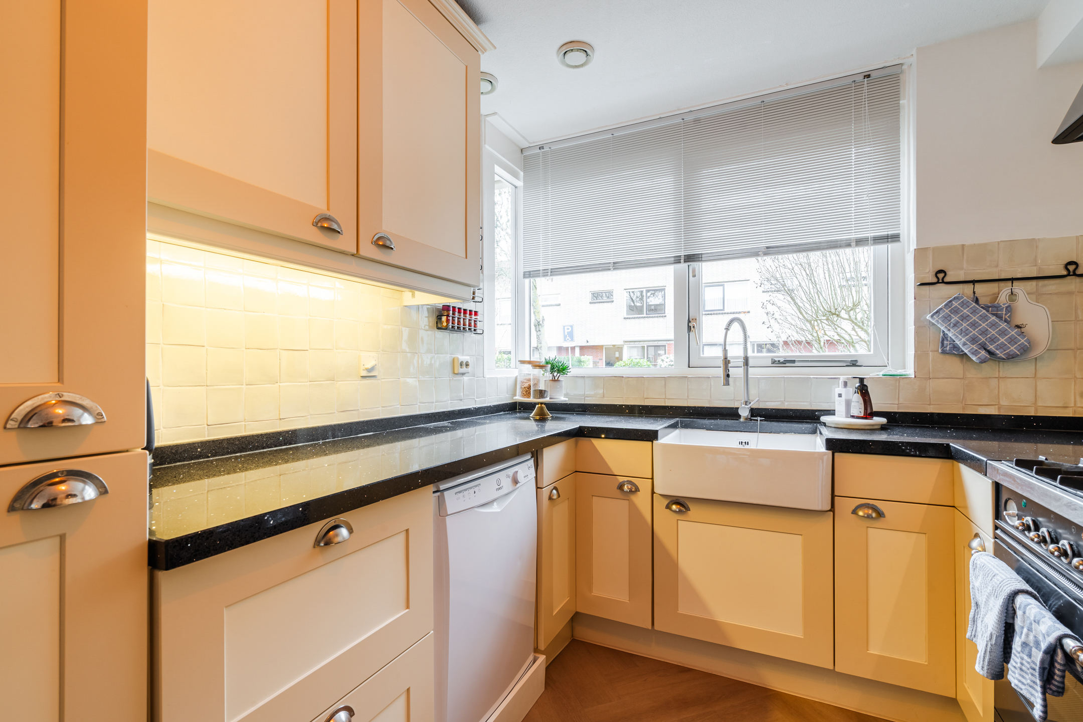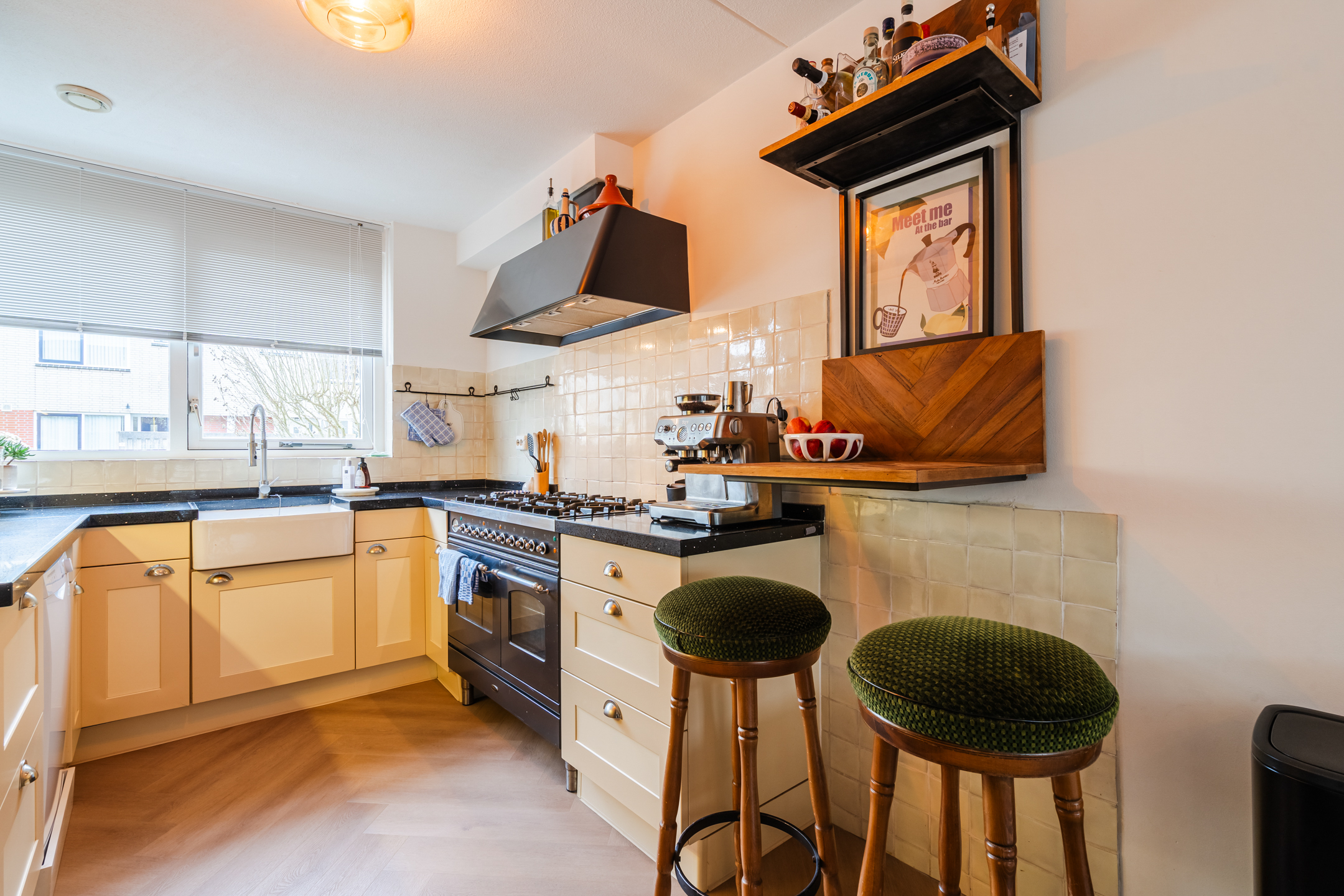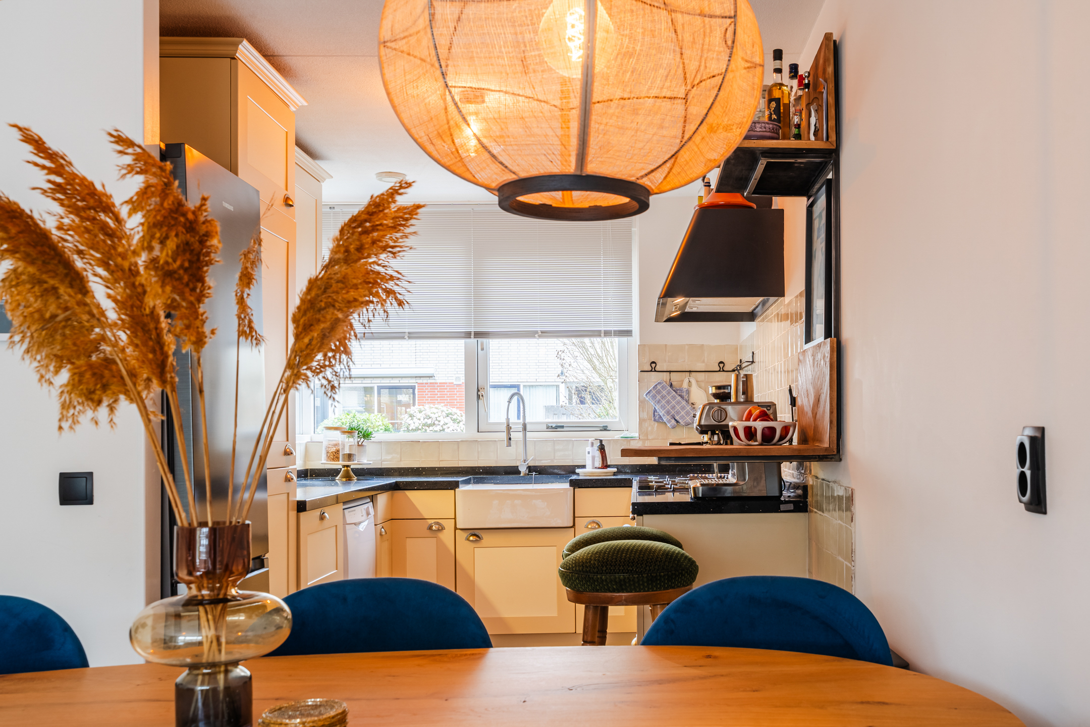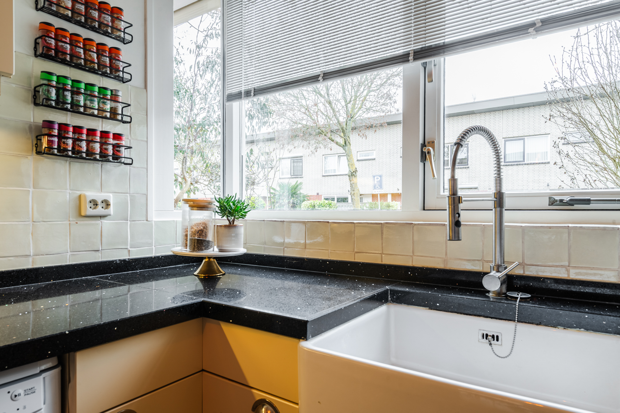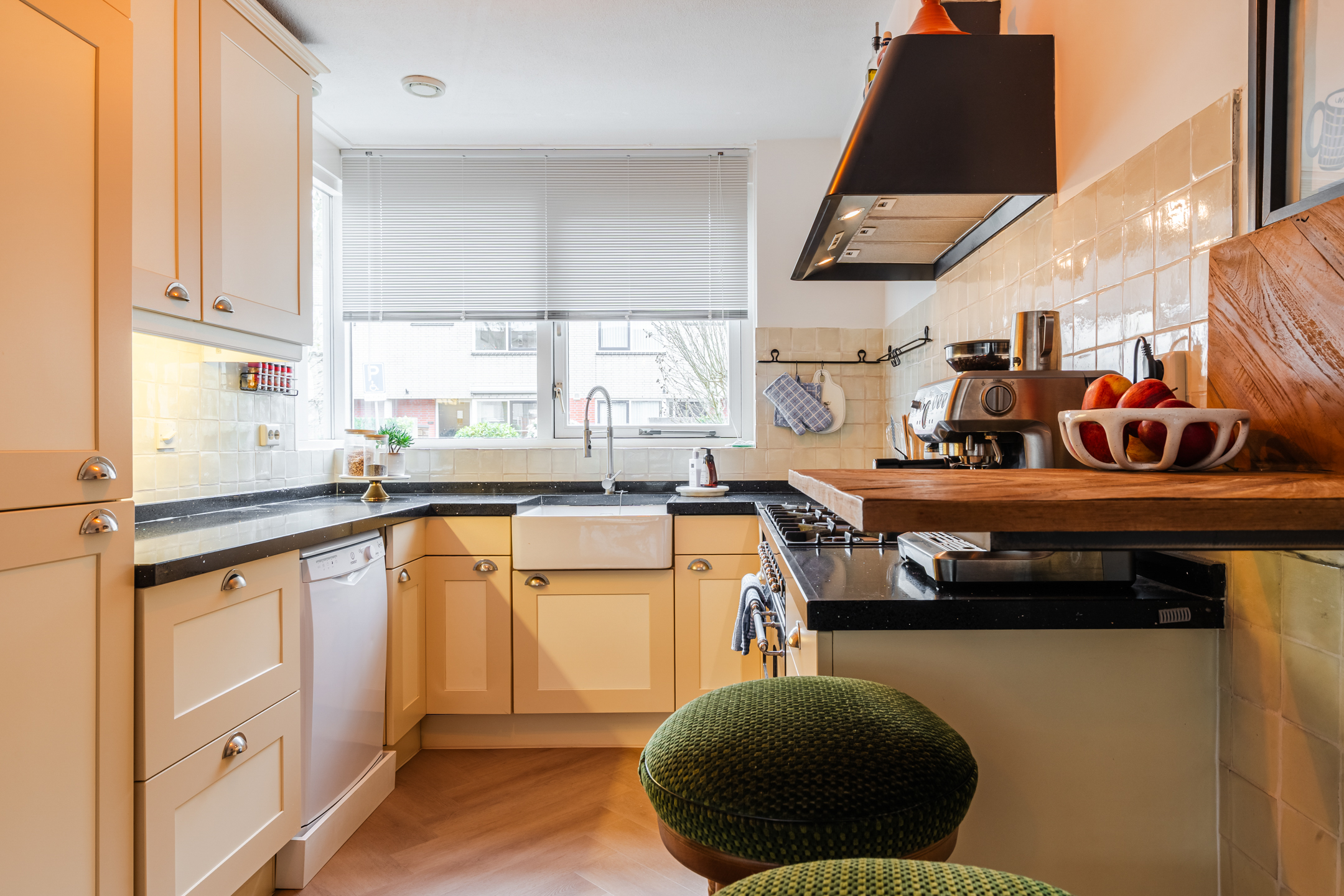 Aan de voorzijde van de woning bevindt zich de royale, open keuken. Een heerlijke plek voor kookliefhebbers en gezellig samenzijn. De keuken is opgesteld in een ruime U-vorm, waardoor je profiteert van veel werk- en opbergruimte. De combinatie van crème kleurige fronten met een stijlvol zwart composieten werkblad geeft het geheel een tijdloze en charmante uitstraling. Dankzij de vele (brede) pannenlades en kastruimte is er volop plek voor al je keukengerei.