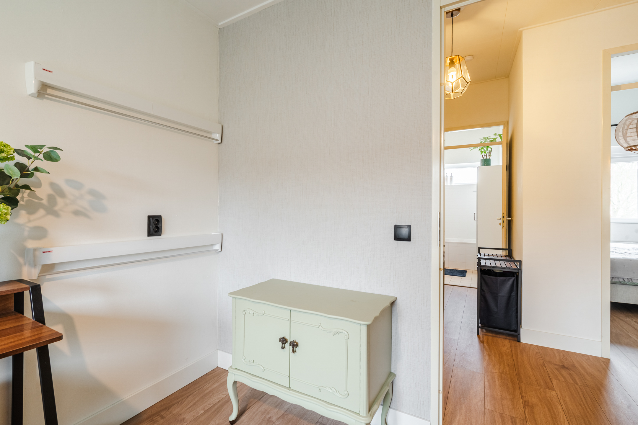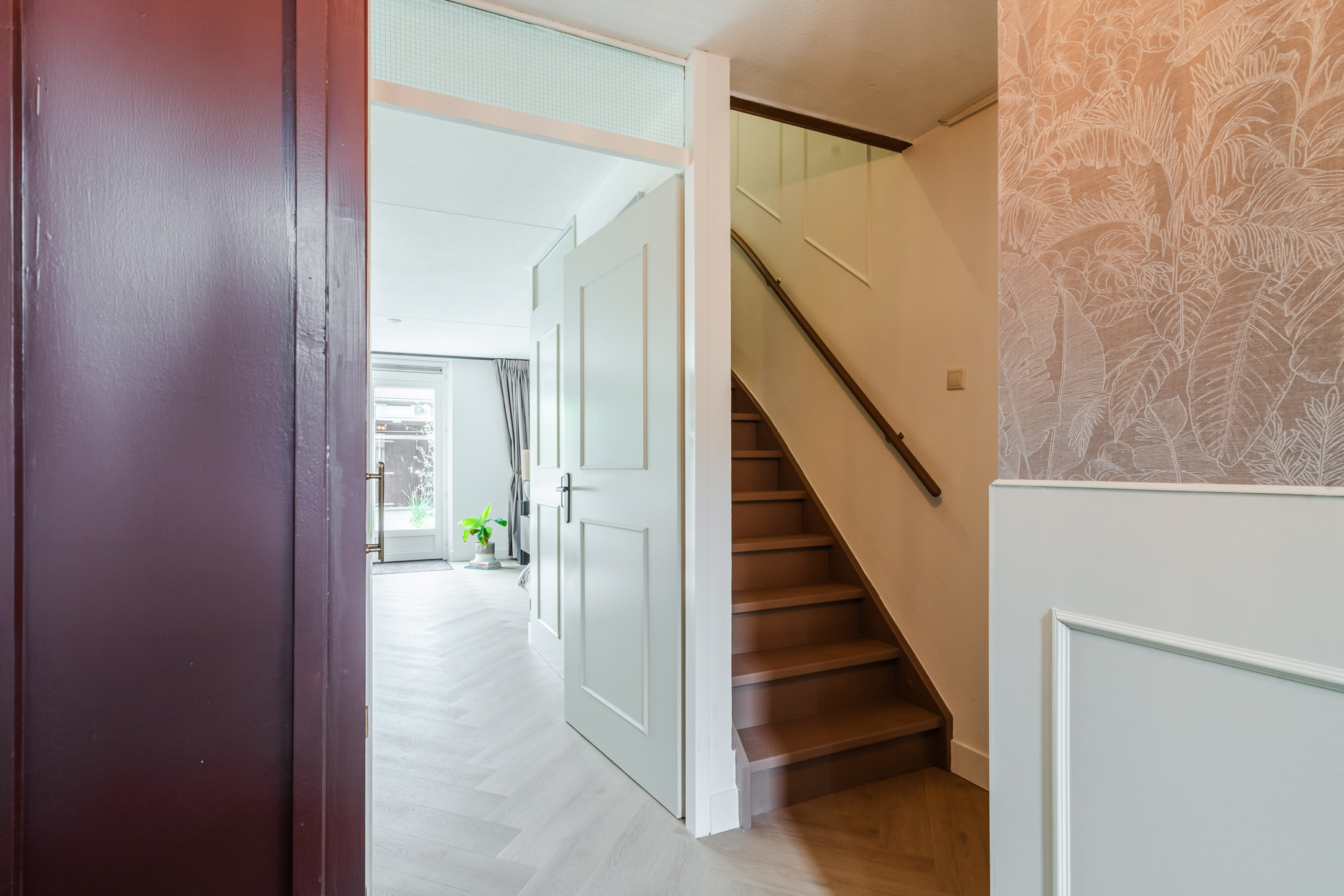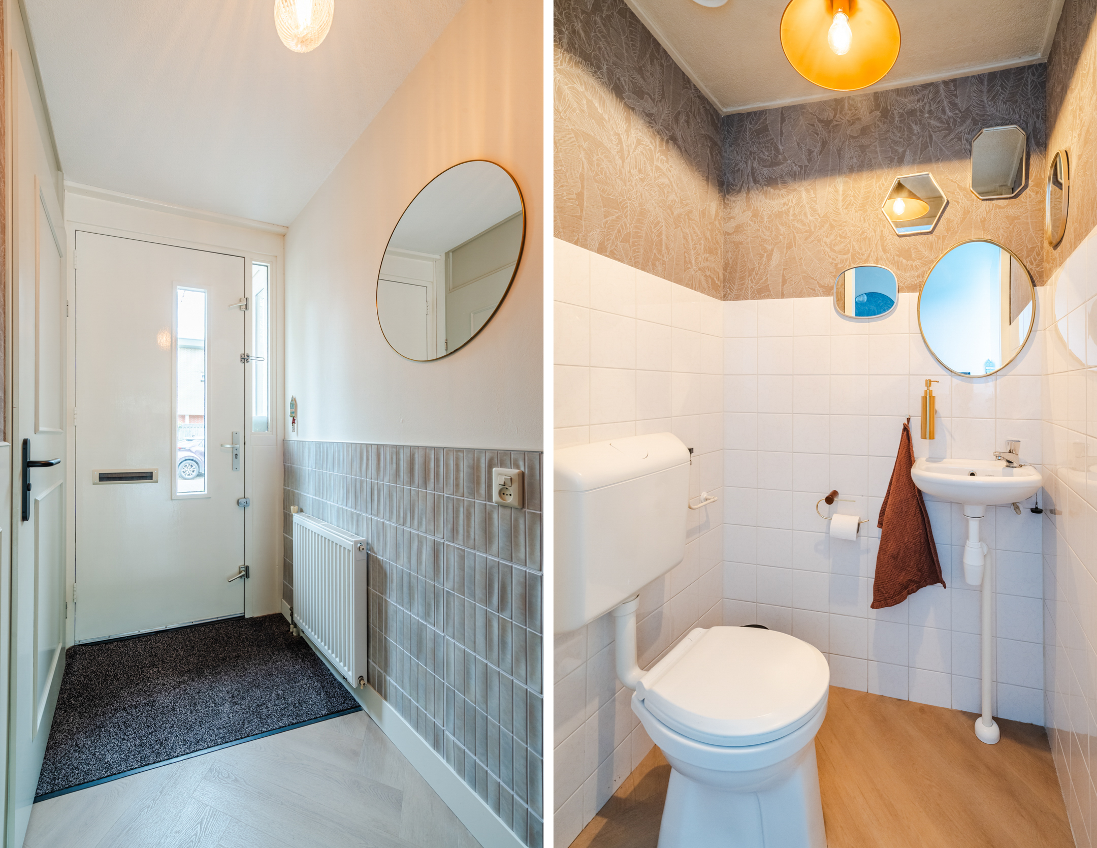 Via de fraai aangelegde, groene voortuin bereik je de entree van deze verzorgde woning. Bij binnenkomst kom je in de hal, waar je toegang hebt tot de meterkast, een praktische trapkast voor extra bergruimte en een nette toiletruimte voorzien van een toilet en fonteintje. Vanuit de hal loop je door naar zowel de woonkamer als de keuken.
