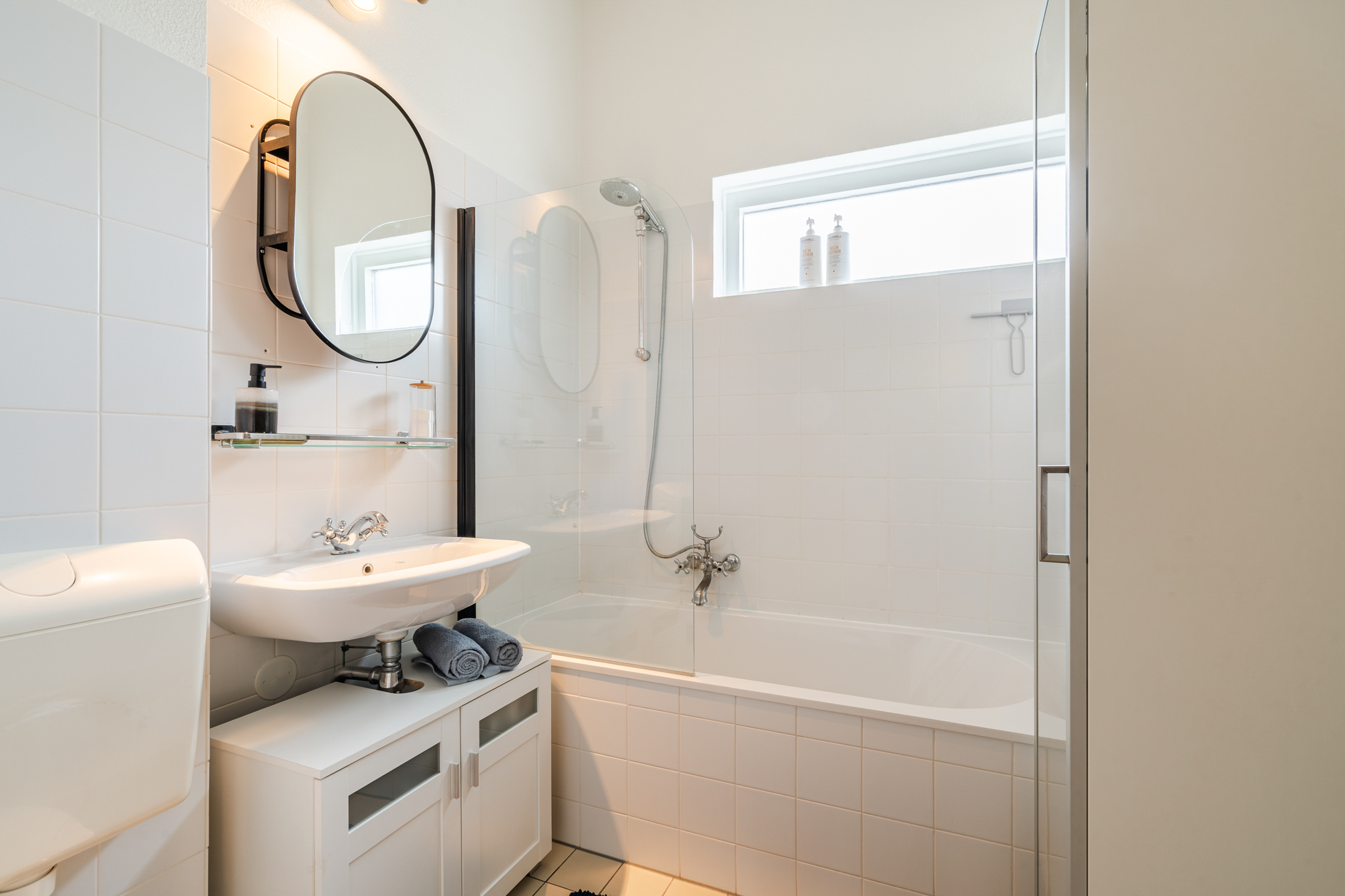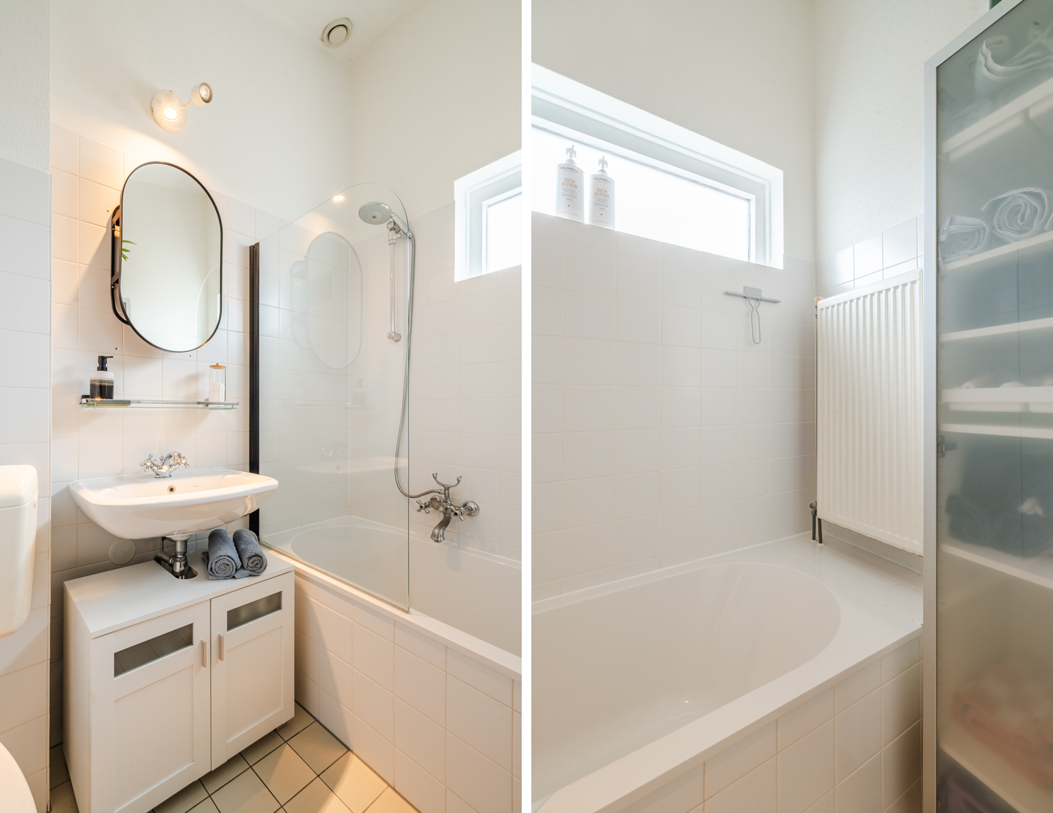 De badkamer is netjes onderhouden en uitgevoerd in een lichte, tijdloze kleurstelling, wat zorgt voor een frisse en verzorgde uitstraling. De ruimte is compleet ingericht met een ligbad met douchevoorziening, perfect voor zowel een snelle douche als een ontspannen bad moment, een wastafel, een tweede toilet en een spiegel. Daarnaast is er op deze verdieping een praktische kast aanwezig waarin zich de aansluiting voor de wasmachine bevindt, handig uit het zicht!