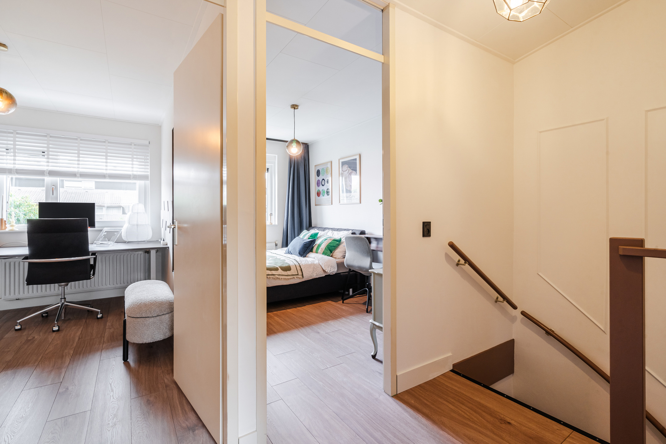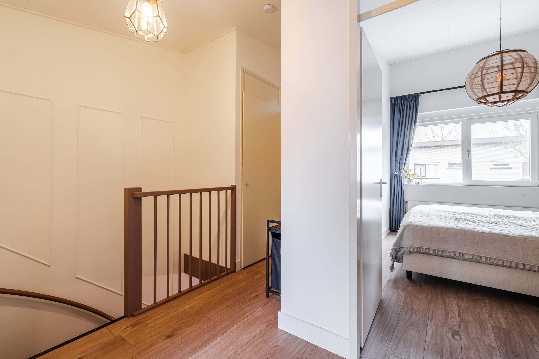 Via de trap bereik je de ruime overloop, die direct een gevoel van licht en ruimte geeft en toegang biedt tot drie volwaardige en multifunctionele (slaap)kamers en de badkamer. Op de overloop bevindt zich bovendien een praktische bergruimte, ideaal voor het netjes opbergen van linnengoed, schoonmaakspullen of andere benodigdheden.