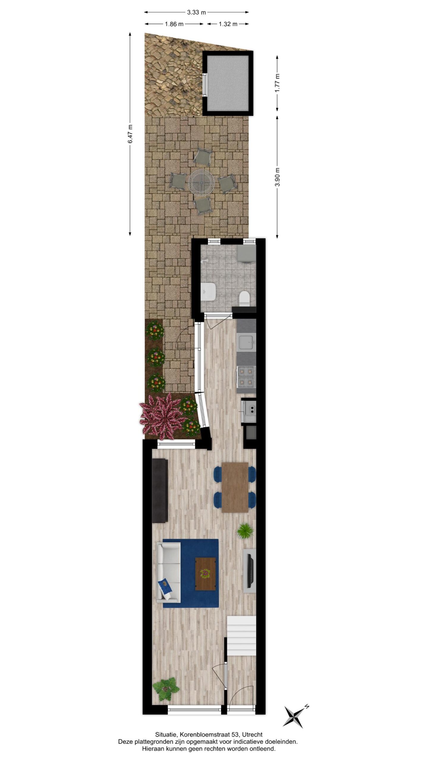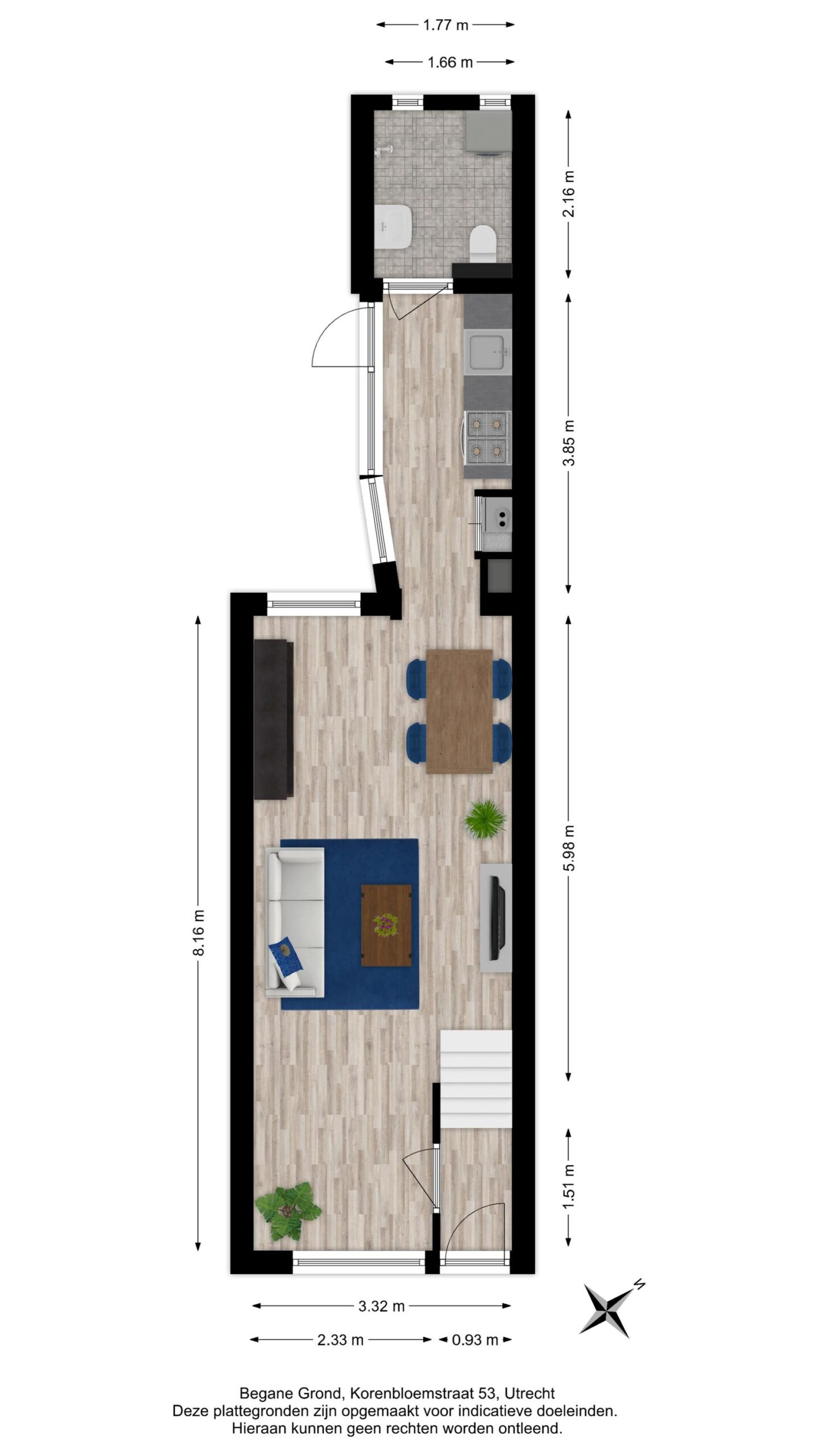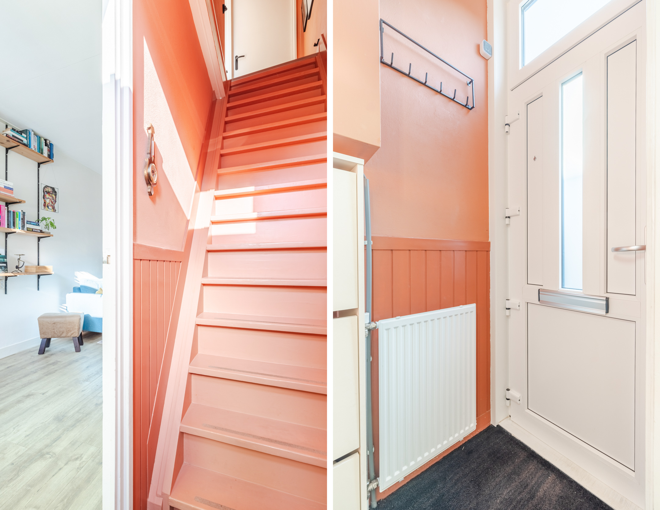 Bij binnenkomst tref je de kleurrijke entree met trapopgang naar de eerste verdieping, garderobe en doorgang naar de woonkamer. In de hal tref je ook de meterkast.