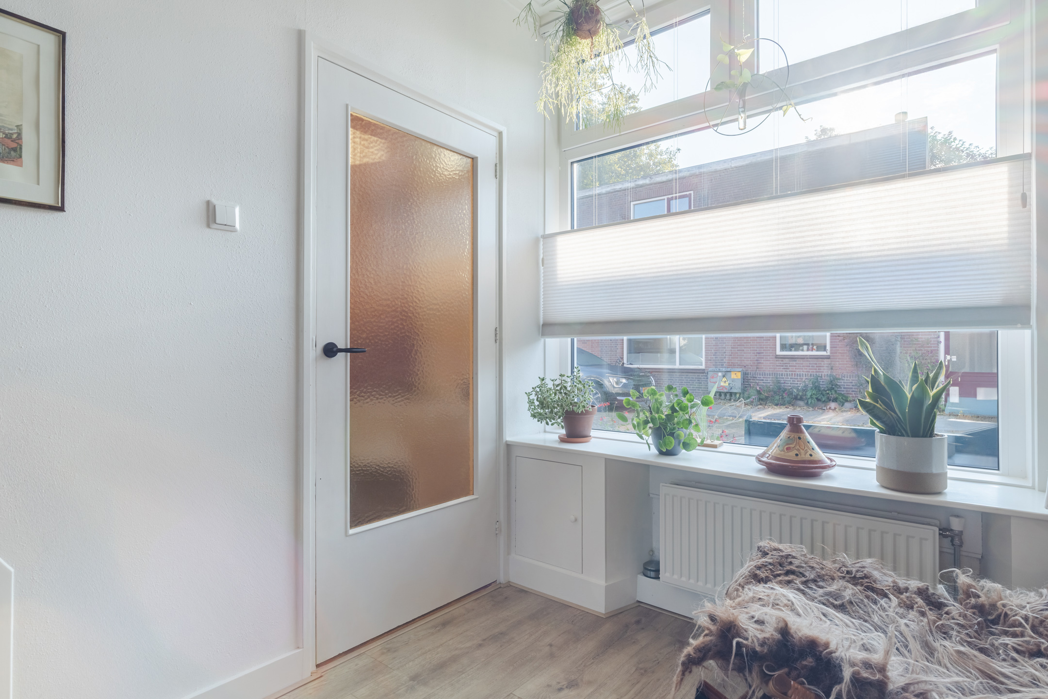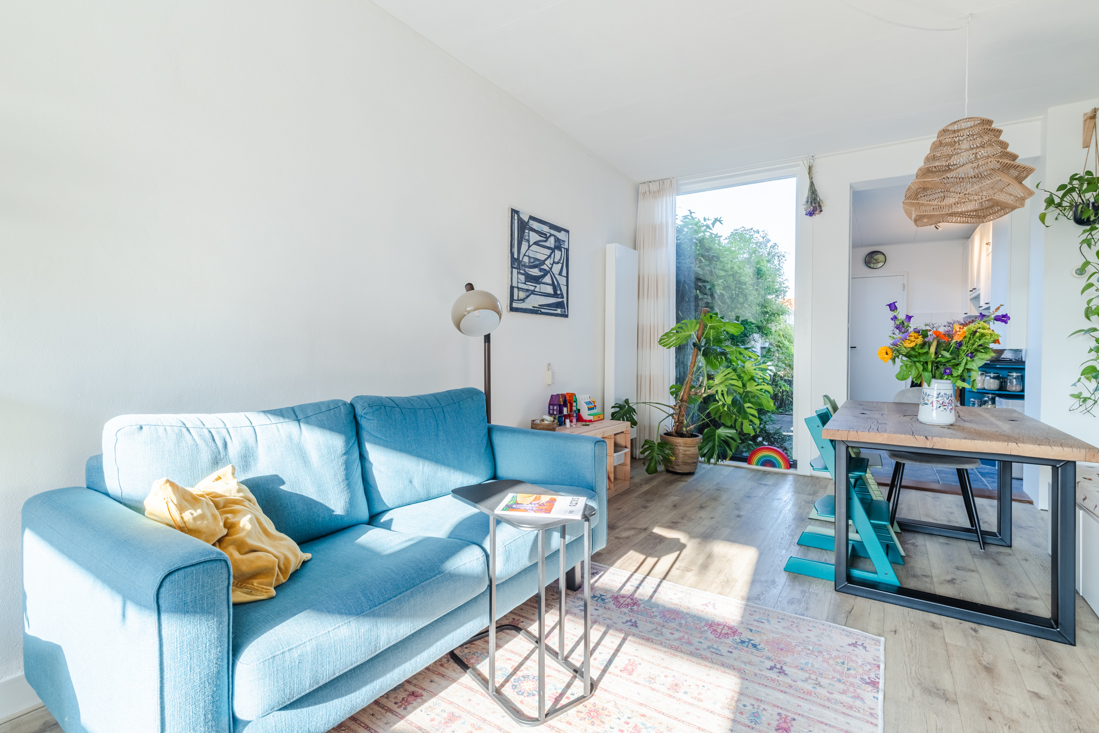 De woonkamer is zeer licht mede door de hoge plafonds en de mooie grote raampartijen aan de voorzijde en achterzijde van de woonlaag. De huidige eigenaren hebben flinke verduurzamende stappen gezet o.a. is de gehele achterpui in 2018 voorzien van nieuwe kozijnen met triple glas. In 2023 is de voorgevel van de woning voorzien van kunststof kozijnen. De woonkamer heeft een sfeervolle PVC-vloer en strak gestucte wanden.