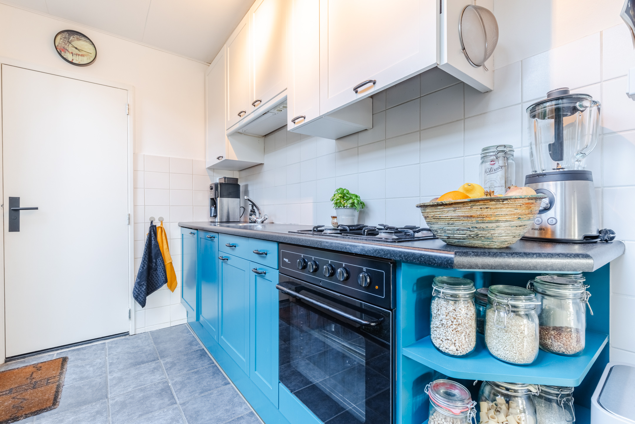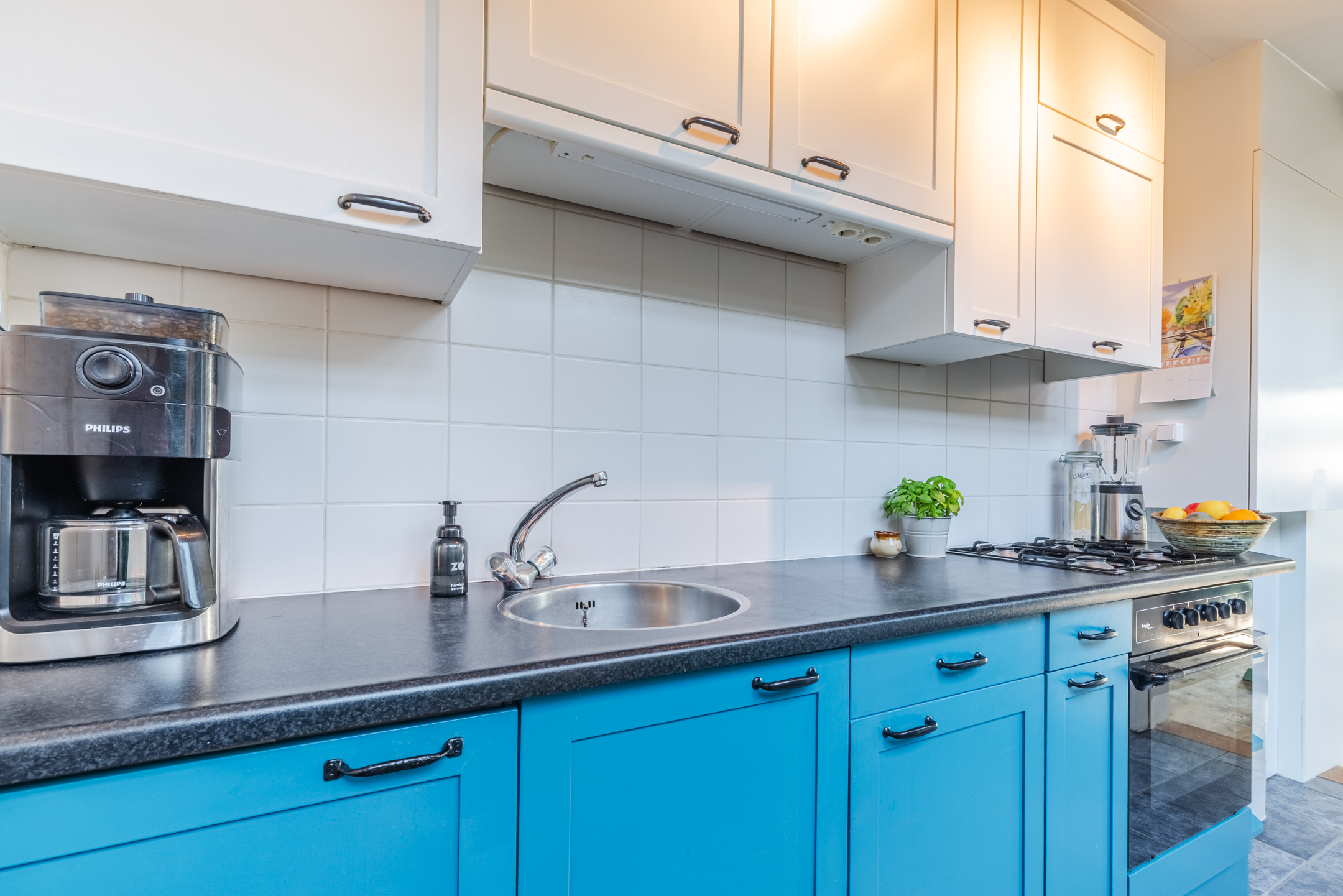 Vanuit de woonkamer stap je de keuken binnen waar kleur, licht en het praktische aspect samenkomen. De blauwe fronten geven de ruimte een karaktervolle uitstraling, perfect in balans gebracht door het donkere, robuuste kunststof werkblad. De witte bovenkasten zorgen voor een frisse tegenhanger en creëren een lichte, ruimtelijke sfeer. De keuken is voorzien van de nodige inbouwapparatuur o.a. elektrische oven, 4-pits gasfornuis, afzuiger en voldoende opbergruimte door de praktische bovenkastjes. Wat deze keuken écht bijzonder maakt, is de prettige lichtinval. Dankzij de grote ramen met triple glas wordt de ruimte overspoeld door natuurlijk daglicht en geniet je tegelijkertijd van een prachtig uitzicht op de groene tuin. De keuken is voorzien van een onderhoudsvriendelijke antraciet keramische tegelvloer.