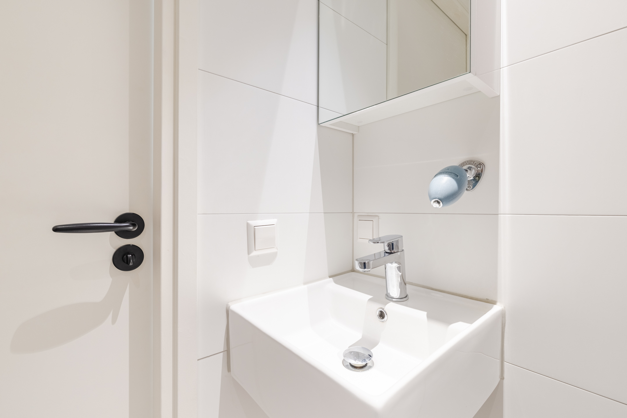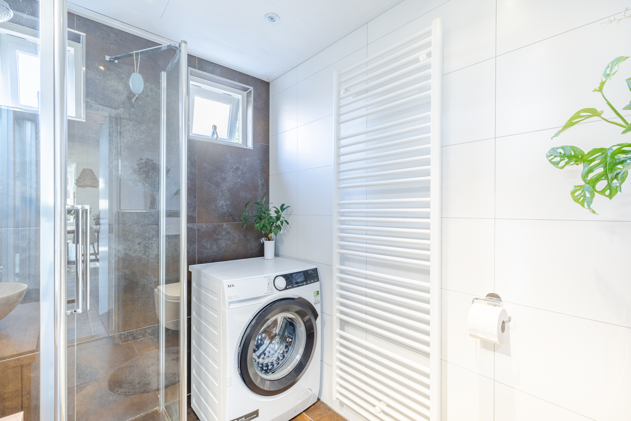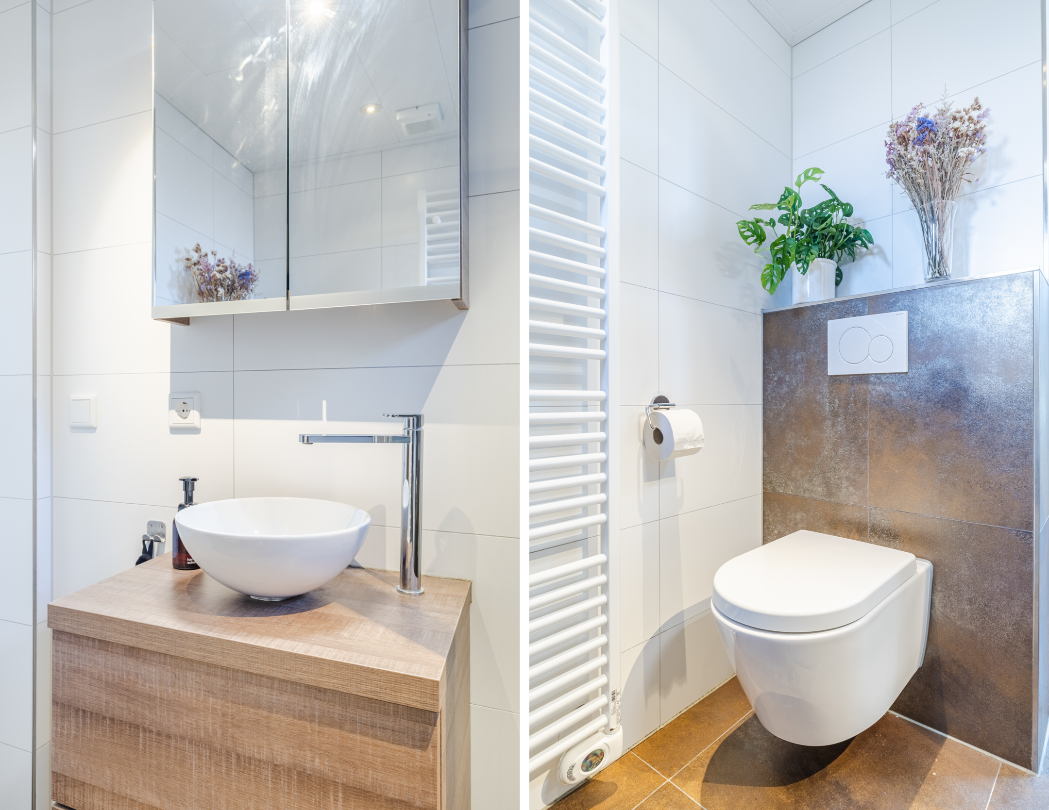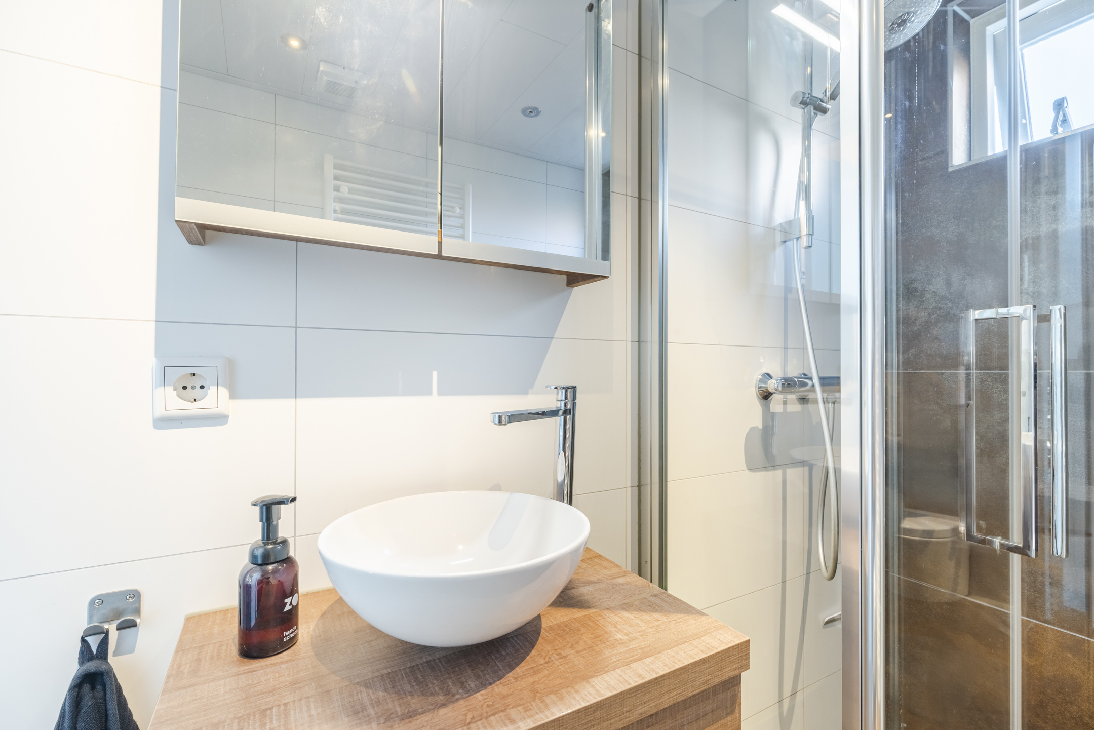 Vanuit de keuken is de badkamer te bereiken. De badkamer is voorzien van een wastafelmeubel met stijlvolle opzetkom, praktische spiegelkast, douchecabine, wasmachine aansluiting, toilet en een raam voor de nodige ventilatie en een fijne daglicht toetreding. De stijlvolle bruin- en antracietkleurige vloertegels geven de ruimte een warme en tijdloze basis, terwijl de strakke witte wandtegels zorgen voor een frisse en moderne uitstraling. In het plafond zijn spotjes verwerkt, die niet alleen voor een optimale verlichting zorgen, maar ook bijdragen aan de eigentijdse sfeer van de ruimte.