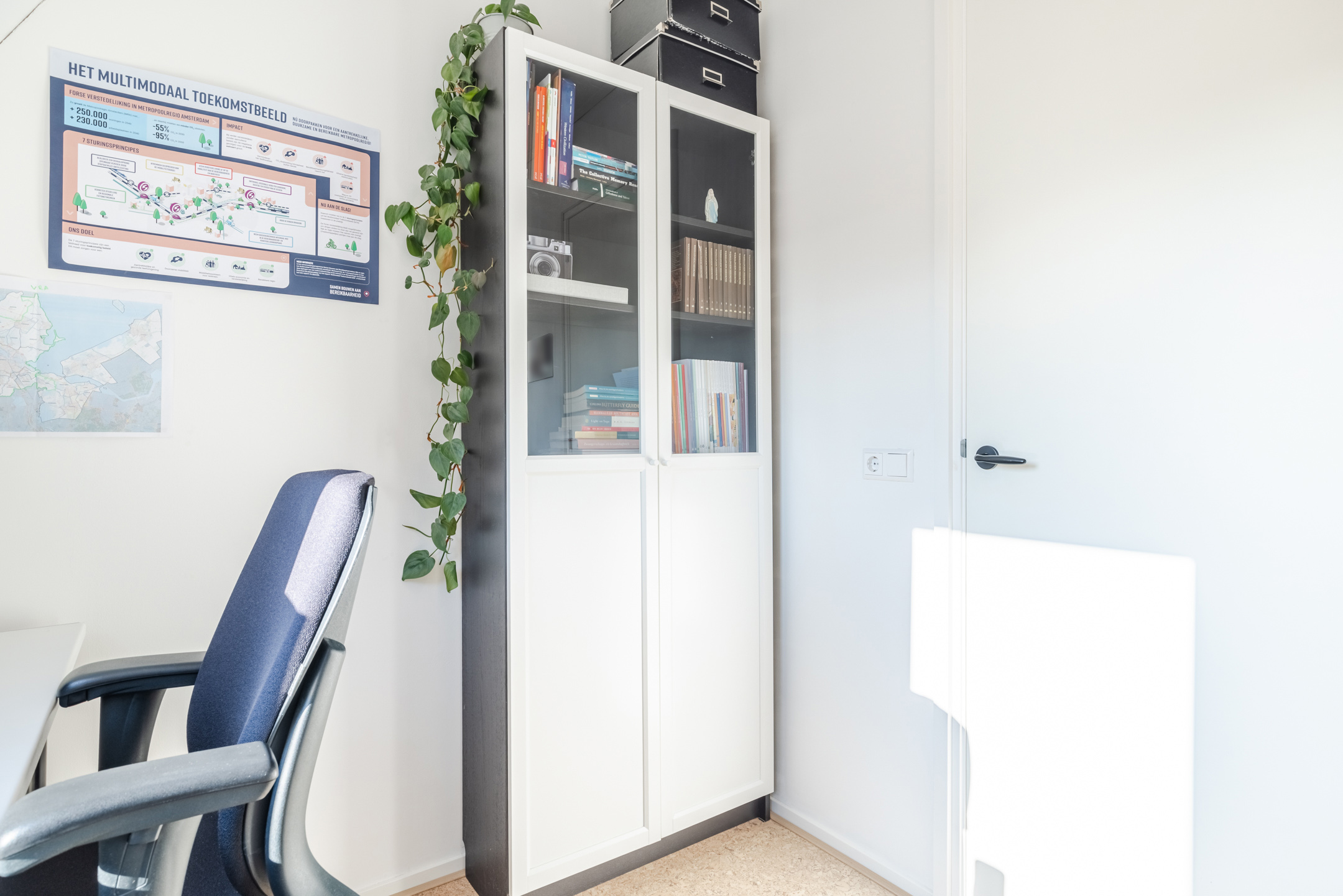 Vanaf de overloop is eveneens een inbouwkastje gesitueerd voor het optimaliseren van de opbergruimte. Naast de trapopgang naar de tweede verdieping zit een innovatief en praktisch luik waardoor het eenvoudiger is om meubels naar de tweede verdieping te verplaatsen.