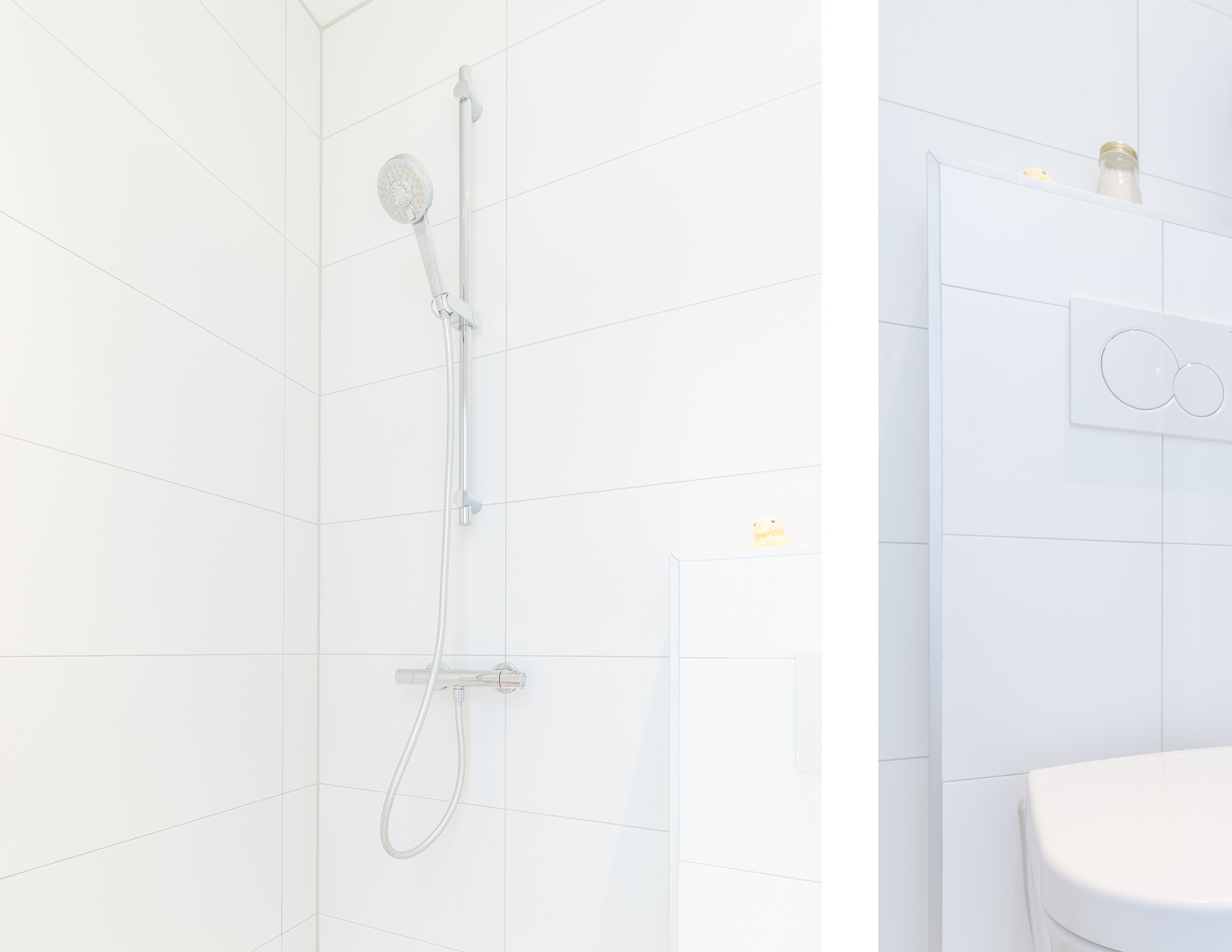 De badkamer is gesitueerd in het midden van de verdieping. Deze praktische ruimte is voorzien van douche, wastafel met spiegelkast en hangend toilet. De grote antracieten vloertegel is gecombineerd met een witte wandtegel en dit geeft de ruimte een moderne en tijdloze uitstraling.