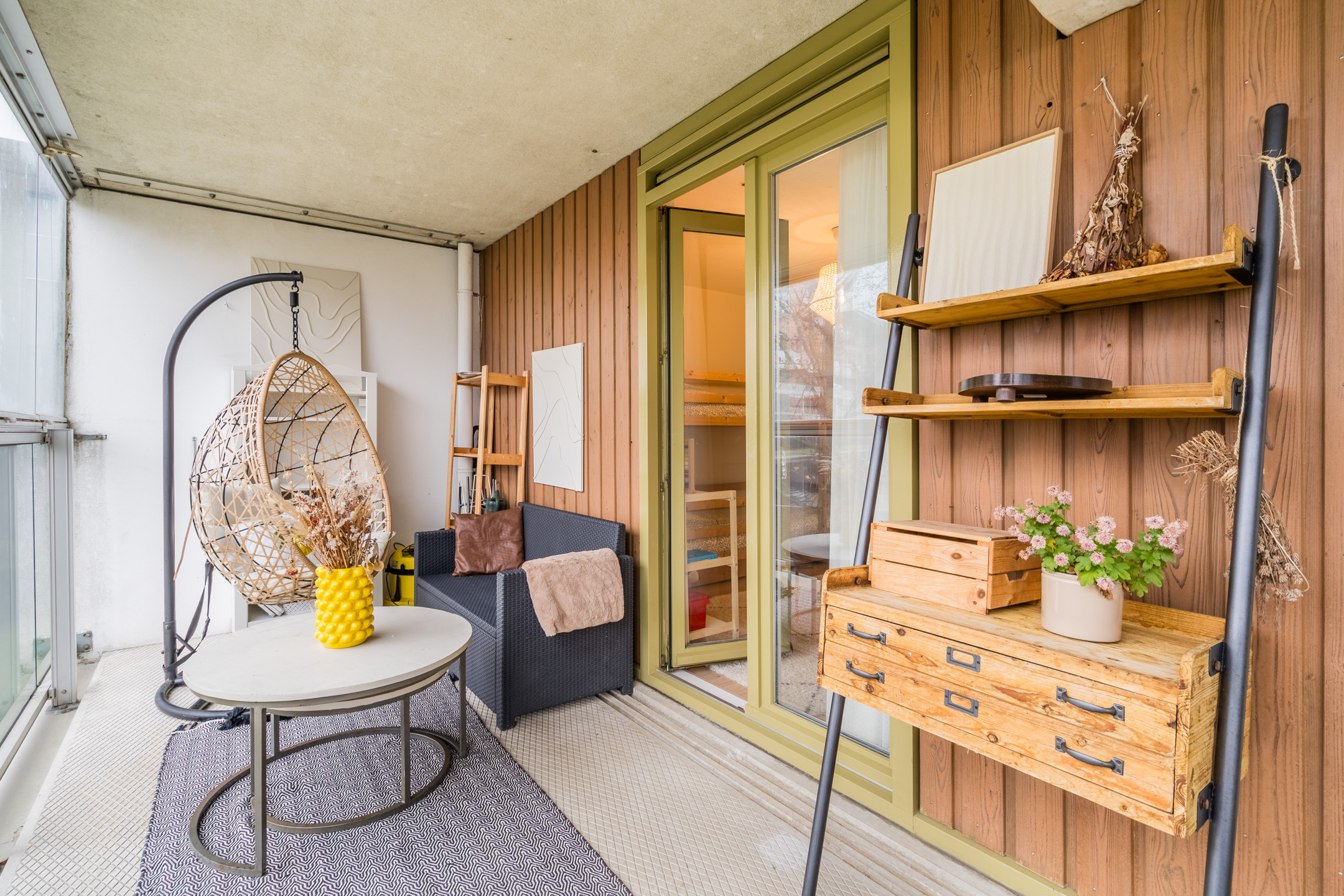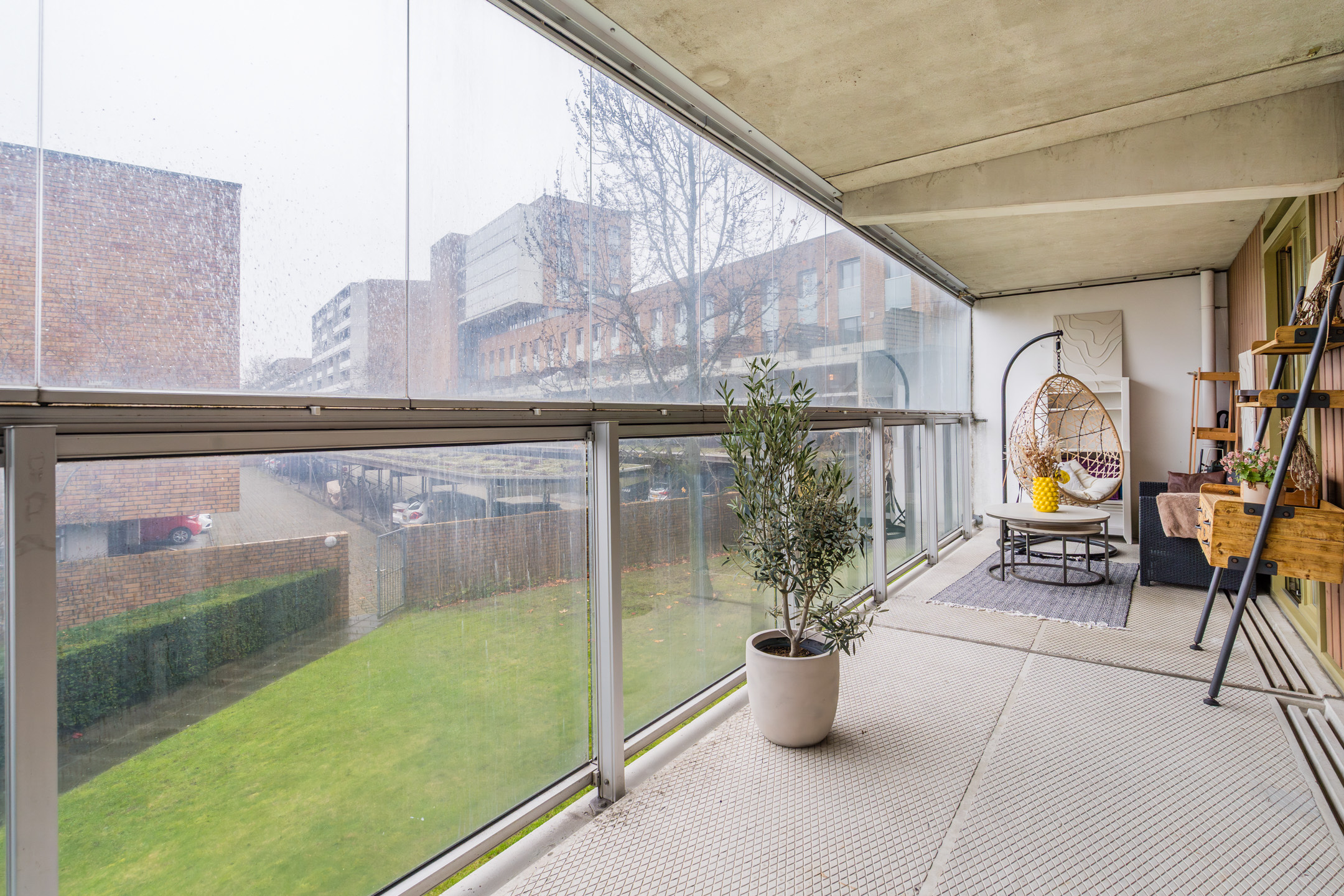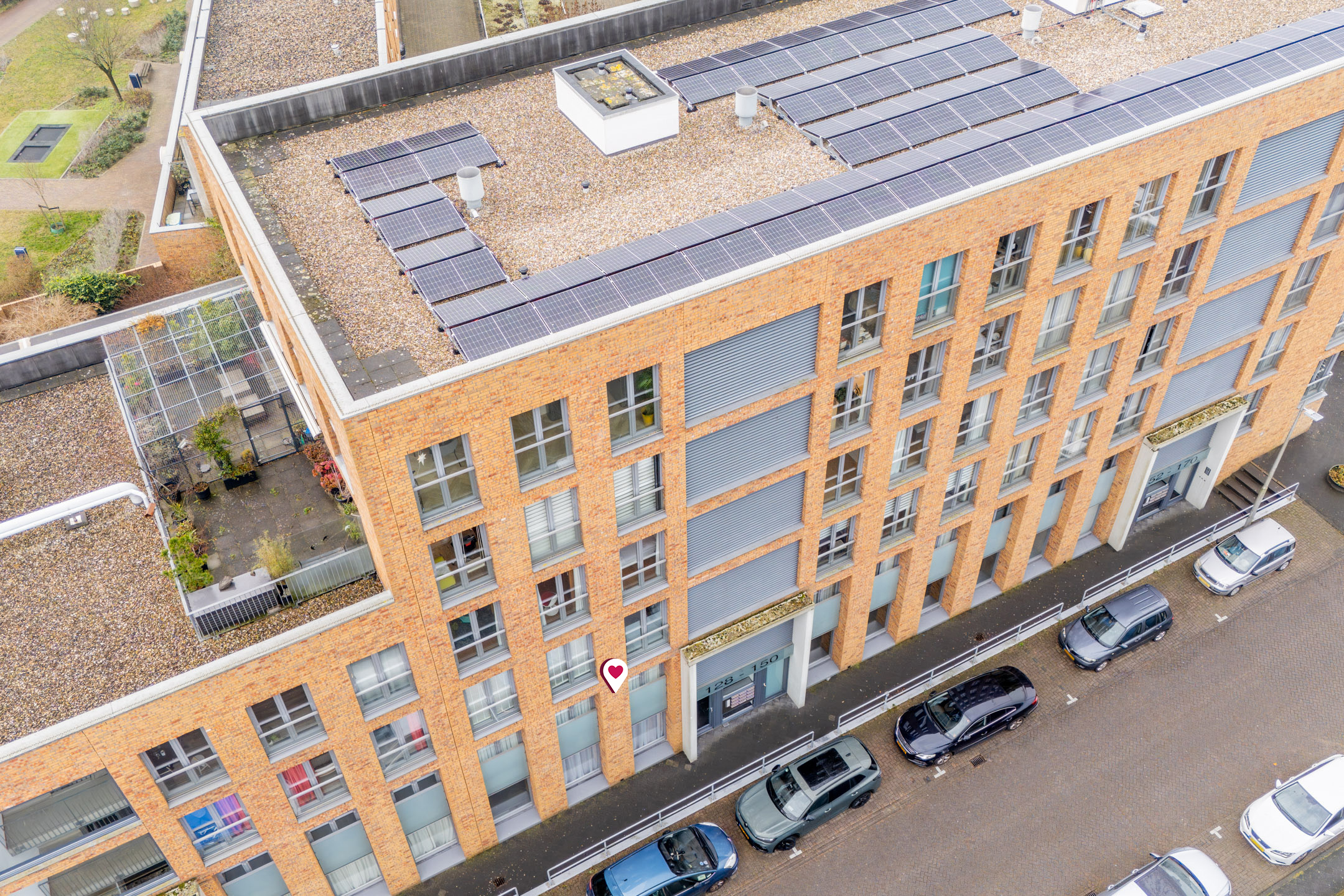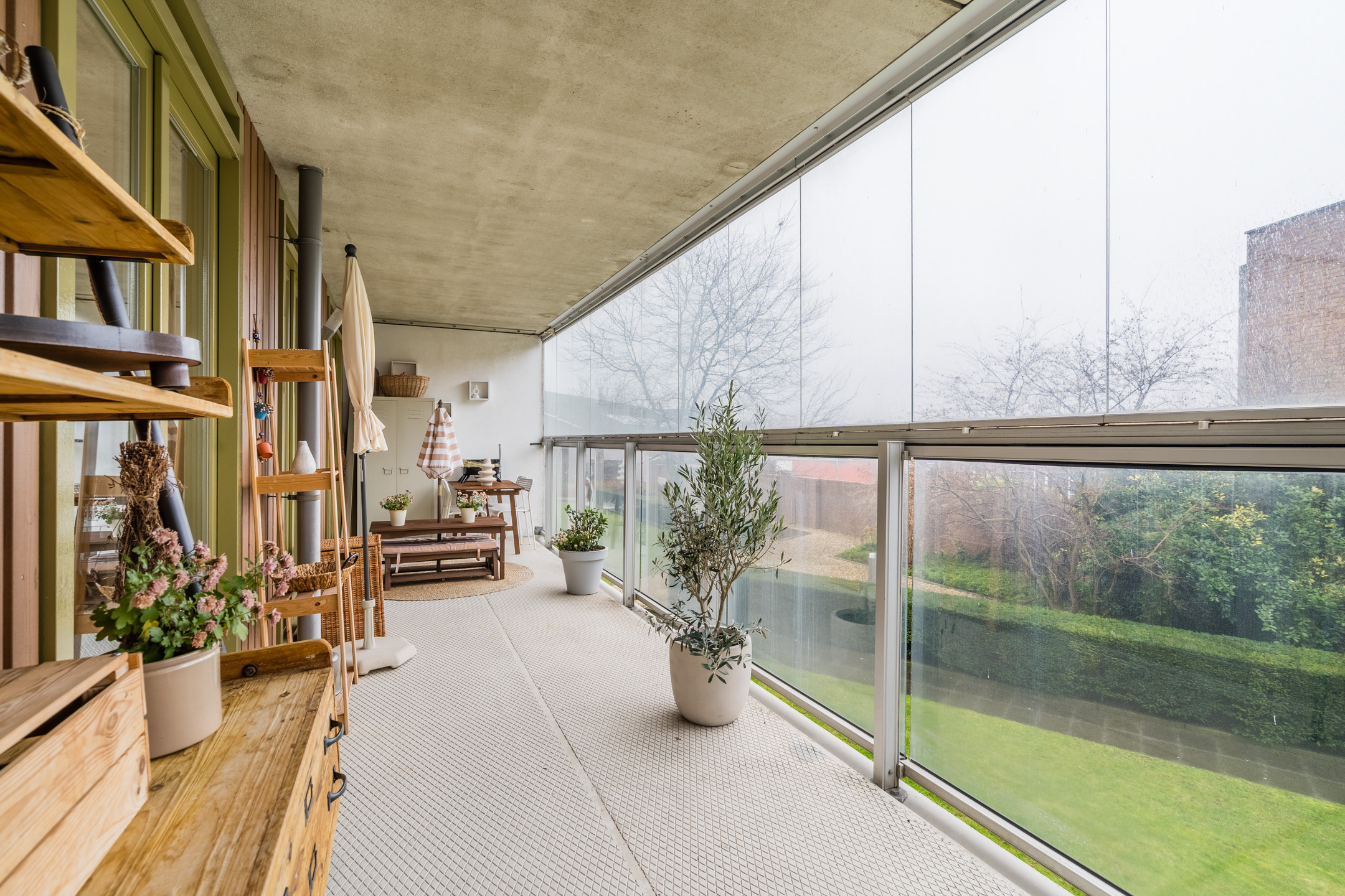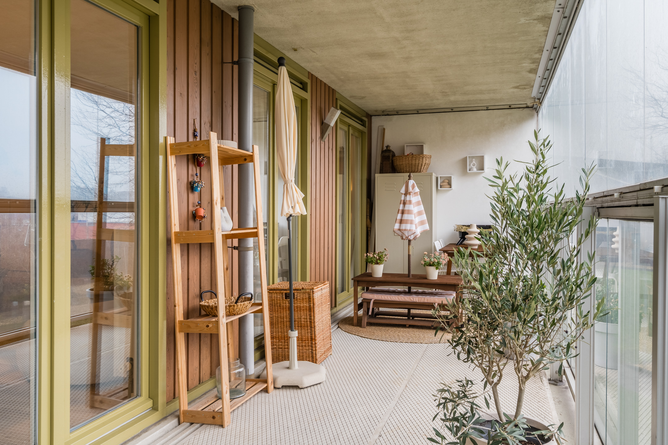 Het zonovergoten terras (type loggia, ca. 24 m2 ), gelegen op het zuidwesten, biedt vanaf de middag volop zonneschijn. Dankzij de royale maatvoering kun je op dit terras een mooie eettafel en bijvoorbeeld een grote loungeset plaatsen. Een heerlijke plek om, zowel in de warme als koudere maanden, te genieten van de rust en ruimte.