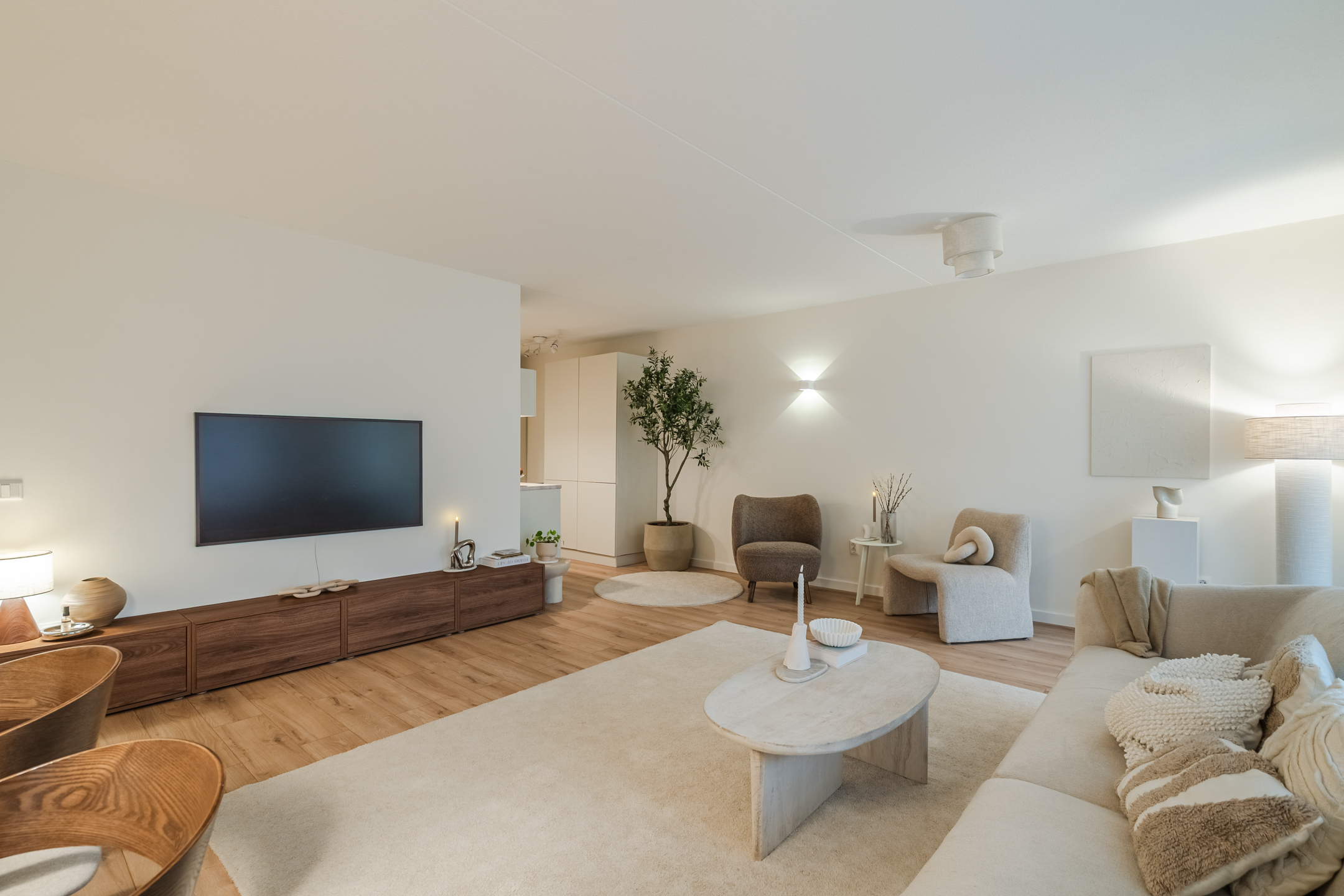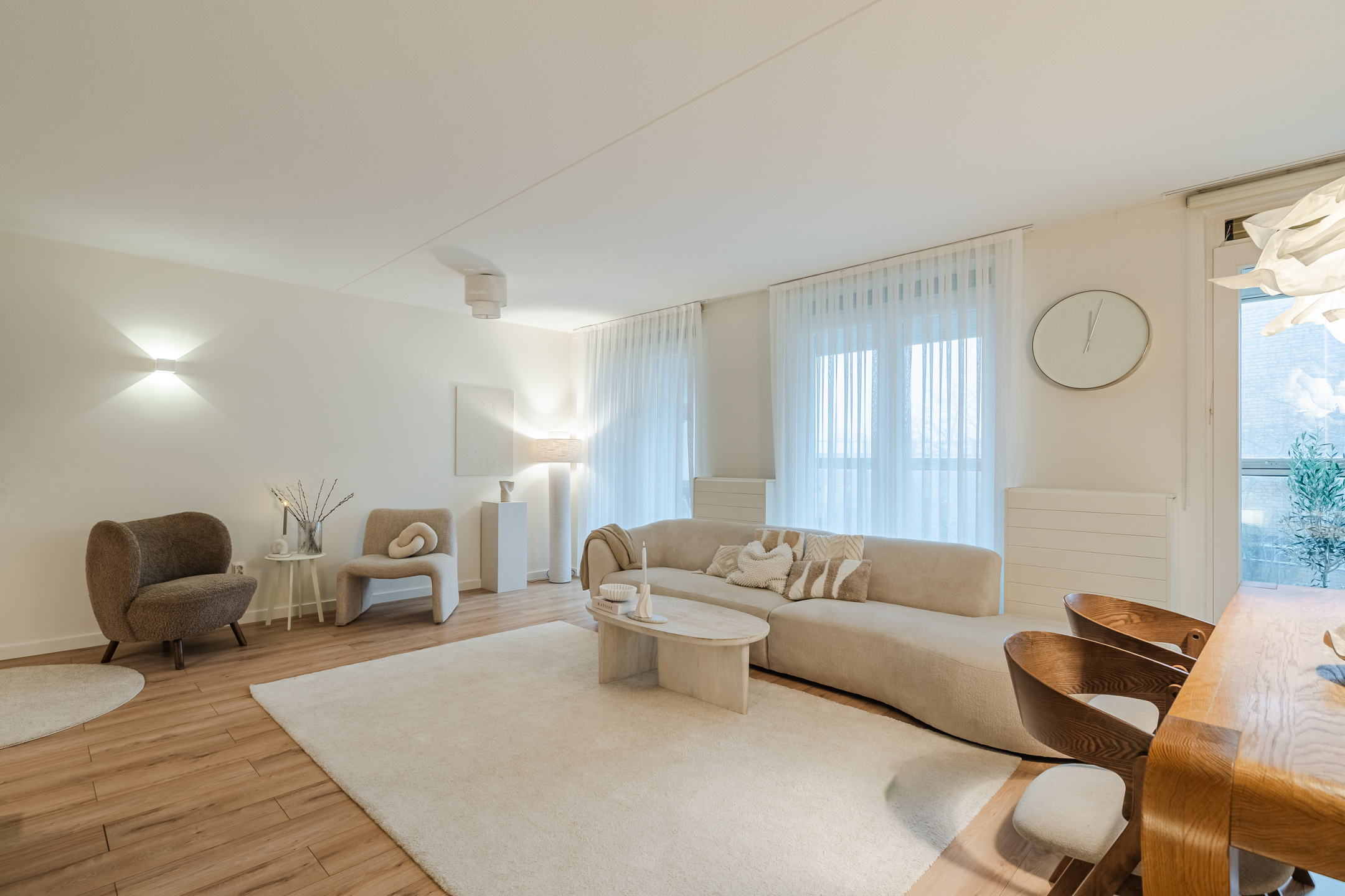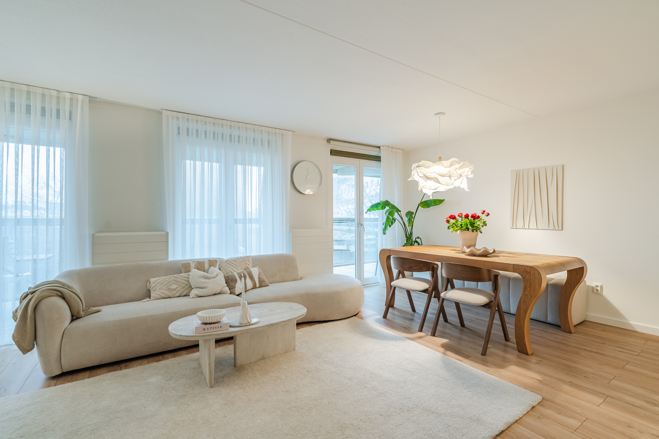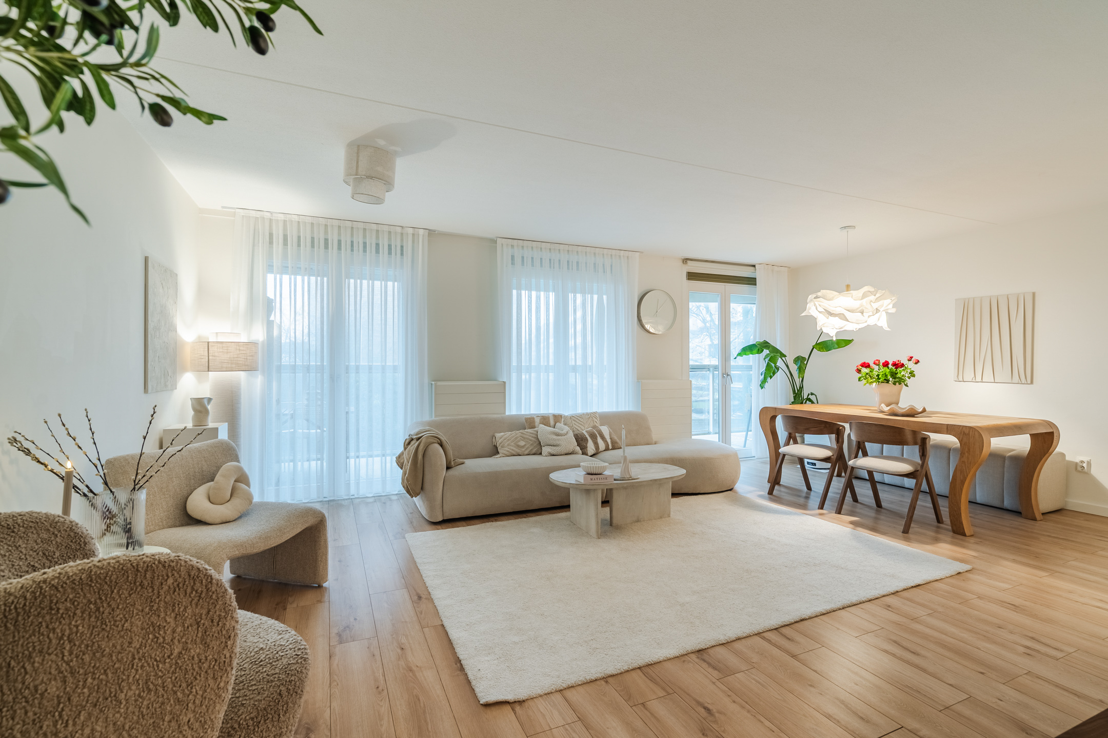 De sfeervolle woonkamer is gelegen aan de achterzijde van het appartement en voelt dankzij de grote raampartijen heerlijk licht en ruim aan. De ruimte is gezellig en stijlvol ingericht en biedt voldoende plaats voor een comfortabele zit- en eethoek. Via de openslaande deuren bereik je het heerlijke zonnige en riante terras.