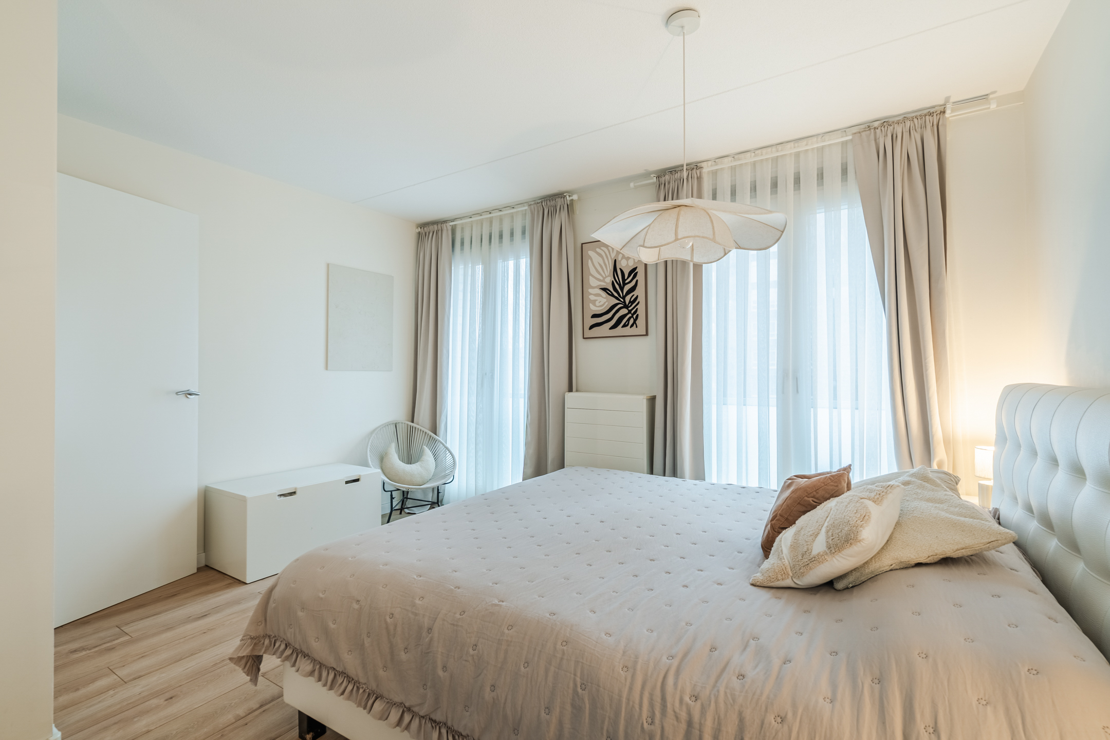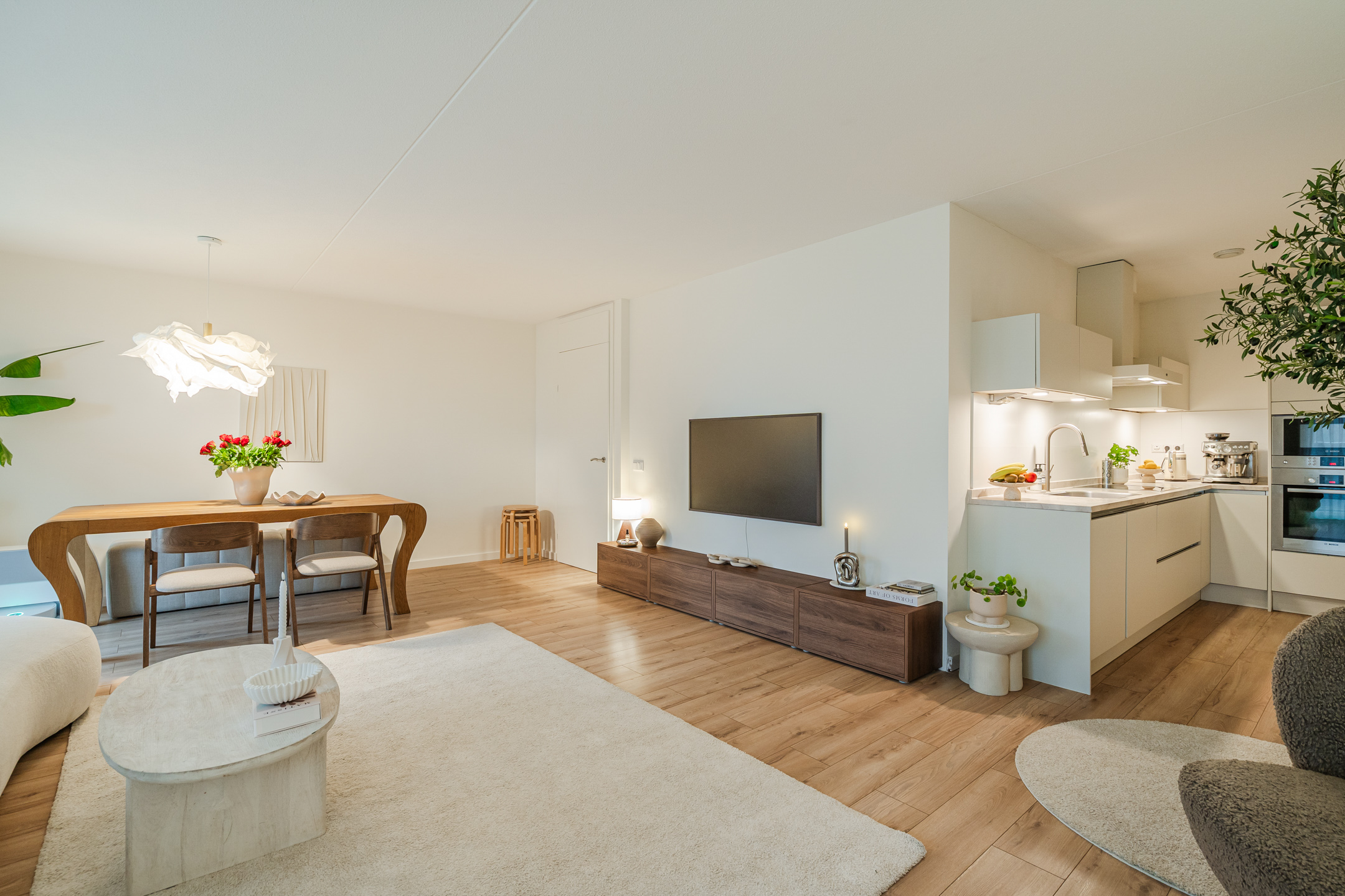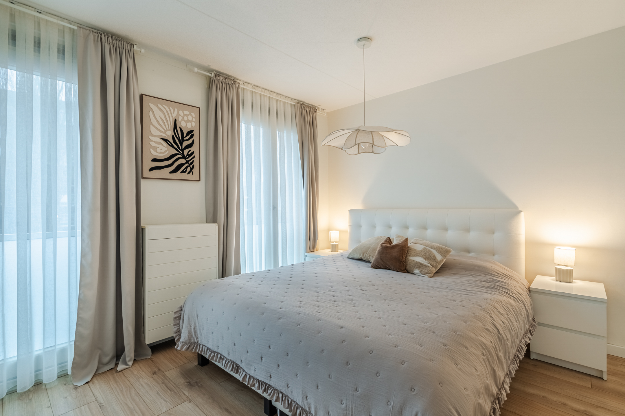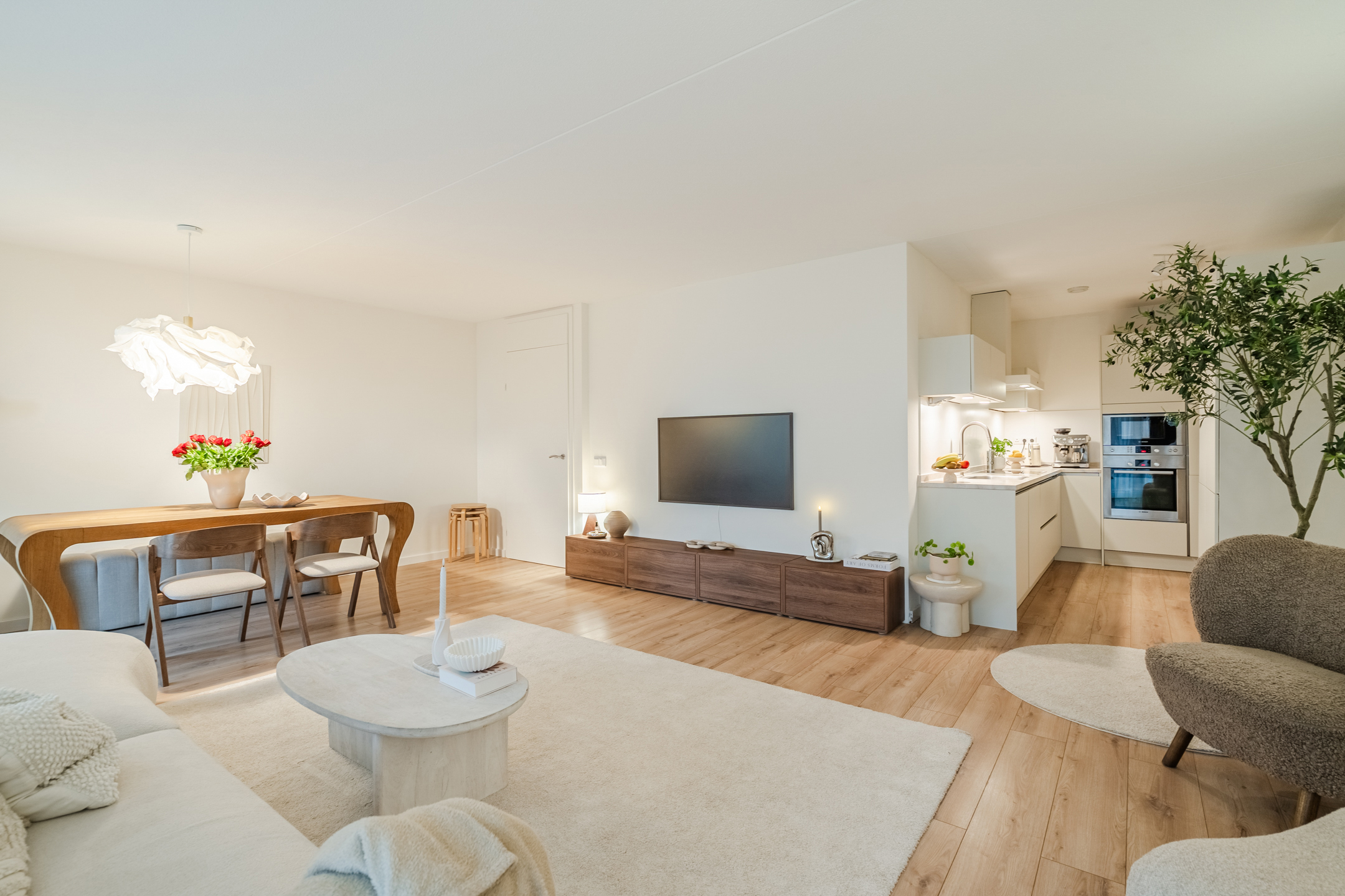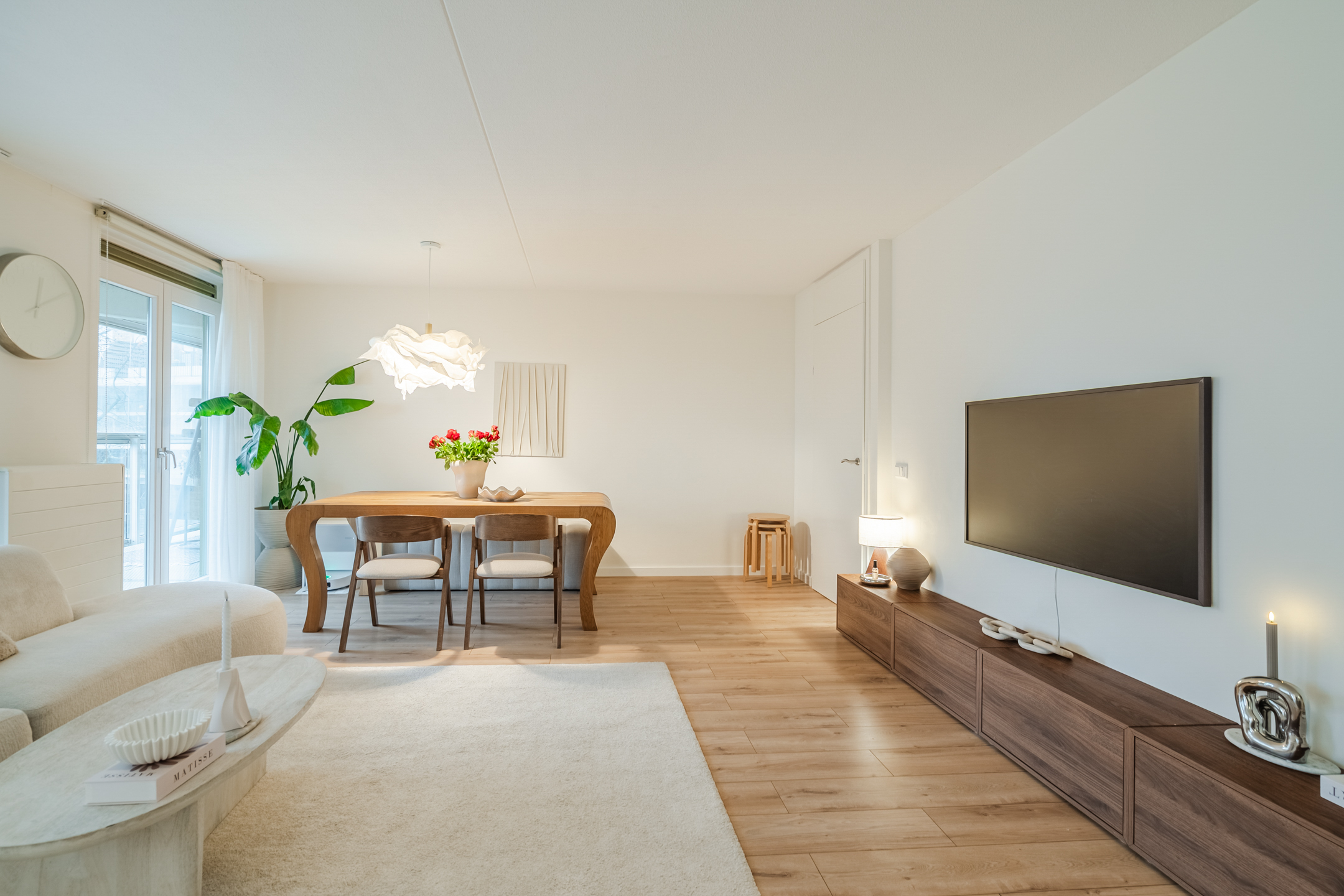 De sfeervolle woonkamer is gelegen aan de achterzijde van het appartement en voelt dankzij de grote raampartijen heerlijk licht en ruim aan. De ruimte is gezellig en stijlvol ingericht en biedt voldoende plaats voor een comfortabele zit- en eethoek. Via de openslaande deuren bereik je het heerlijke zonnige en riante terras.