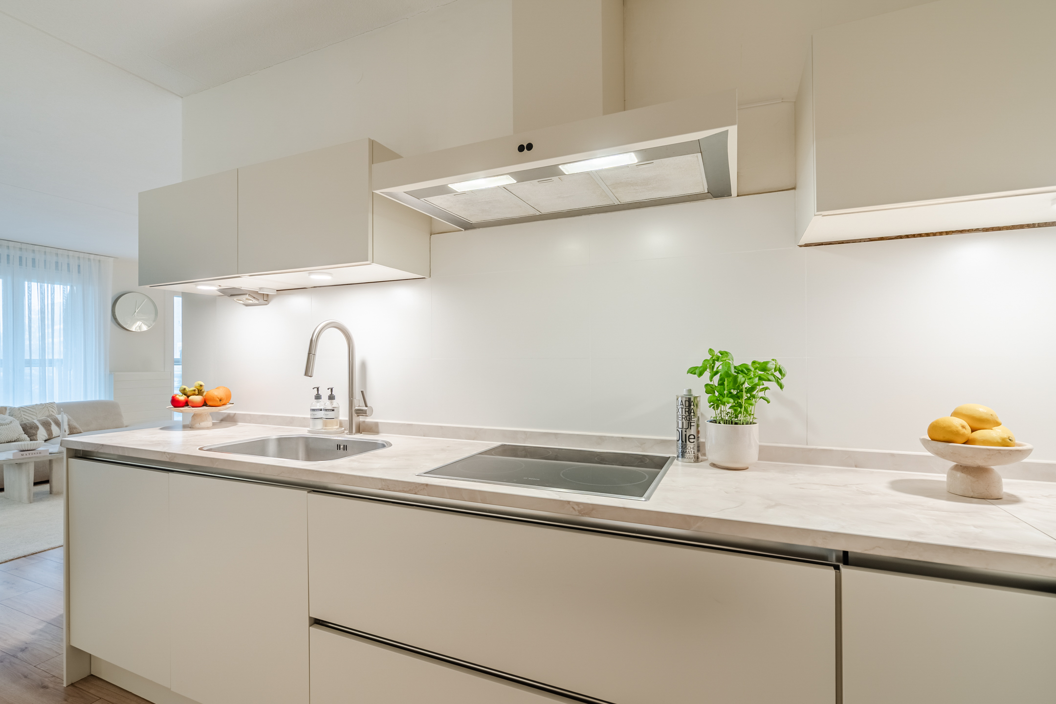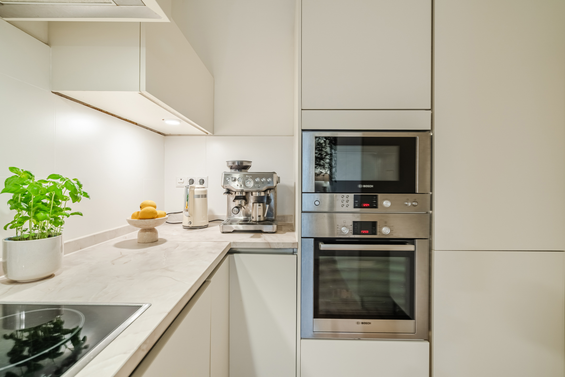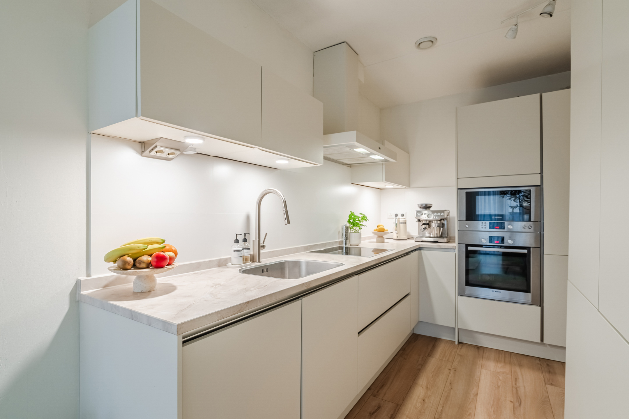 Verder is het appartement voorzien van een complete, moderne en luxe keuken. De keuken is geplaatst in een L-opstelling, uitgevoerd in een gebroken witte kleurstelling met een granieten beige marmerlook werkblad en voorzien van alle wenselijke inbouwapparatuur, waaronder een inductiekookplaat, een oven, een koel-/vriescombinatie en een magnetron. Dankzij de bovenkasten, voorraadkast en praktische carrouselkast is er volop opbergruimte aanwezig.