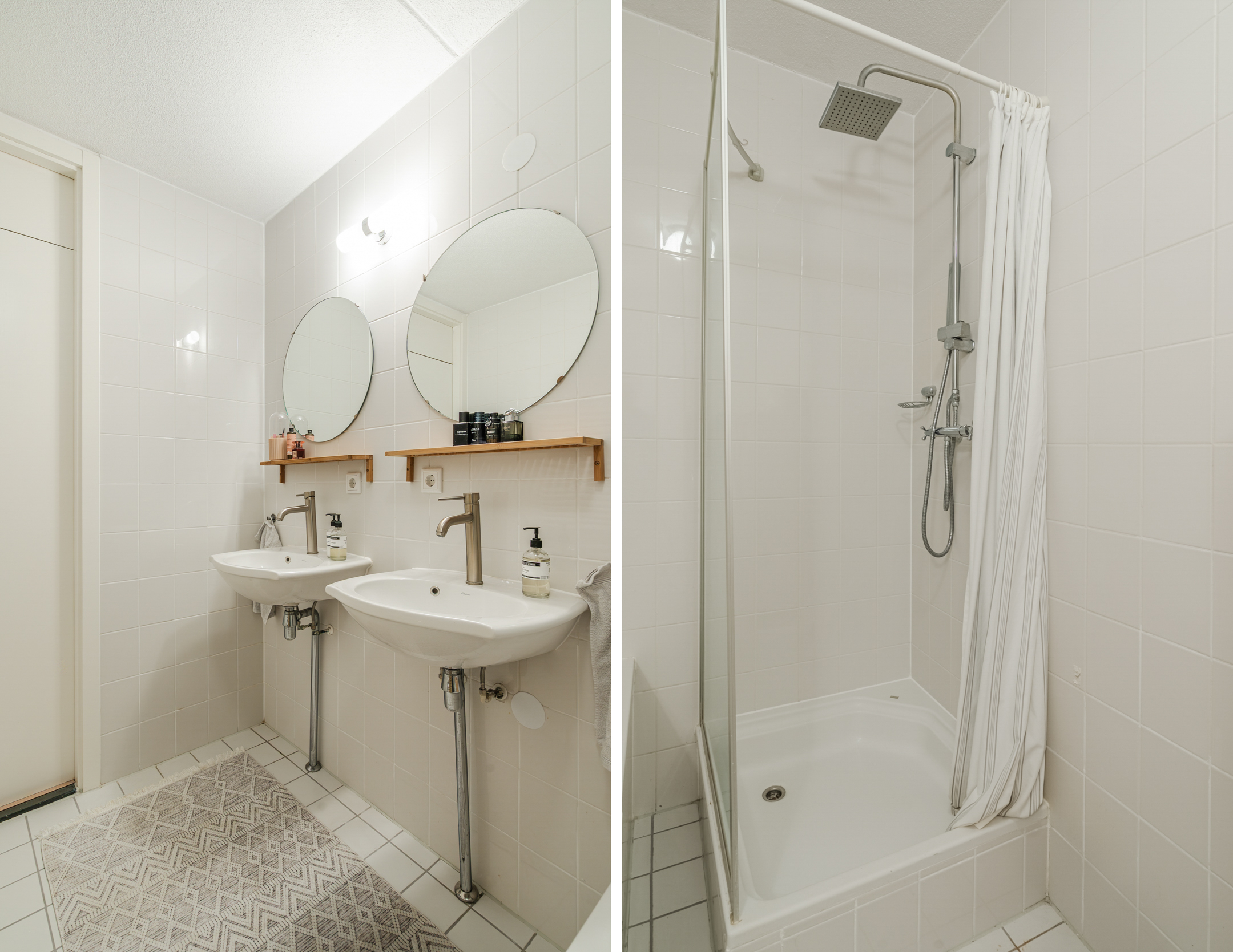 De inpandige badkamer is uitgevoerd in een gebroken wit en grijze kleurstelling. De badkamer is voorzien van een douchecabine, een ligbad, twee wastafels en mechanische ventilatie. In de hal bevindt zich tevens een praktische bergkast met de opstelplaats voor de wasmachine en droger.