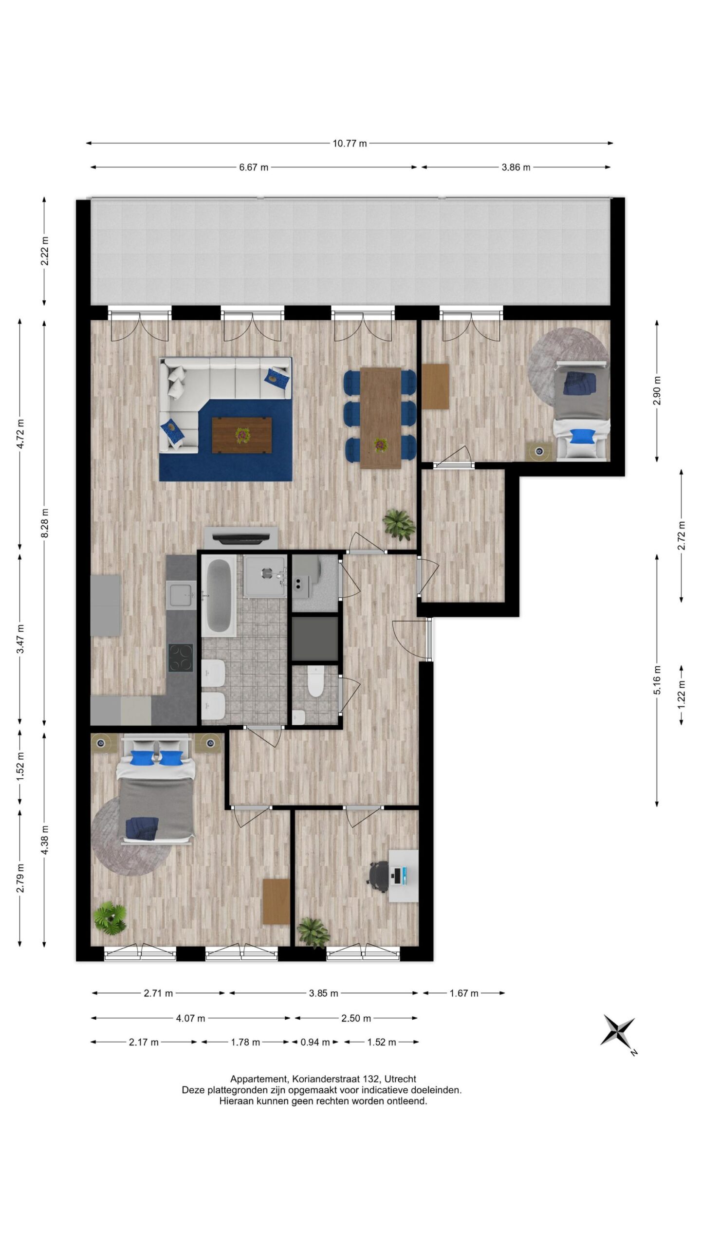 Via de hal zijn de 3 volwaardige en multifunctionele (slaap)kamers en inpandige badkamer bereikbaar. Eén van de slaapkamers bevindt zich aan de achterzijde van het appartement, direct naast de woonkamer. Het muurtje tussen deze slaapkamer en de woonkamer kan desgewenst worden verwijderd, waardoor een extra grote woonkamer gecreëerd kan worden.