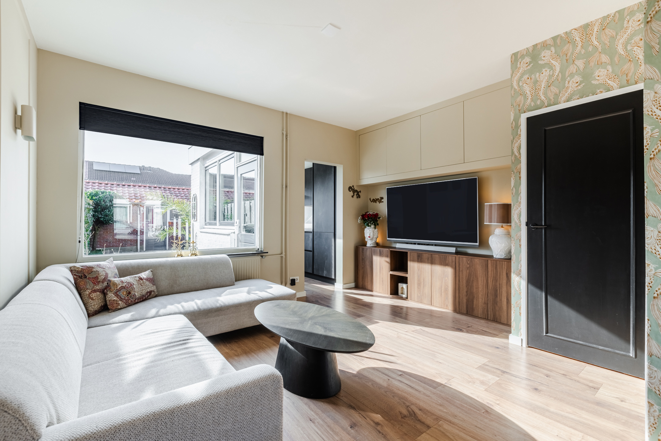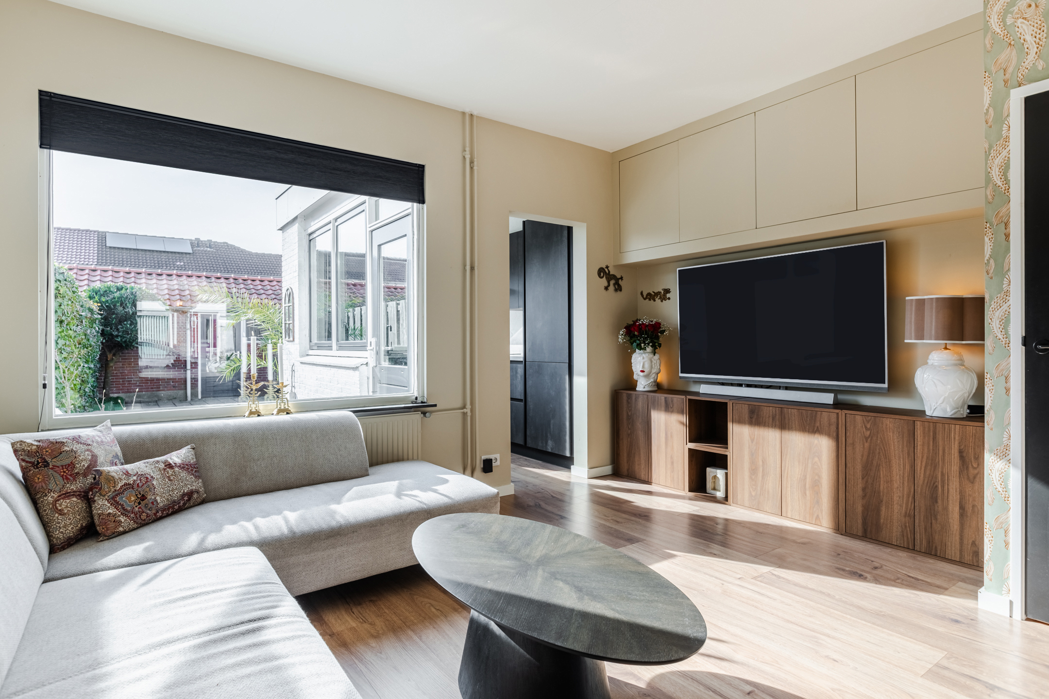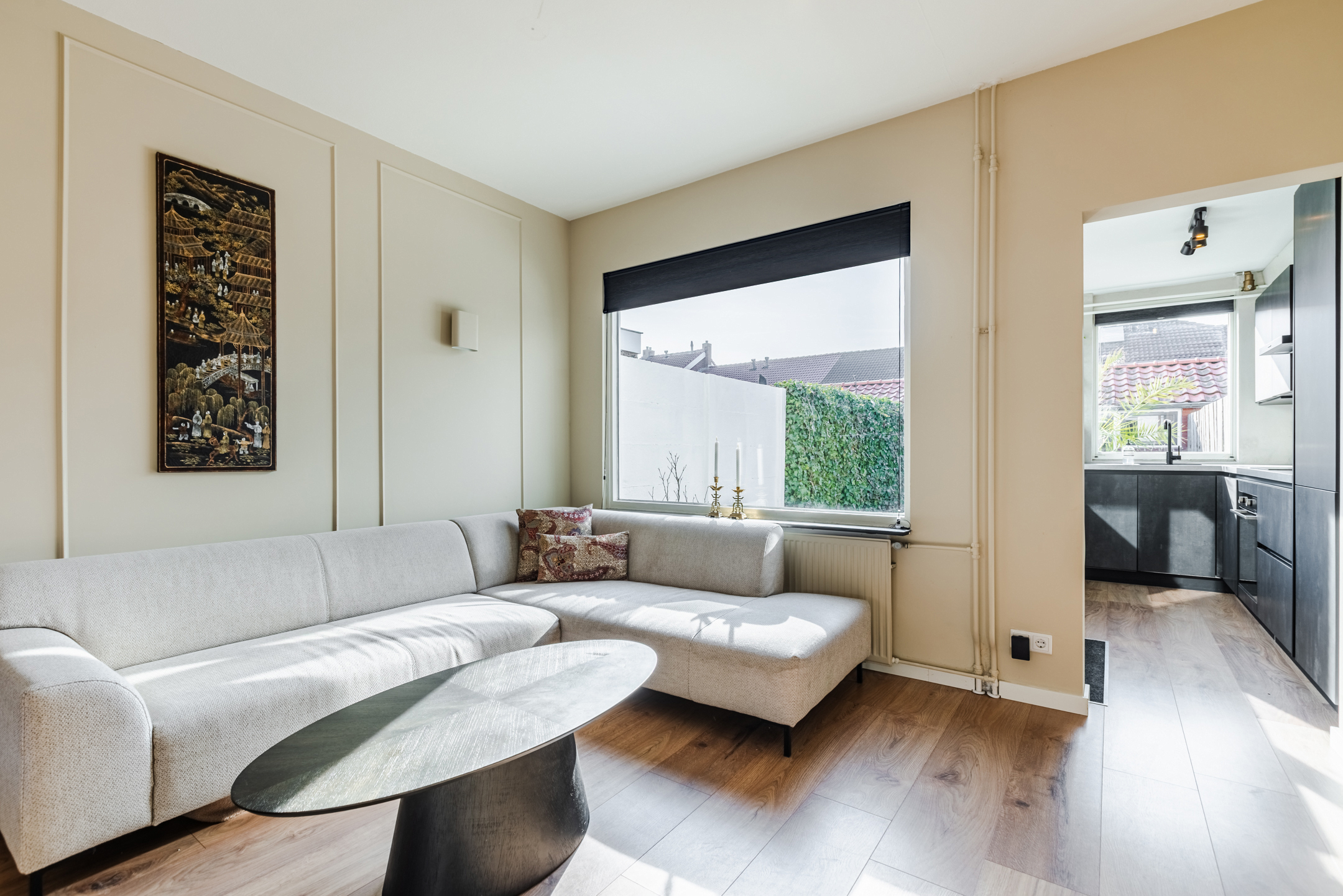 De woonkamer bevindt zich aan de achterzijde van de woning. Dankzij de prettige indeling en de directe verbinding met de tuin is dit een fijne leefruimte met een warme en huiselijke sfeer. De strakke wand- en plafondafwerking in combinatie met de sfeervolle laminaatvloer zorgt voor een verzorgde en instapklare uitstraling.